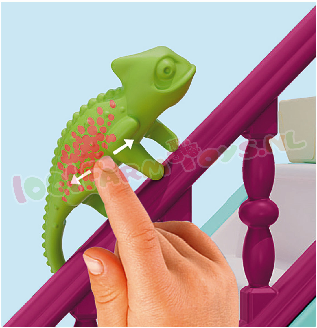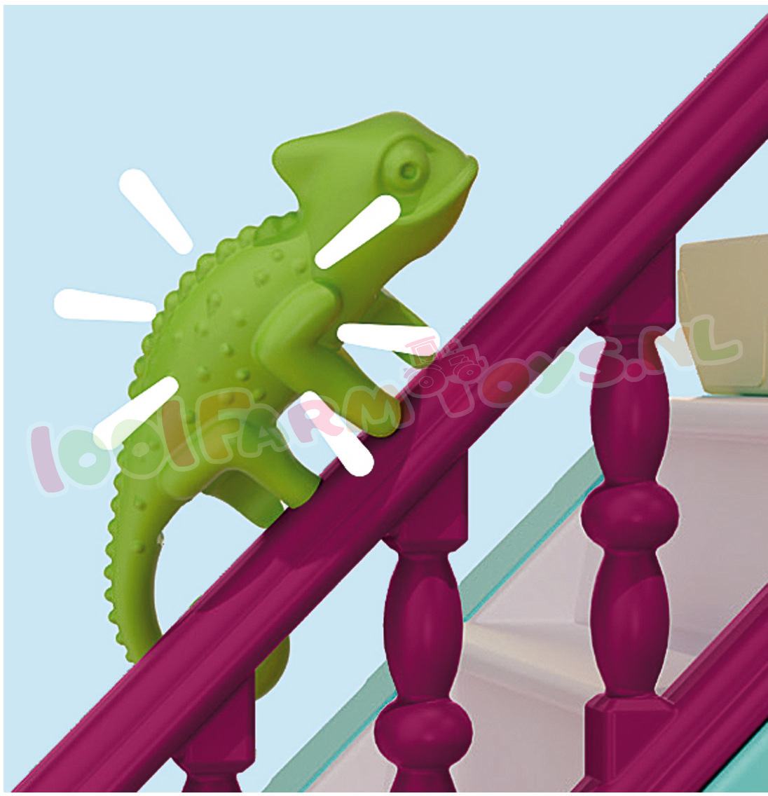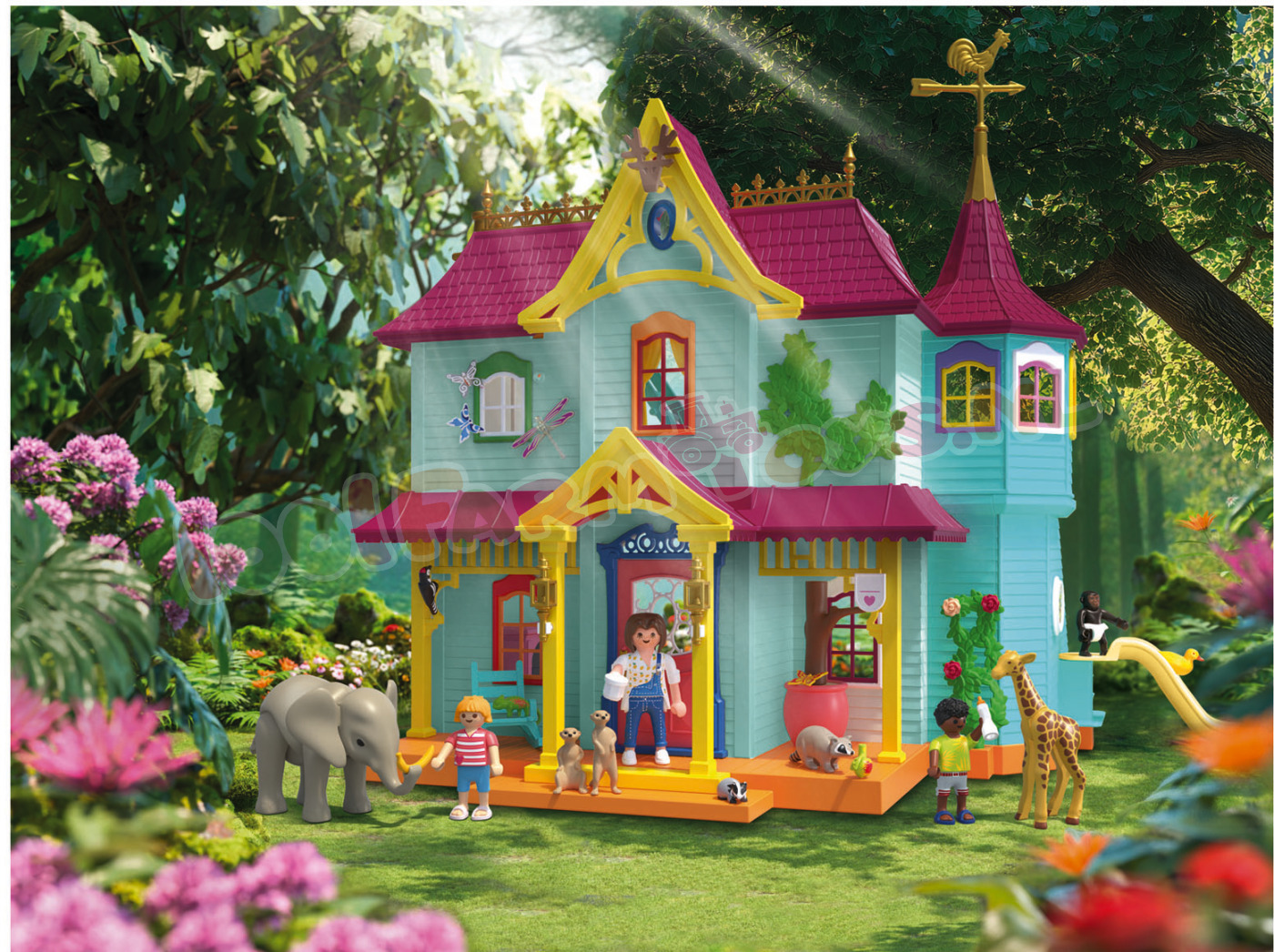 Welkom in de kleurrijke wereld van Animals & Friends – waar het wonderbaarlijke tot het dagelijks leven behoort en de fantasie geen grenzen kent. De kleurrijke. vrolijke villa is het middelpunt van het leven van de dierenvriendin met haar twee kinderen en de lieve dieren die bij hen wonen. Hier heeft iedereen veel plezier en kan iedereen altijd op elkaar rekenen. De kleine olifant helpt ijverig met het dekken van de tafel. terwijl de babygiraffe stiekem lekkernijen uit het hele huis jat. De wasberen ravotten op zolder. de babycheetah vindt schommelen geweldig en het aapje klimt en relaxen het liefst in de boom die vanuit de veranda het huis is ingegroeid. Zoek je het kleine eendje? Dat vermaakt zich prima in de vijver in de kamer. terwijl de stokstaartjes hun favoriete plekje hebben gevonden in hun geheime schuilplaats onder de indrukwekkende trap aan de voorkant. De meest gewilde plek in het hele huis is echter de knusse grot met bed achteraan onder de trap.
