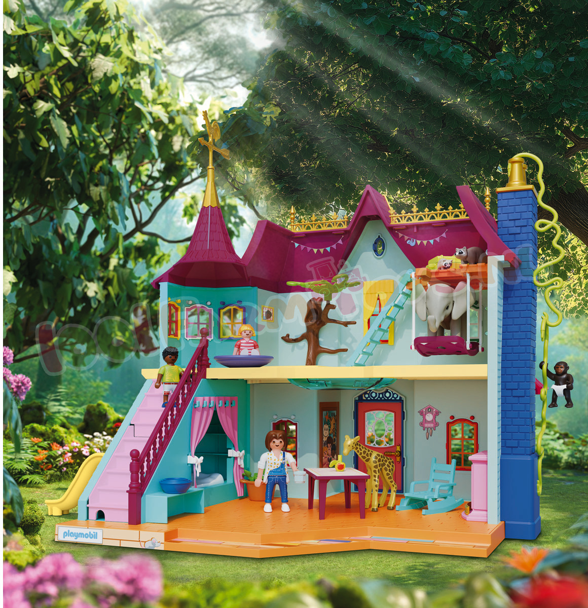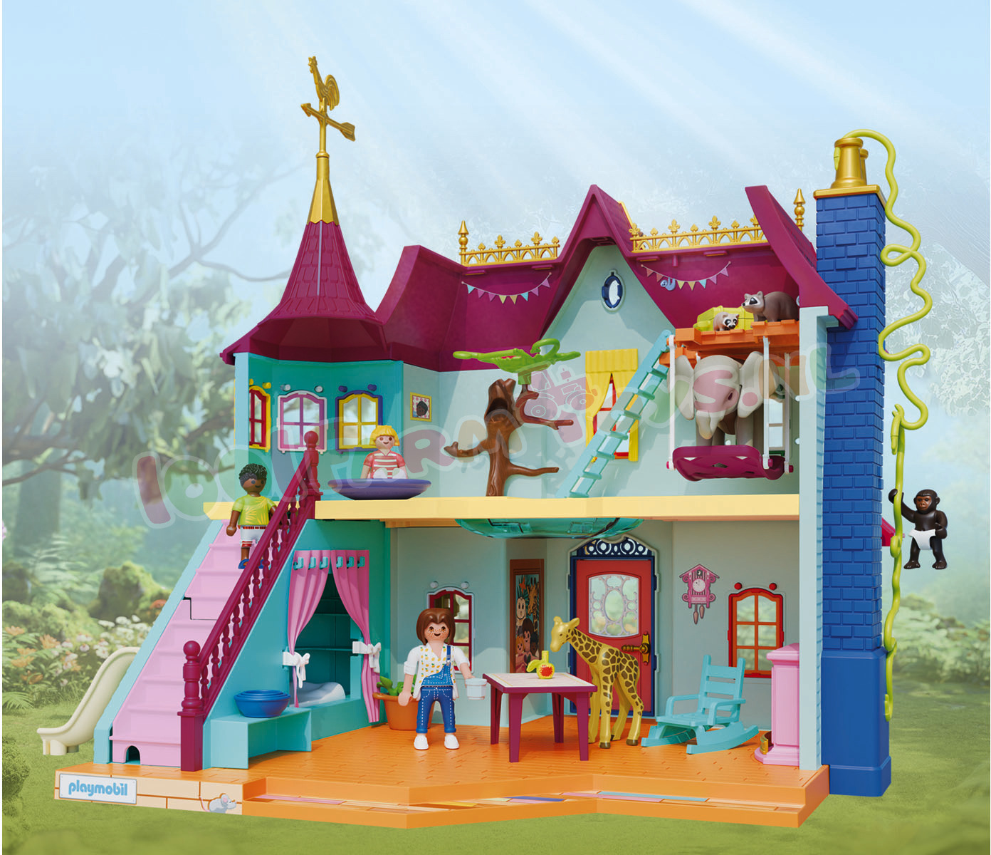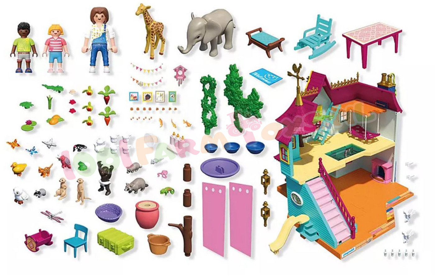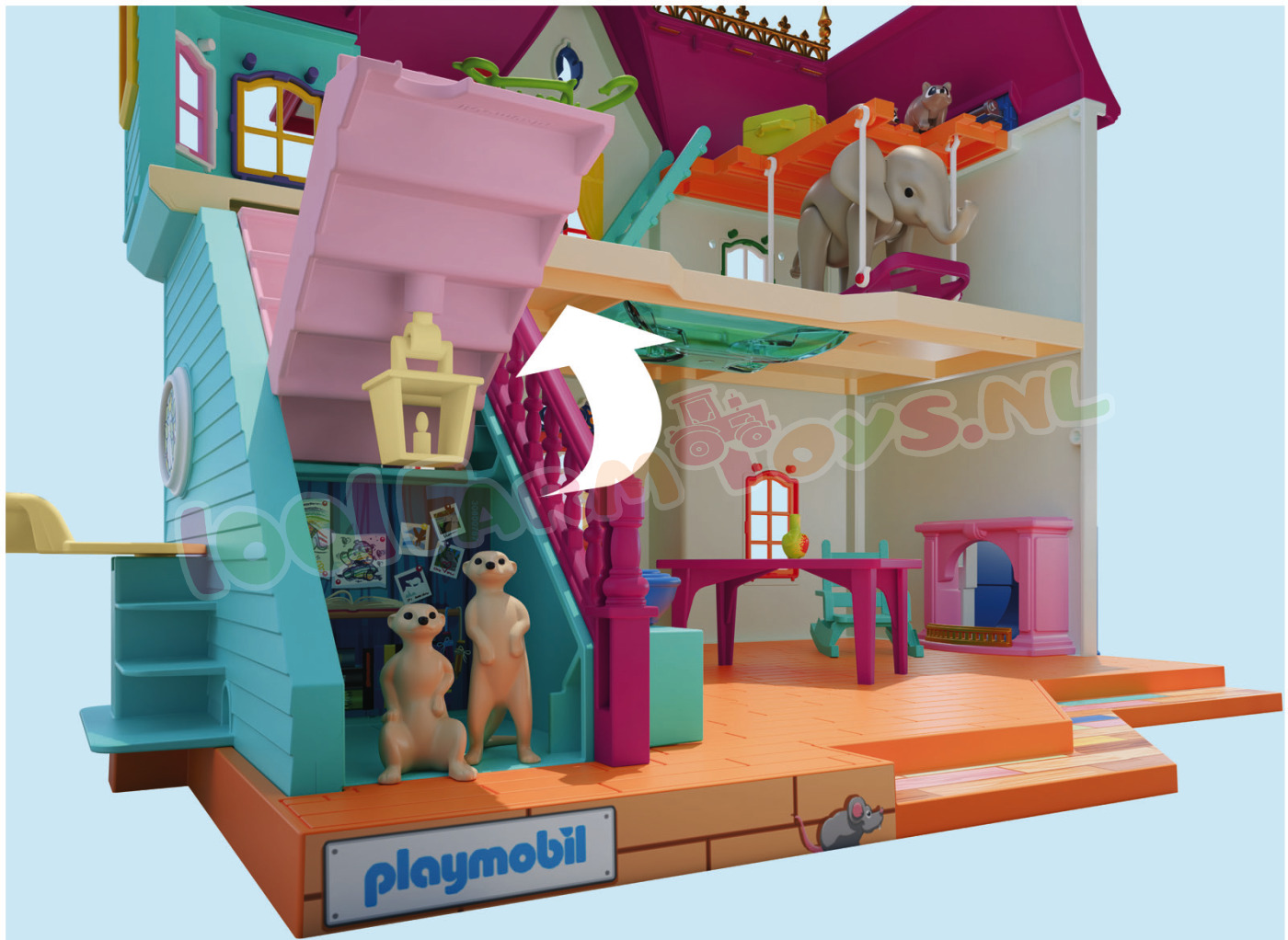 Welkom in het PLAYMOBIL Dierenhuis – een vrolijk thuis waar mensen en dieren in perfecte harmonie samenleven! Het speelse babyolifantje zwaait graag hoog in de lucht. terwijl het ondeugende girafje stiekem van de tafel snoept. Op zolder rollen de wasberen rond bij de schatkist. en het aapje klimt in de boom – mét luier aan! De eend en de kikker spetteren vrolijk in de binnenvijver. terwijl de stokstaartjes nieuwsgierig gluren vanuit hun geheime trapverstopplek. De kameleon ontspant bij de knusse grot en de kaketoe houdt alles goed in de gaten. Met drie PLAYMOBIL figuren en een levendige dierenvriendenclub is elke dag gevuld met plezier. vriendschap en avontuur!