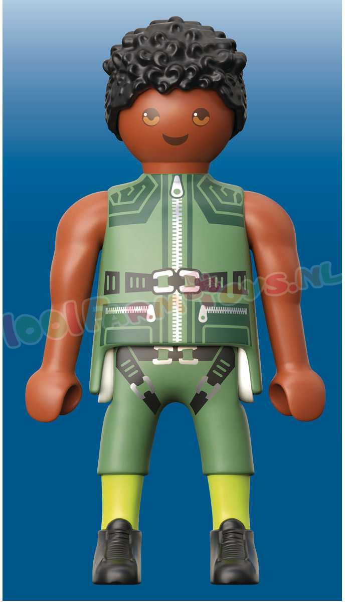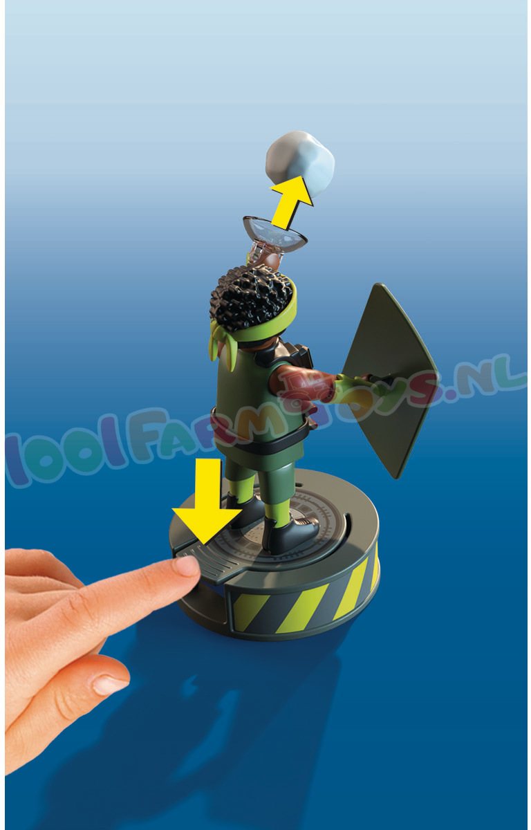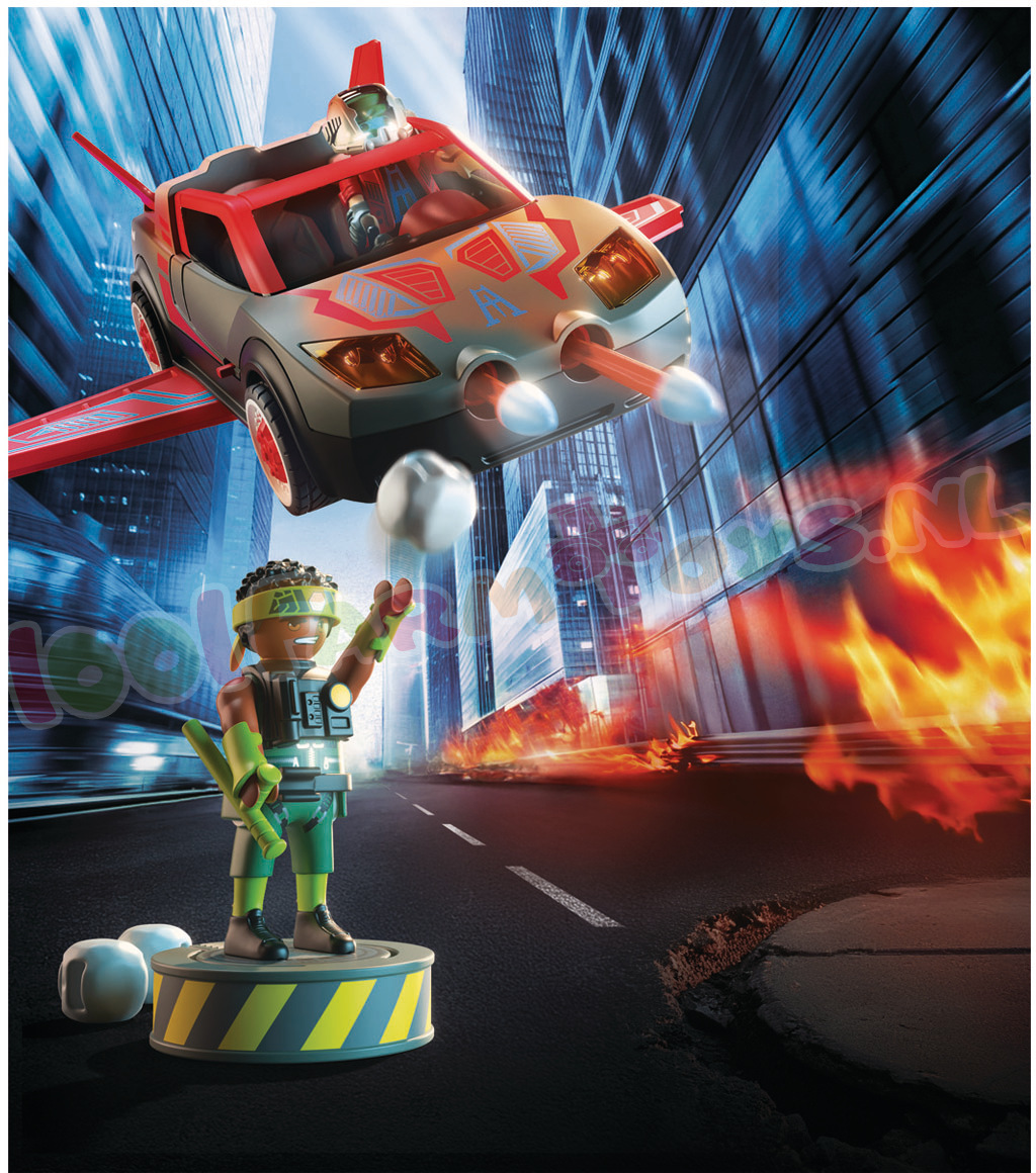 PLAYMOBIL Heroes: Adam Maxx vs. Revolt - Het multifunctionele heldenvoertuig Klaar voor elke missie: Adam Maxx vertrouwt op zijn veelzijdige multifunctionele voertuig. dat op het land. in de lucht en op het water volledig inzetbaar is. Op de grond zorgen twee werkende voorste kanonnen voor spannende actie. Voor de vliegmodus worden de vleugels uitgeklapt en is het voertuig klaar voor snelle missies in de lucht. Op het water blijft het dankzij drijvers veilig aan de oppervlakte. aangedreven door twee propellerturbines. Revolt brengt met zijn springplatform chaos in het spel door stenen op tegenstanders te katapulteren. Adam Maxx houdt hem tegen met zijn nieuwe handkanon. dat projectielen afvuurt en waarvan de munitie handig in de achterkant van het voertuig kan worden opgeborgen.