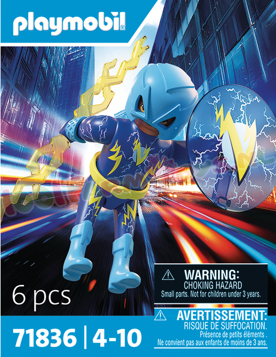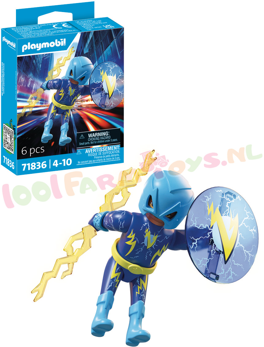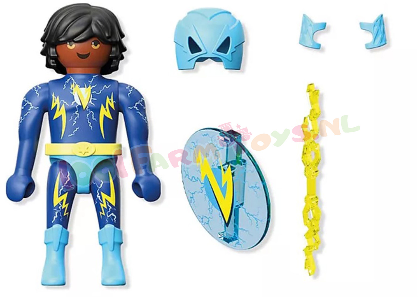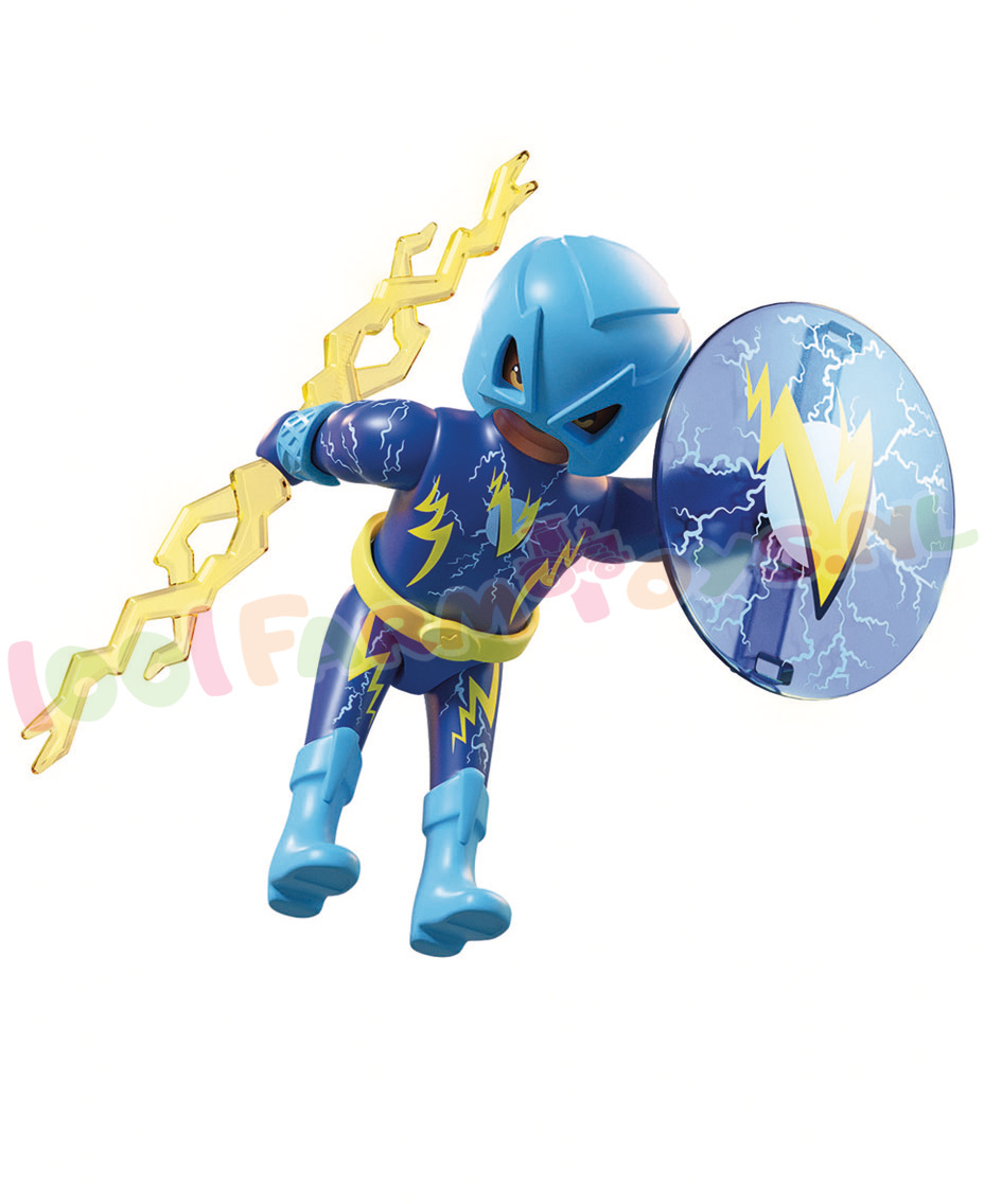Waar hij komt. slaat de bliksem in! Blue Voltage – de Bliksemheld – kanaliseert pure energie via zijn bliksemspeer. klaar om PLAYMOPOLIS te verdedigen met een flits en een knal. Zijn beschermschild knettert van kracht terwijl hij de actie in schiet. Met zijn verwisselbare masker voor geheime missies en zijn krachtige speer is deze hoogspanningsheld altijd klaar om schurken te verslaan en de nacht te verlichten. Deze dynamische PLAYMOBIL-figuur zit vol coole accessoires voor supergeladen rollenspel en is een onmisbare aanvulling op jouw PLAYMOBIL Heroes-verzameling!