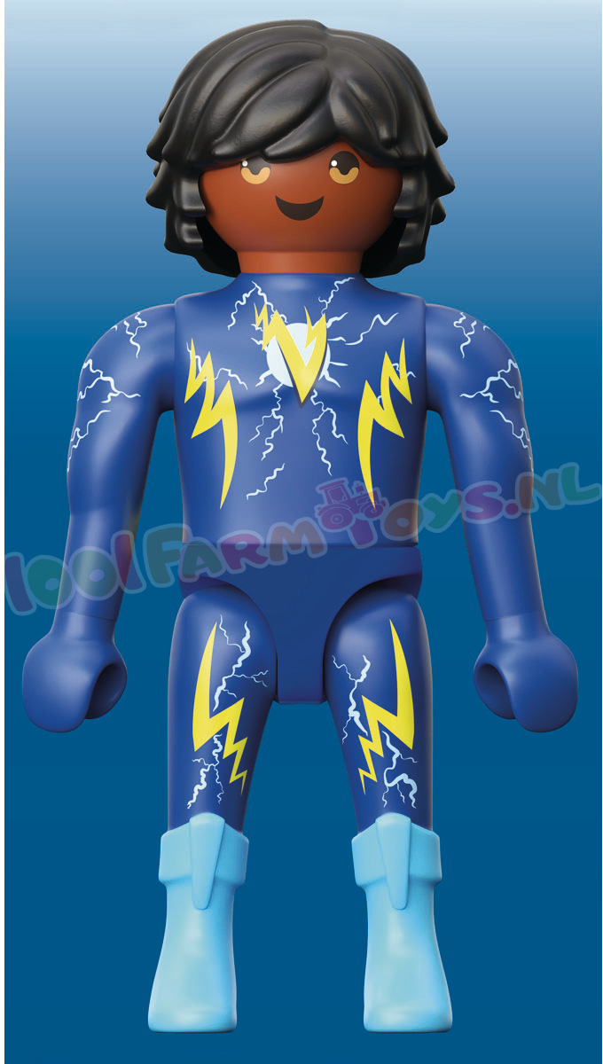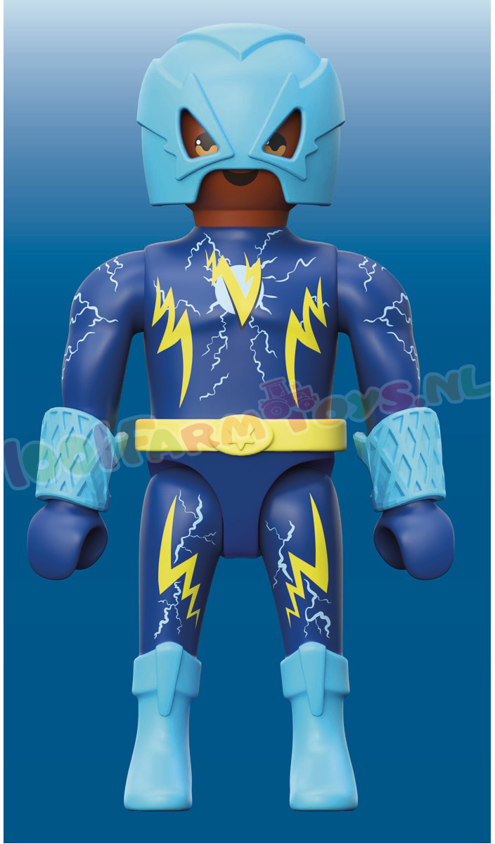PLAYMOBIL Heroes: Blue Voltage - De bliksemheld Een van de vier verzamelbare helden uit de PLAYMOBIL Heroes-serie. waarmee je je team van helden en schurken kunt uitbreiden! De energieke bliksemheld Blue Voltage maakt indruk met zijn bliksemsnelle reflexen en zijn vermogen om elektriciteit op te wekken en daaruit beschermende schilden te vormen. Met zijn verwisselbare masker kan hij onherkenbaar blijven terwijl hij zijn vijanden nauwkeurig raakt met zijn speerbliksem.