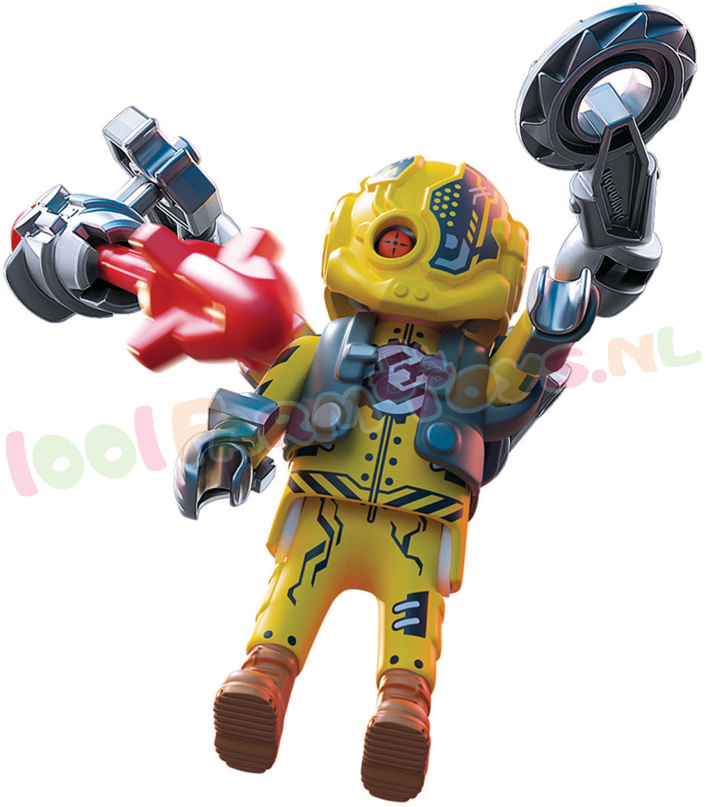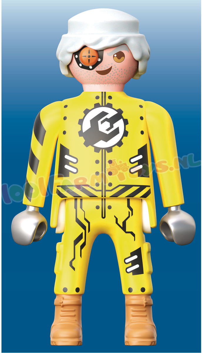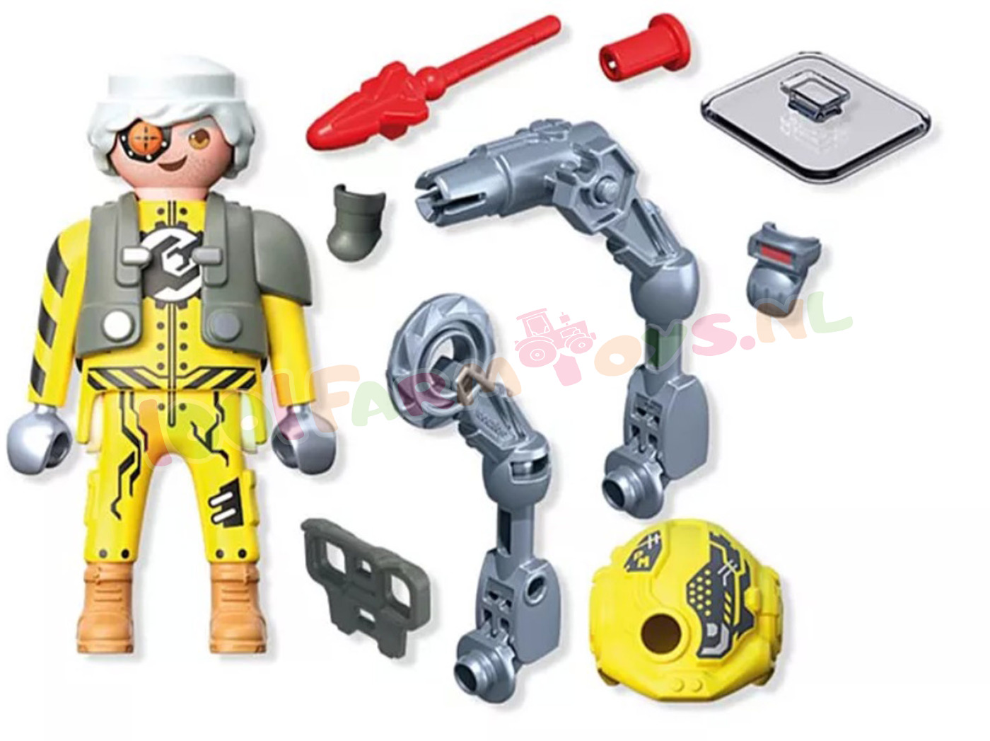 PLAYMOBIL Heroes: Mr Mechanic - De robotheld Een van de vier verzamelbare helden uit de PLAYMOBIL Heroes-serie. waarmee je je team van helden en schurken kunt uitbreiden! De cybernetische uitvinder en robotheld Mr. Mechanic maakt indruk met zijn exoskelet en twee krachtige robotarmen. Met zijn afneembare kanon op zijn arm kan hij raketpijlen afvuren en zo moeiteloos obstakels of vijanden overwinnen. Zijn opvallende helm laat zijn opvallende cyborg-oog zien – een symbool van zijn onstuitbare wil om PLAYMOPOLIS te domineren.