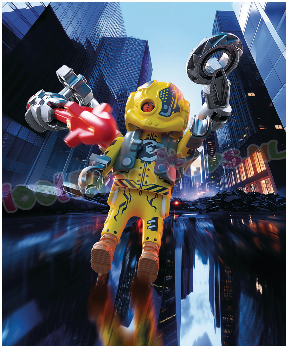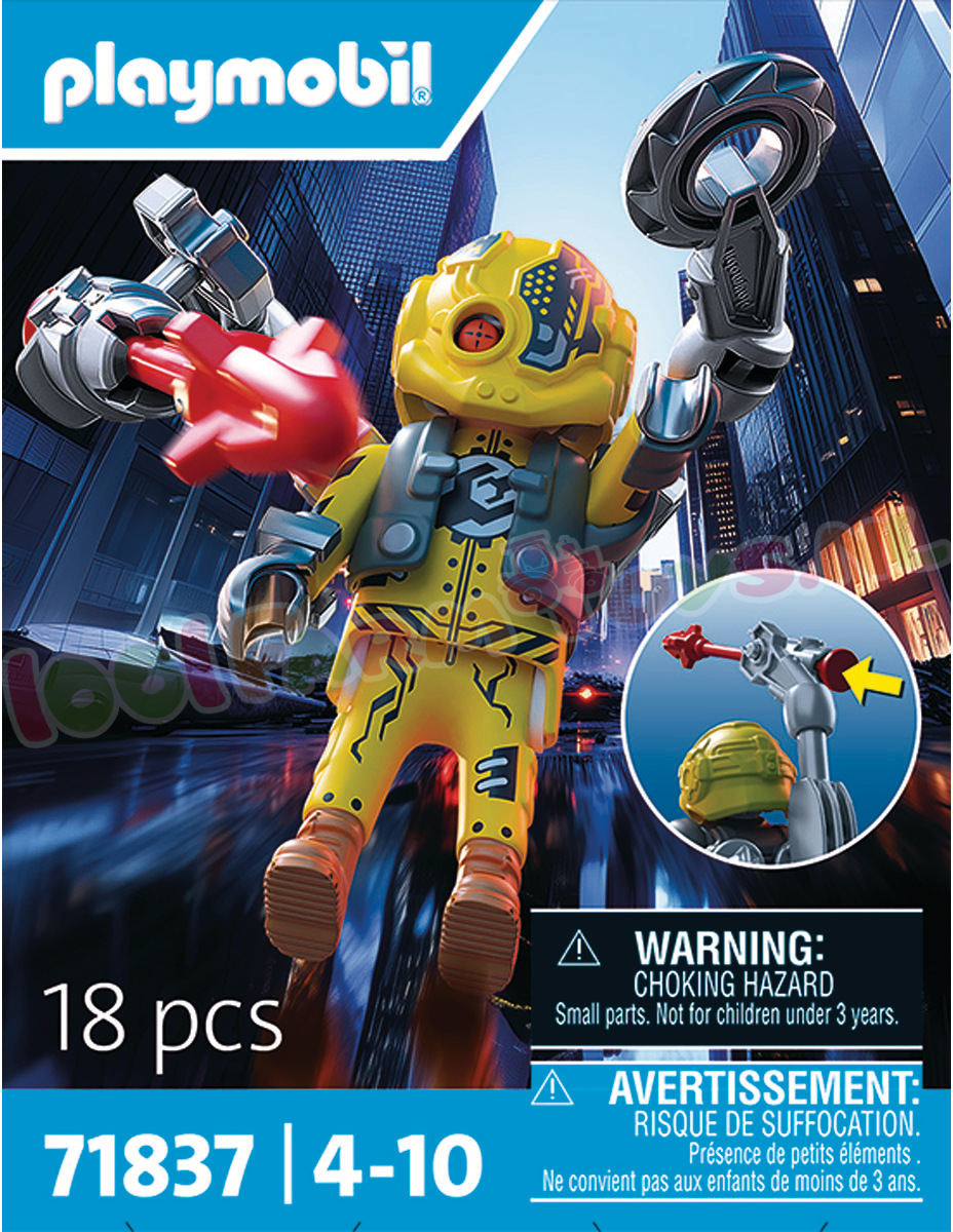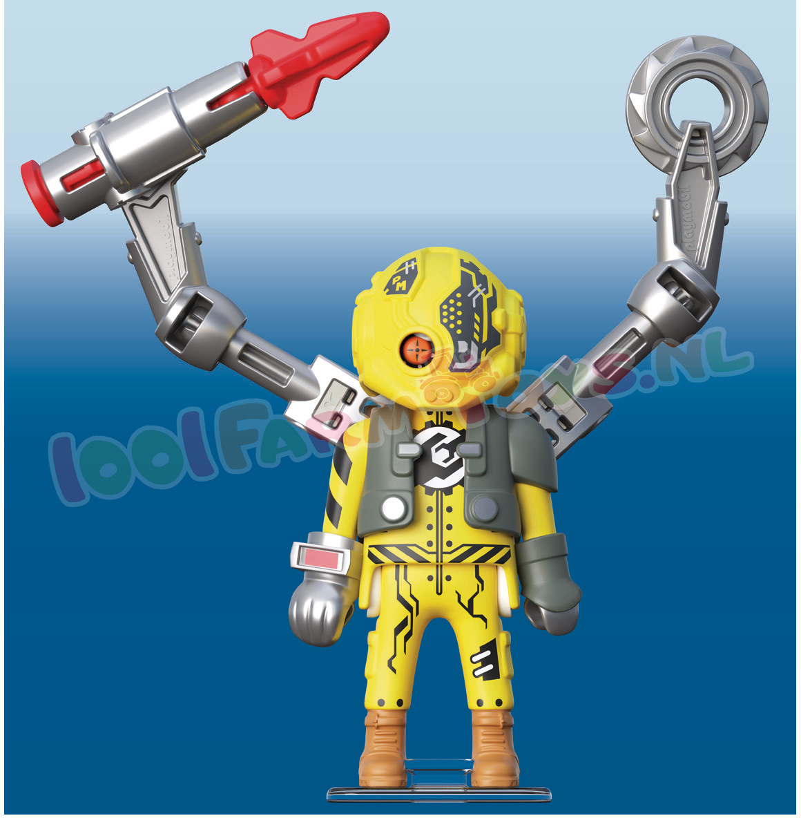 PLAYMOBIL Heroes: Mr Mechanic - De robotheld Een van de vier verzamelbare helden uit de PLAYMOBIL Heroes-serie. waarmee je je team van helden en schurken kunt uitbreiden! De cybernetische uitvinder en robotheld Mr. Mechanic maakt indruk met zijn exoskelet en twee krachtige robotarmen. Met zijn afneembare kanon op zijn arm kan hij raketpijlen afvuren en zo moeiteloos obstakels of vijanden overwinnen. Zijn opvallende helm laat zijn opvallende cyborg-oog zien – een symbool van zijn onstuitbare wil om PLAYMOPOLIS te domineren.