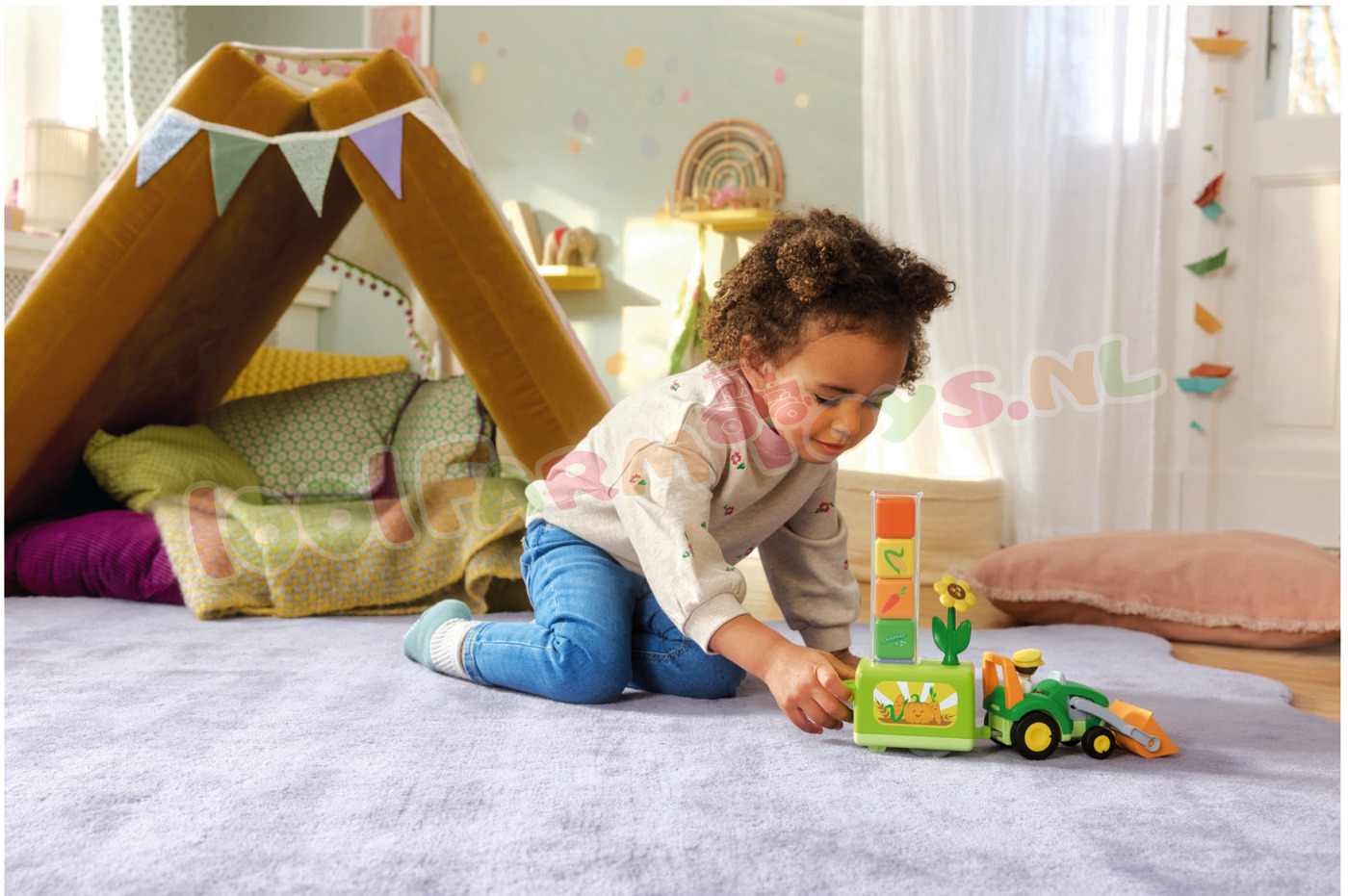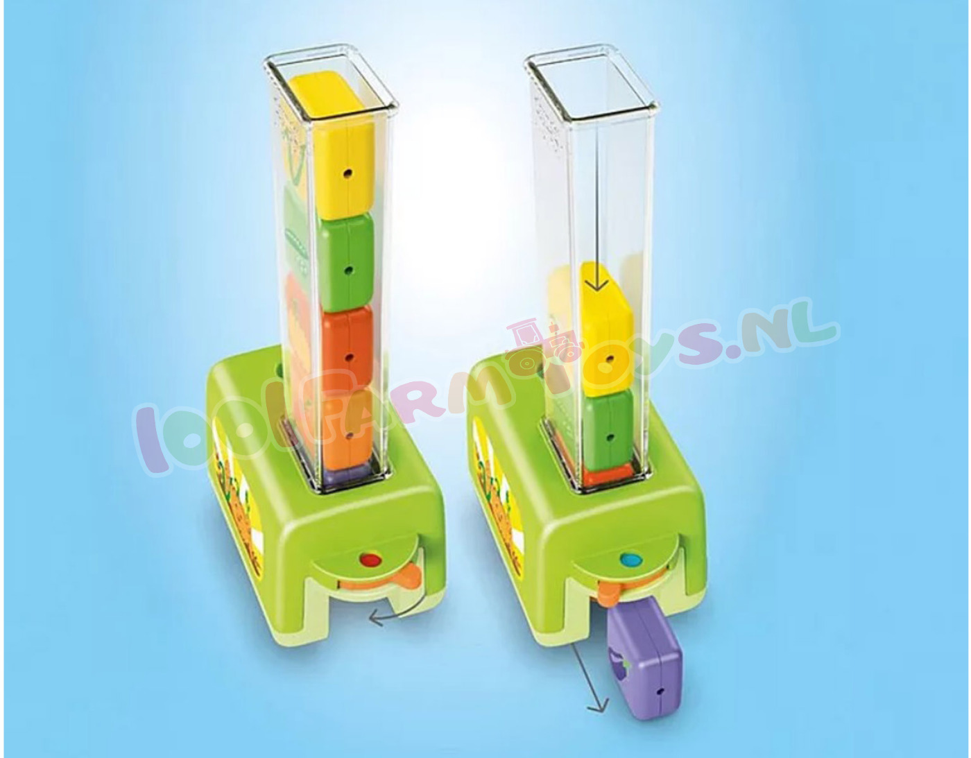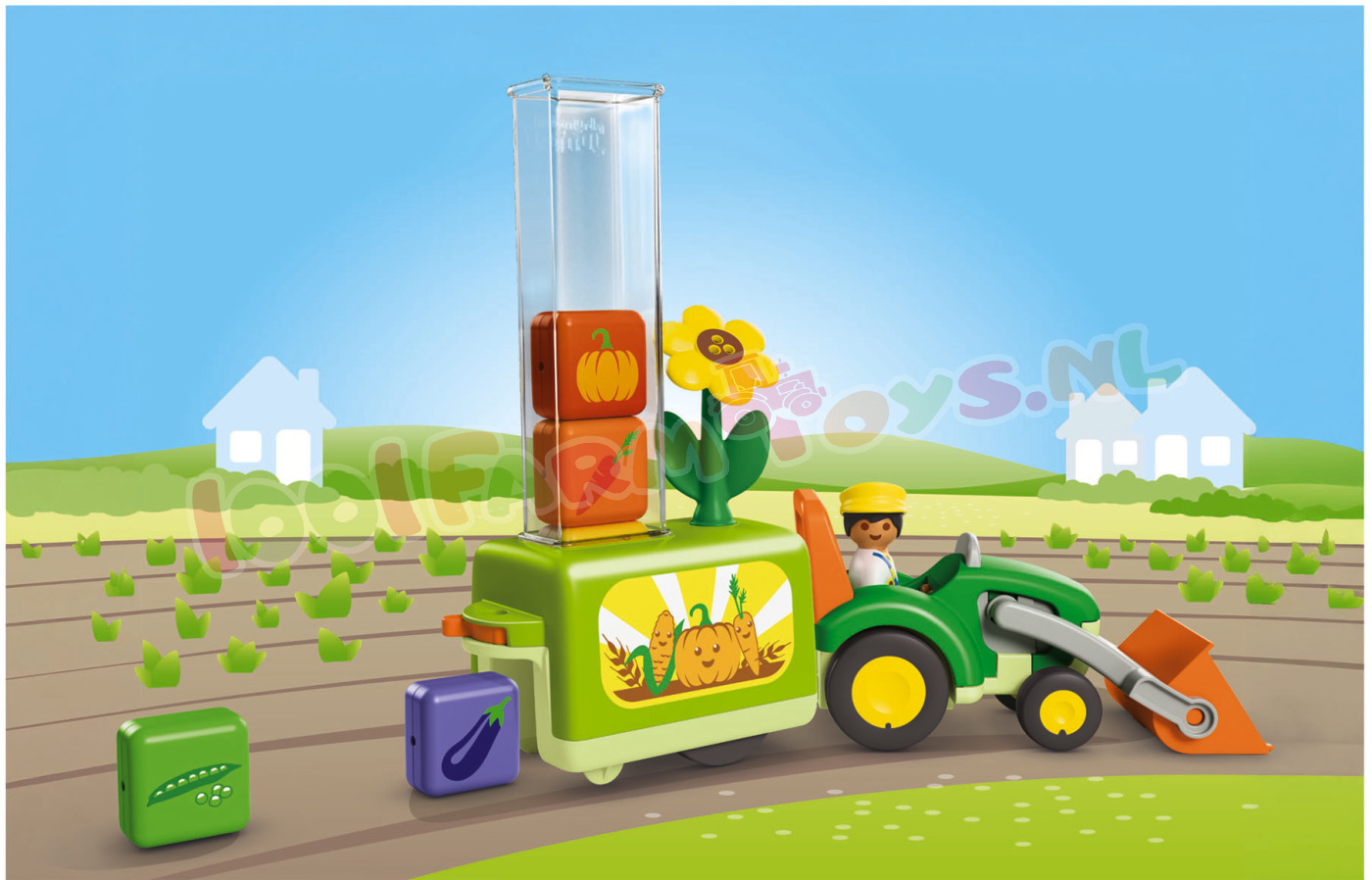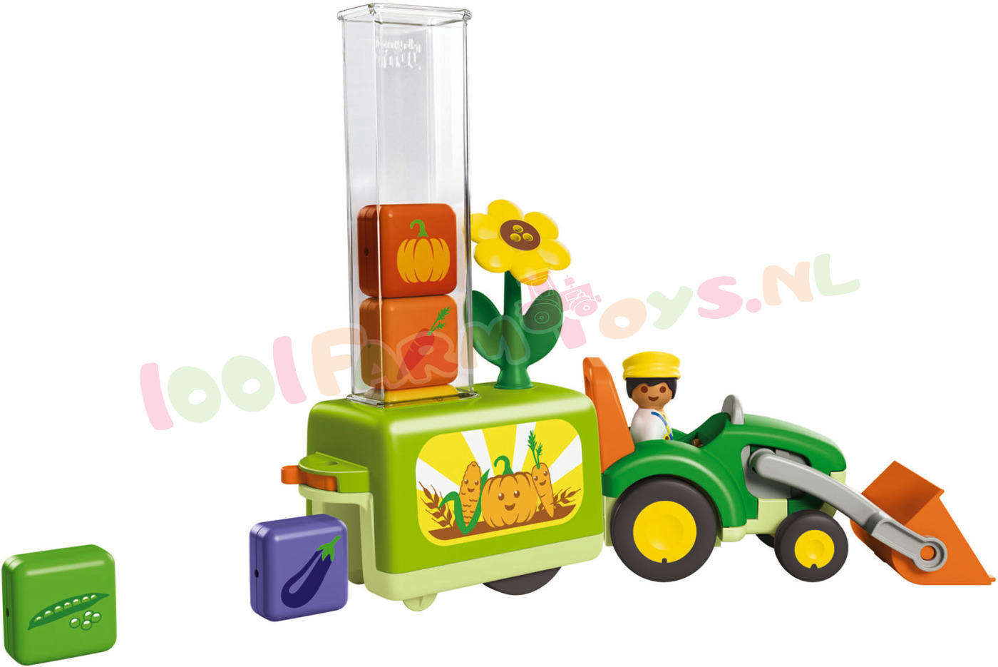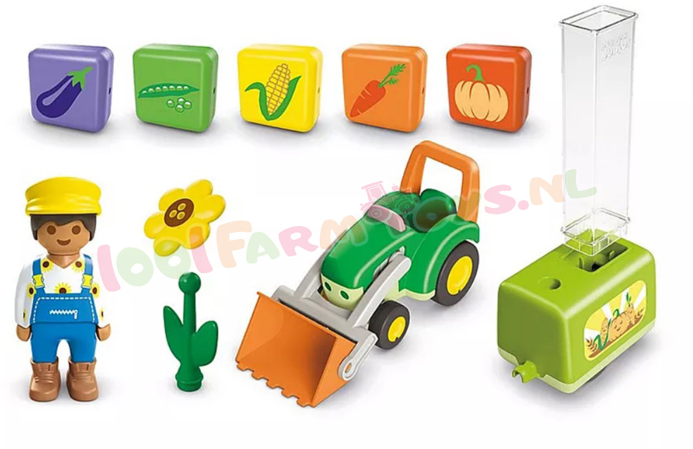 Vandaag gaan we het veld in. Het is tijd om nieuwe groenten te planten. Wie kan de boer helpen om de groenten in de aanhanger te sorteren en op het juiste veld uit te laden? Welke groenten vindt je kind het lekkerst? Met de grappige plantmachine is speelplezier gegarandeerd. Wie sorteert als eerste de groente-elementen in de schacht? Heeft iemand gecontroleerd of ze goed zijn geplaatst? Alles is al opgeladen en de rit naar het veld kan beginnen. Waar gaan we vandaag planten? Hebben jullie de juiste plek gevonden? Zet dan snel de grendel van de aanhanger om en de elementen vallen er stuk voor stuk uit. Zitten alle vijf groentesoorten in de aarde? Wie kent alle soorten? Wie heeft zin om ze allemaal weer te verzamelen en het spel opnieuw te beginnen?
