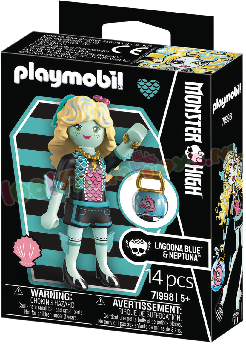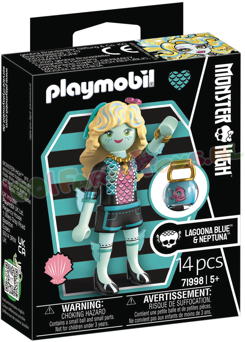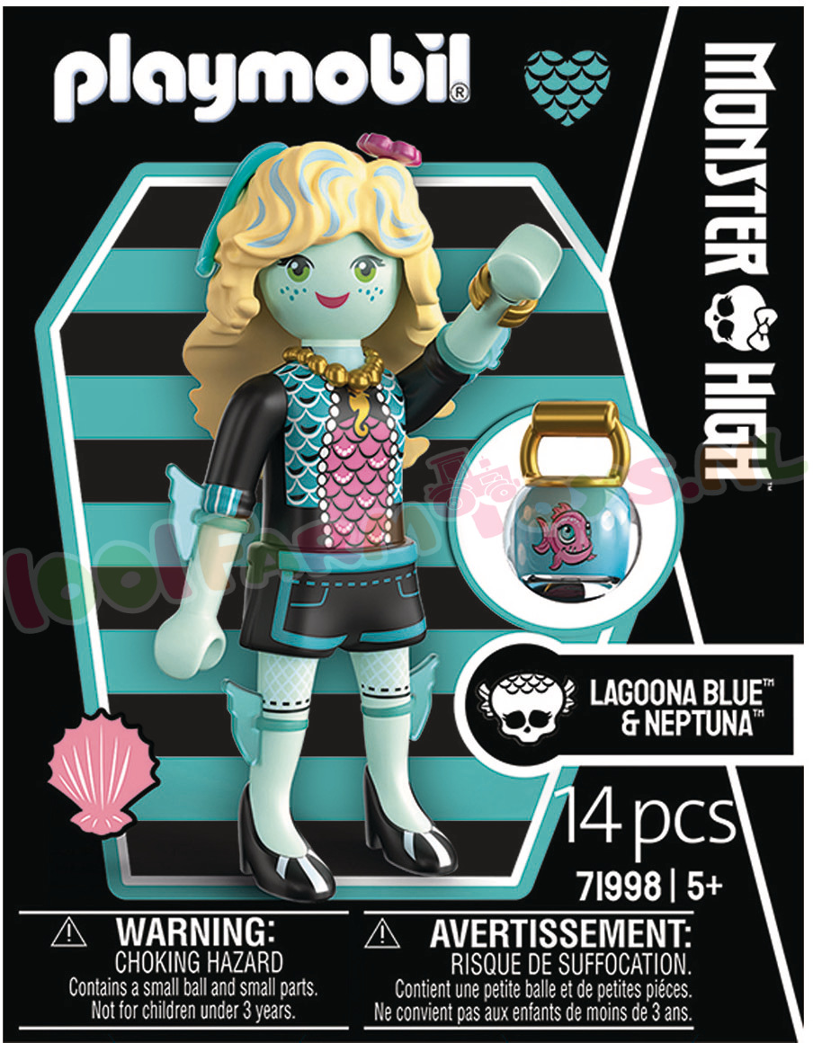 Lagoona Blue Klaar voor een spetterend optreden? Lagoona Blue brengt met haar op de oceaan geïnspireerde details echte zeemagie naar de wereld van Monster High™! Inclusief: een doorzichtige tas in PLAYMOBIL-stijl – inclusief haar visvriendje. Een onderwaterdroom voor iedereen die zijn verzameling een vleugje aquatische charme wil geven.Dankzij het modulaire ontwerp van PLAYMOBIL kan Lagoona coole poses aannemen en haar stijl aanpassen voor eindeloze onderwateravonturen. Haar gedetailleerde kenmerken en vloeiende silhouet zorgen voor een zee van persoonlijkheid in elke collectie. Of ze nu door de gangen van Monster High™ zwemt of zich verliest in diepe dagdromen – deze PLAYMOBIL-tiener is helemaal klaar om mee te surfen op de golf van fantasierijk spel. Perfect om mee te spelen of neer te zetten – een echte aanwinst voor elke griezelige verzameling!Zie ook Monster High: PY71992; PY71993; PY71994; PY71995; PY71996; PY71997; PY71998; PY72043; PY72044; PY72045; PY72046