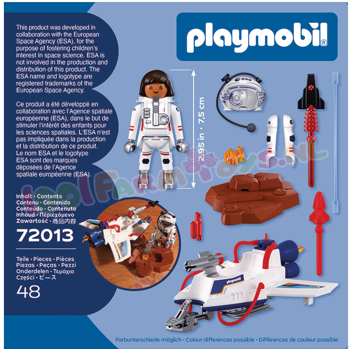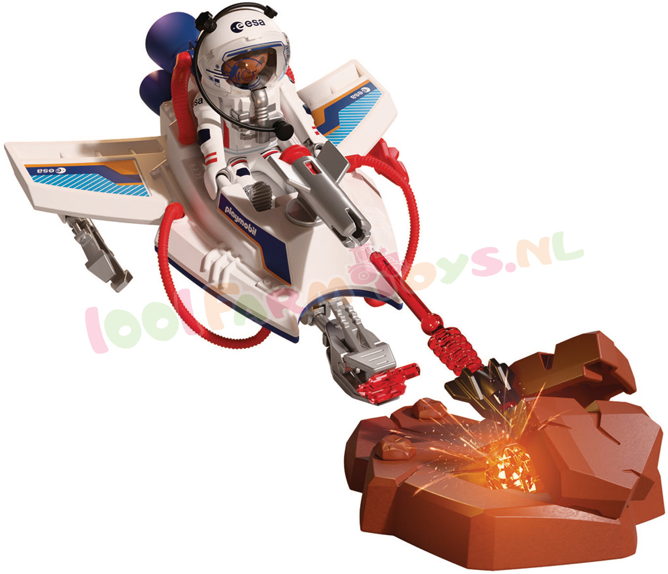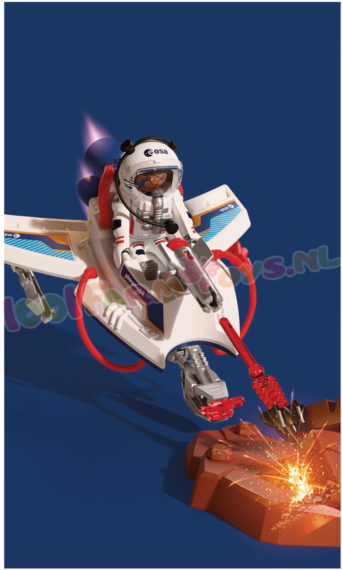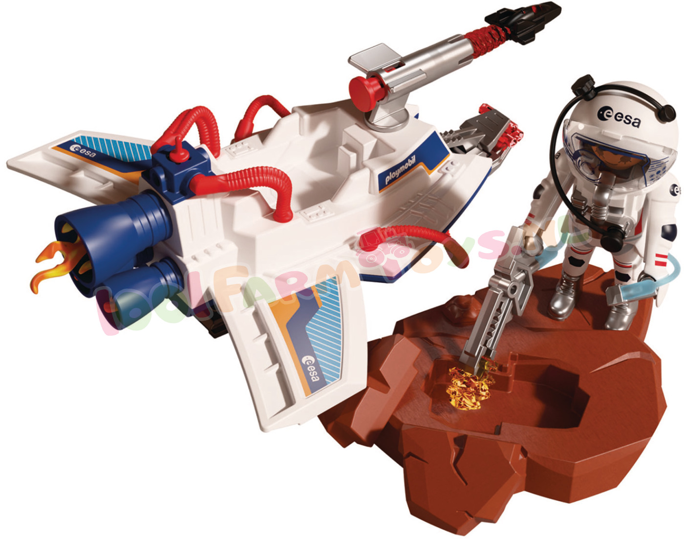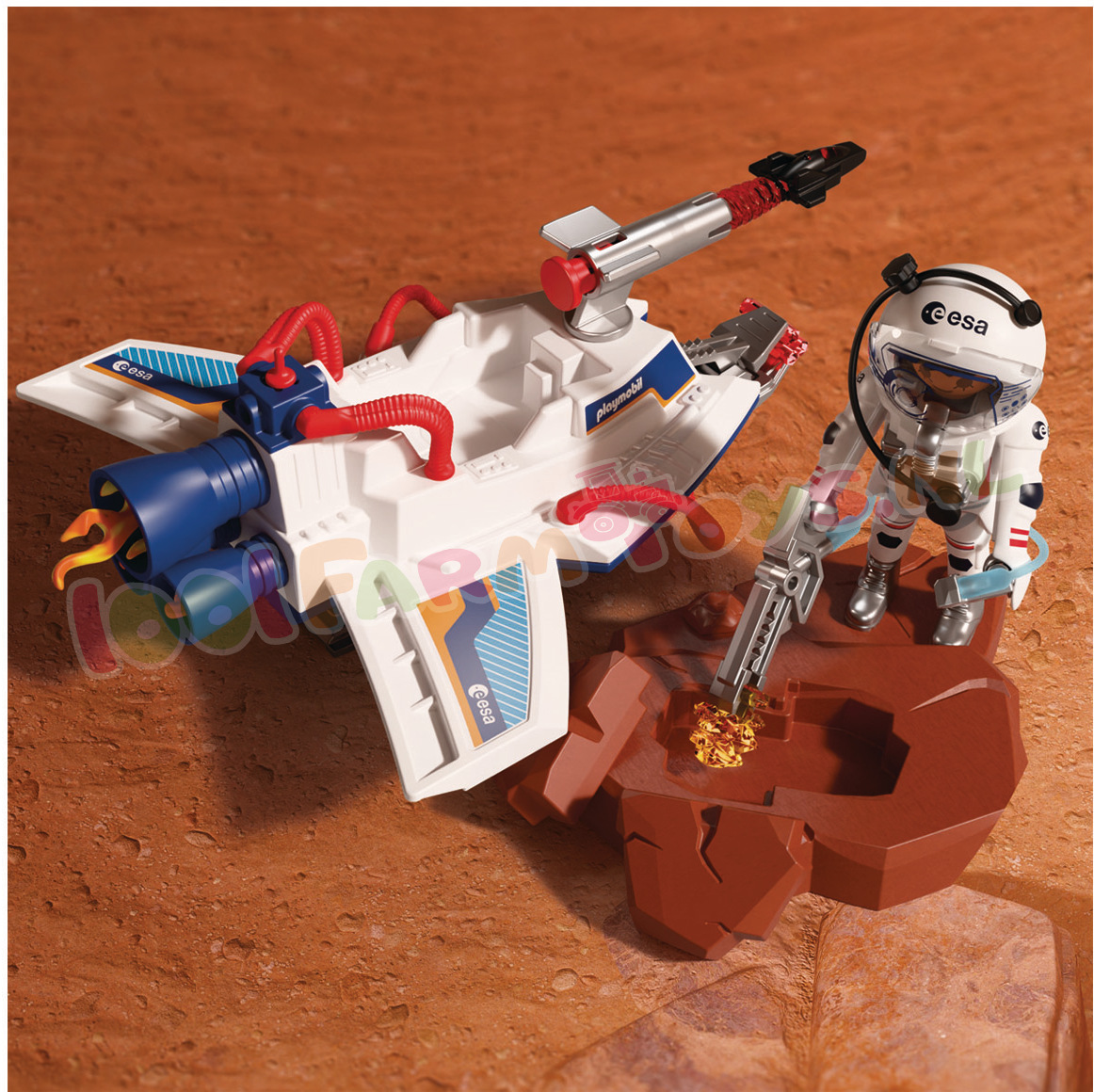 Ontwikkeld in samenwerking met de Europese Ruimtevaartorganisatie (ESA) – PLAYMOBIL brengt de fascinatie van ruimteonderzoek rechtstreeks naar de kinderkamer! Het snelle ruimtetoestel manoeuvreert net boven het oppervlak van Mars en scant de grond op zoek naar bijzondere vondsten. Met zijn tang heeft hij al een waardevolle kristal gevonden. maar er zit nog meer in de rots! Nu richt hij zijn speciale projectiel op een rotsformatie om verborgen kristallen bloot te leggen. Perfect voor spannende avonturen op Mars met actie. onderzoek en hightechapparatuur!