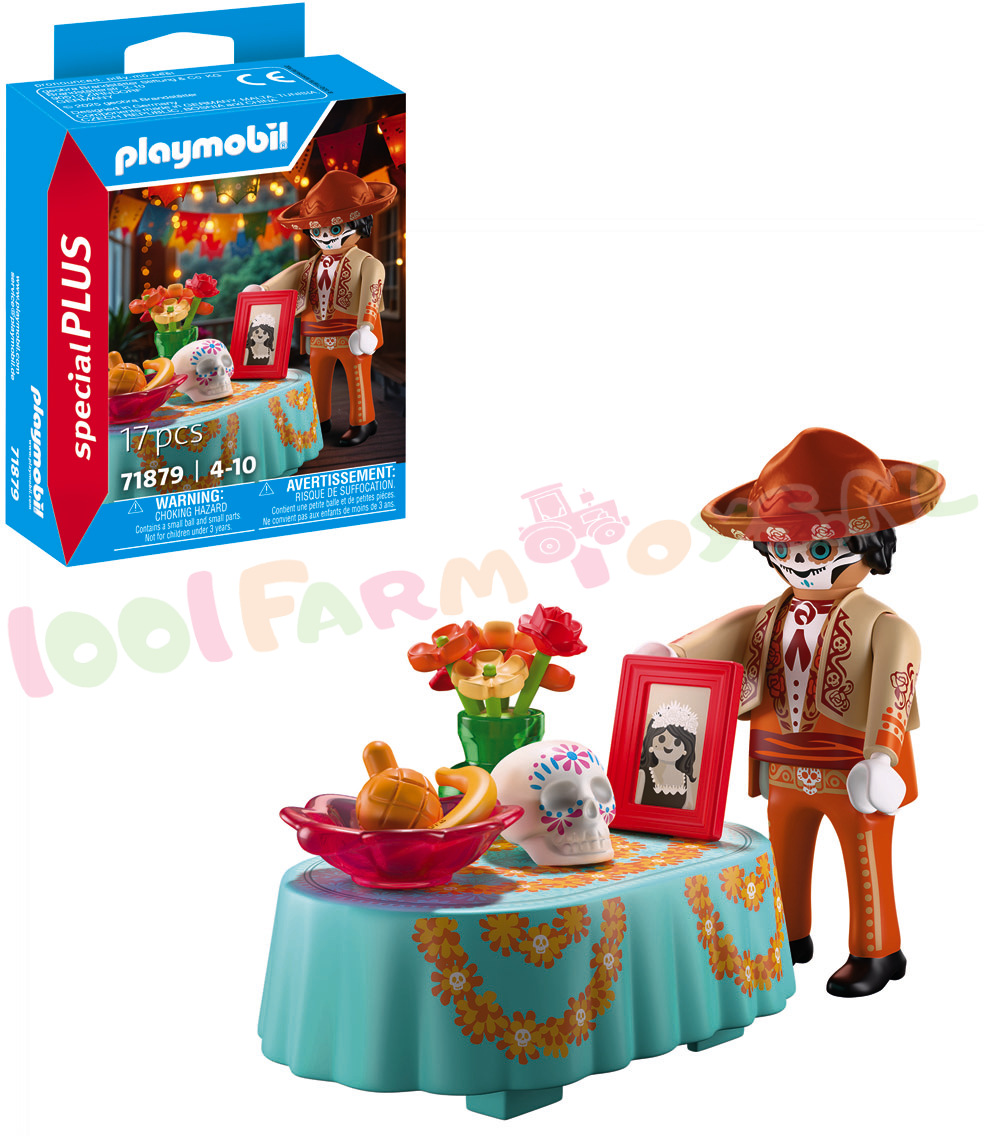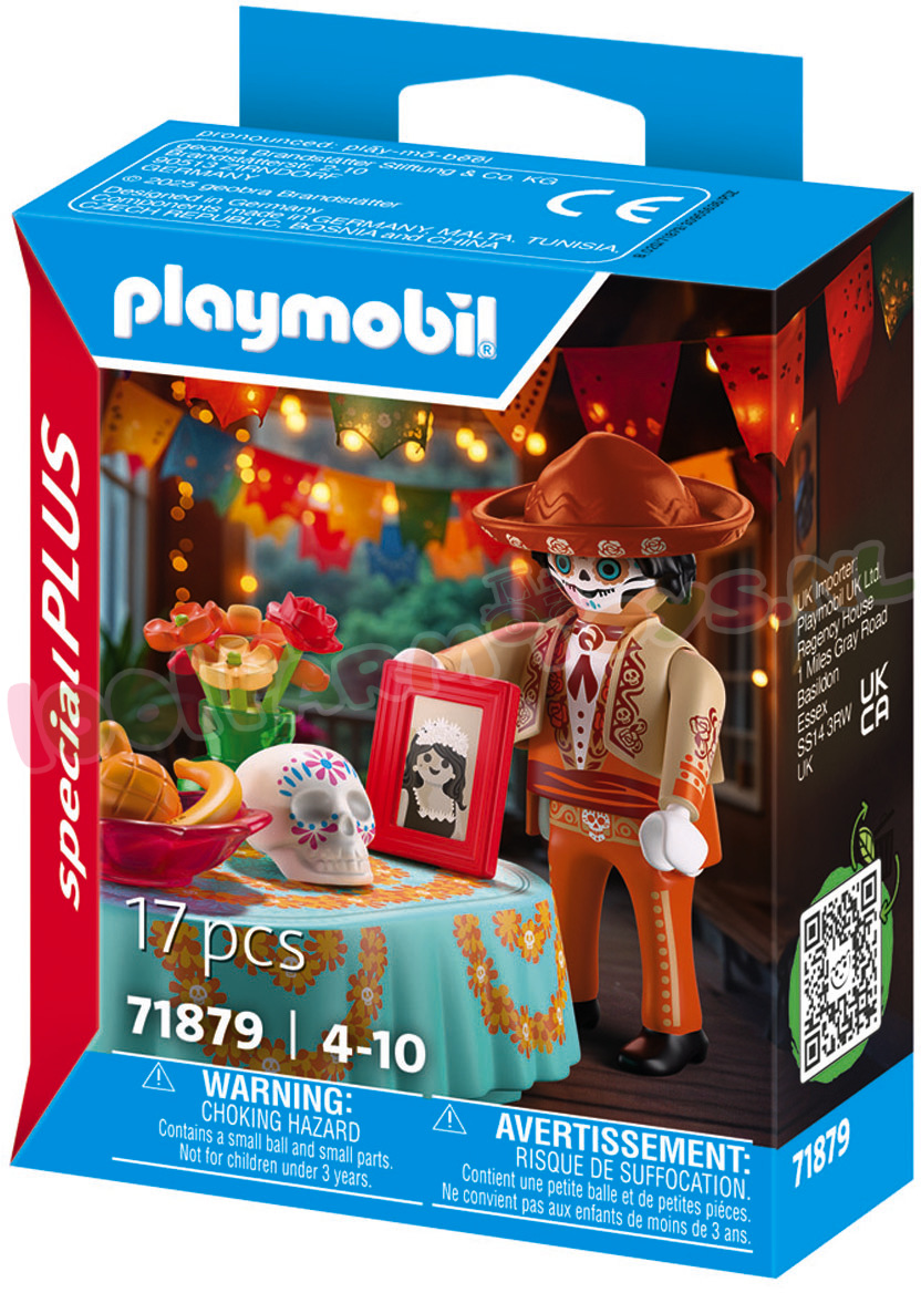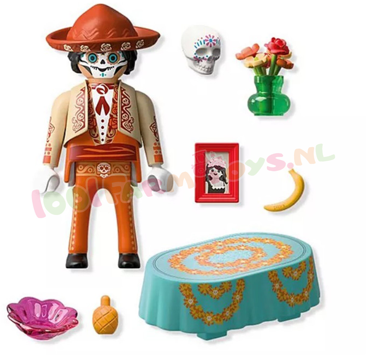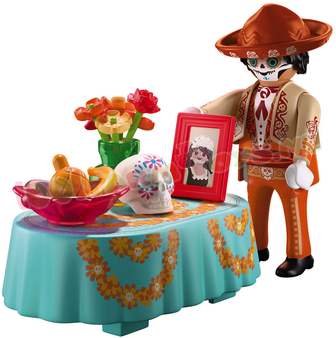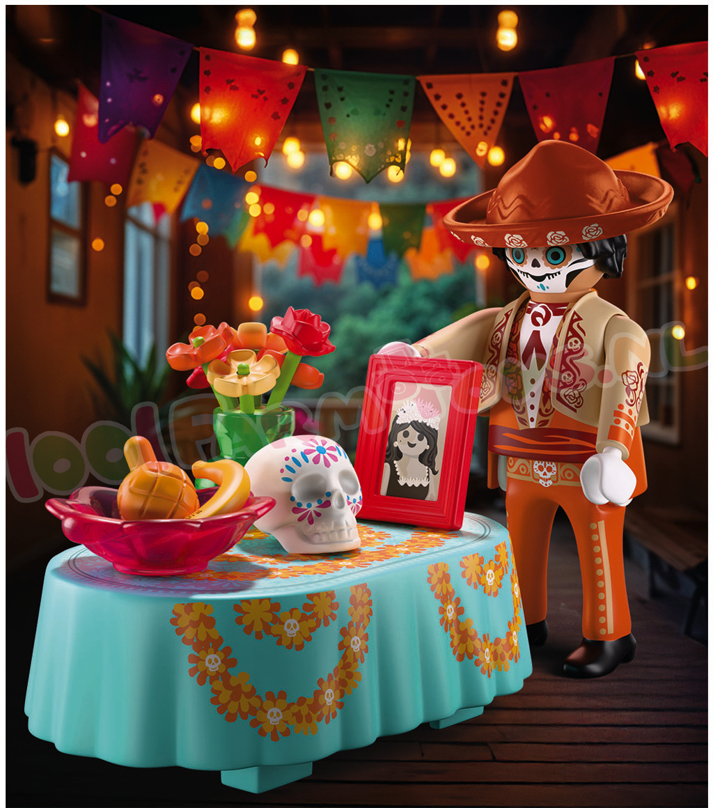 Vier traditie met kleur en vrolijkheid! De PLAYMOBIL Día de los Muertos set brengt de feestelijke sfeer tot leven met levendige details en betekenisvolle symbolen. De decoratieve tafel kan worden ingericht met fruit. bloemen. een beschilderde schedel en een ingelijste foto—perfect om geliefden te eren. De figuur heeft een afneembare hoed en kan verschillende accessoires vasthouden voor interactief spel. Deze prachtige PLAYMOBIL set is ideaal voor creatief spel dat cultuur. herinnering en fantasie op een vrolijke manier viert.