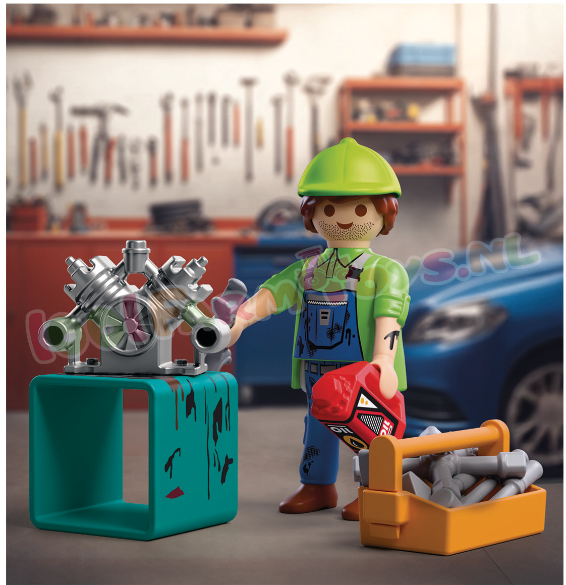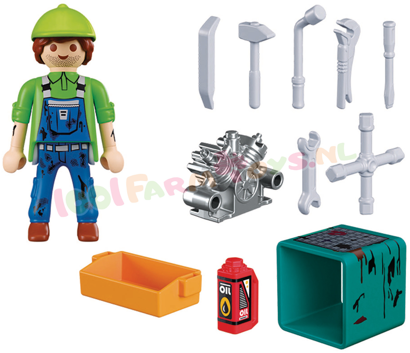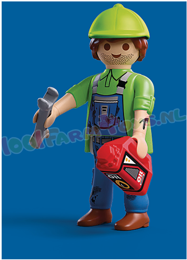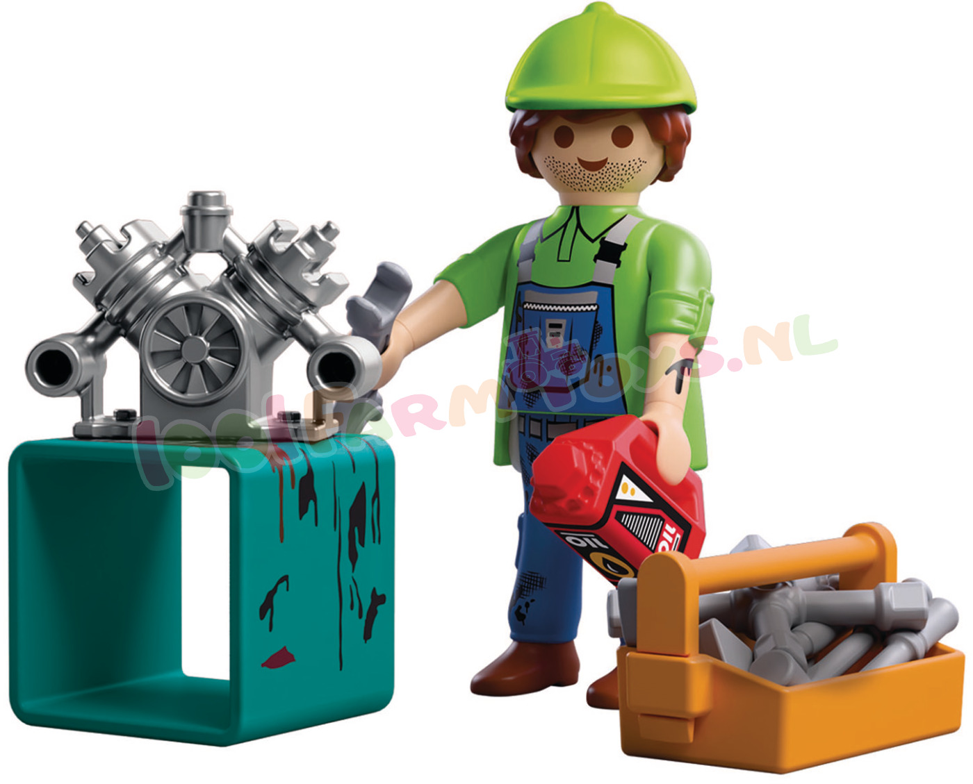 PLAYMOBIL Special Plus Monteur. De monteur is klaar voor de volgende klus! Met een moersleutel. een jerrycan olie en een volle gereedschapskist krijgt hij elke motor weer aan de praat!