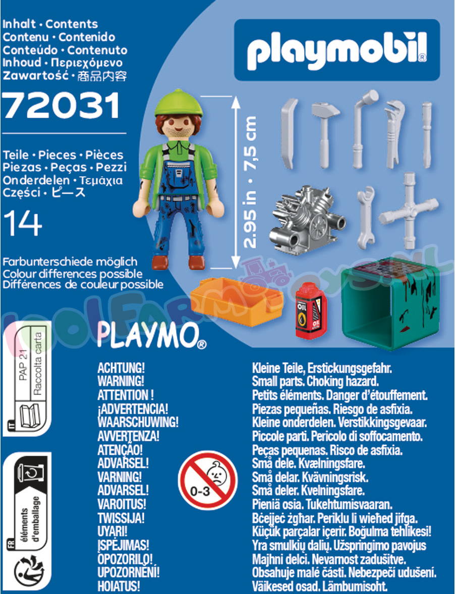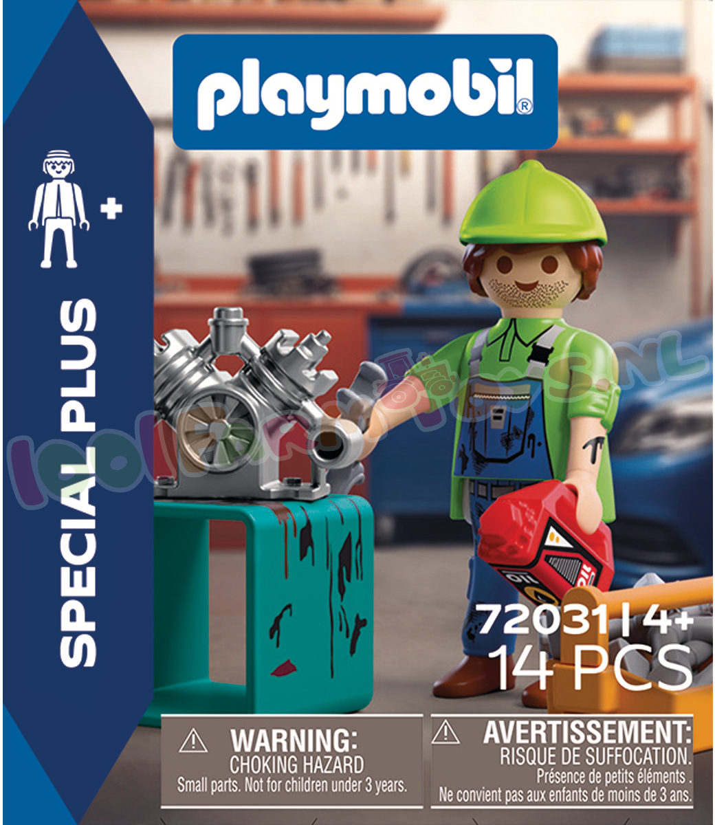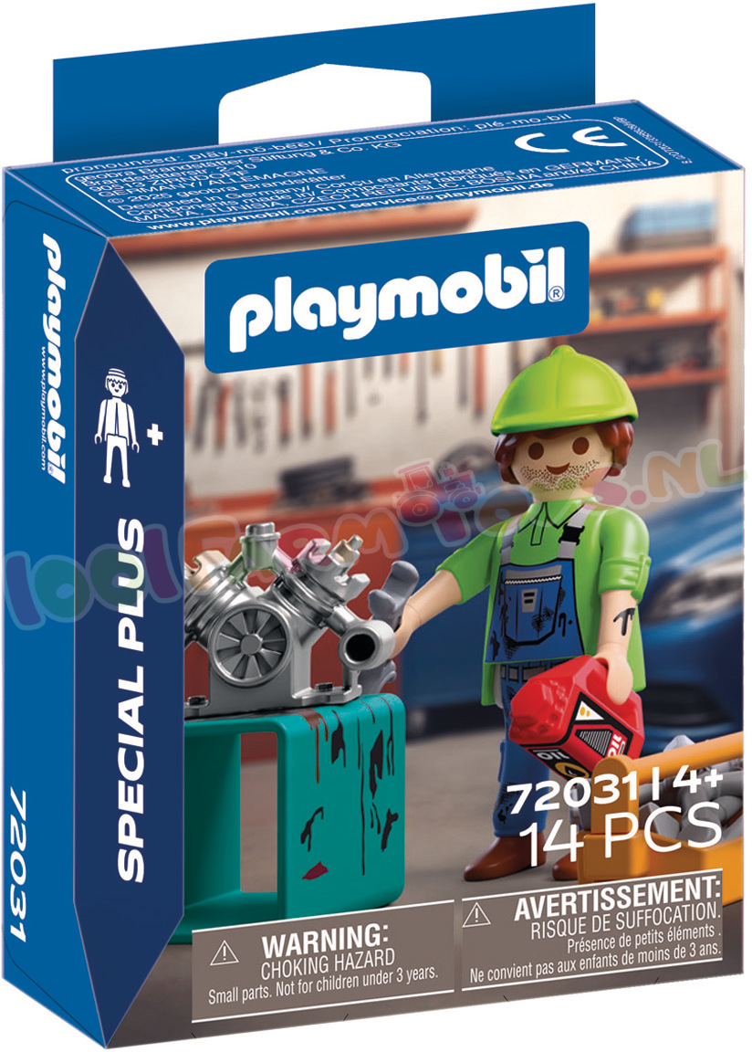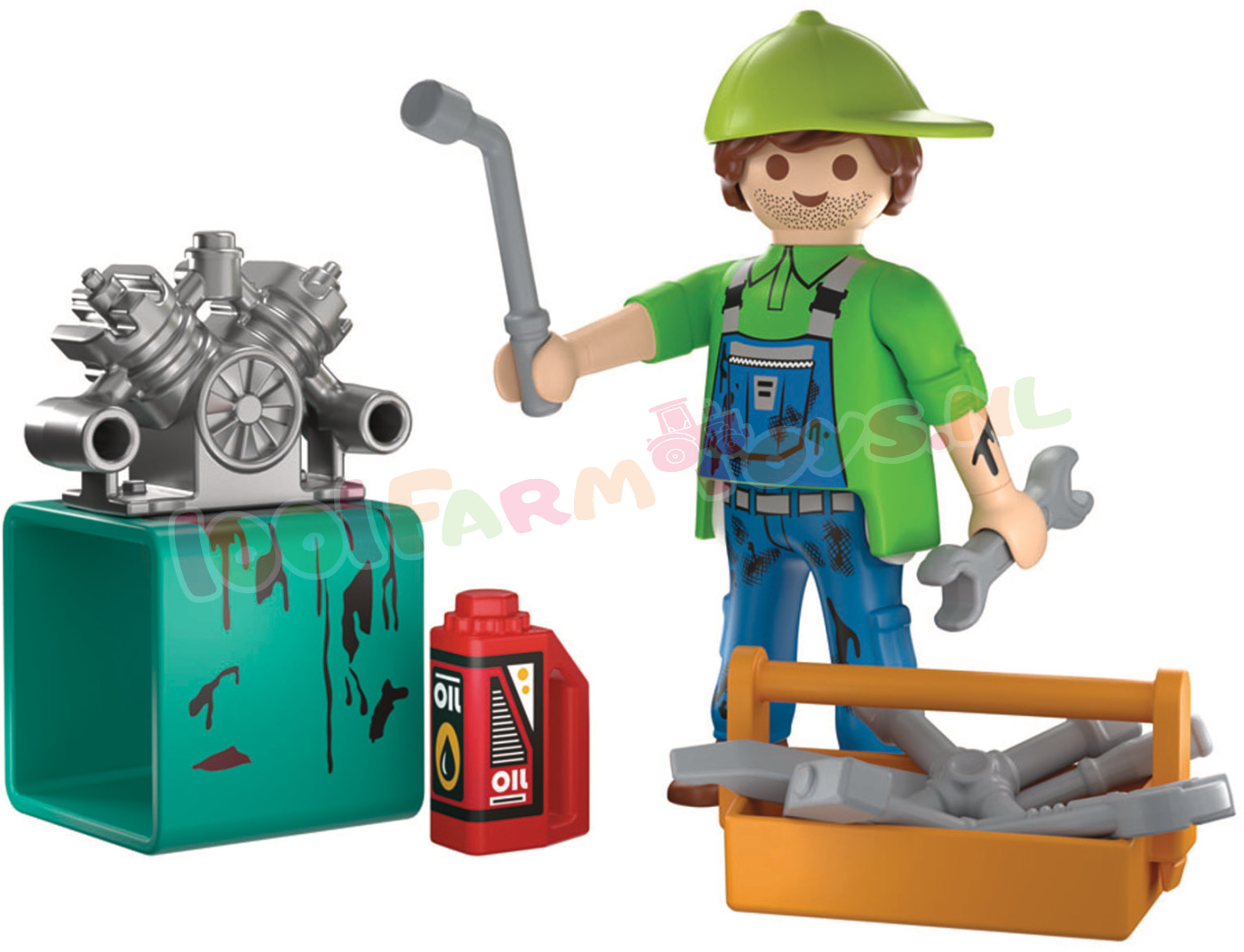 PLAYMOBIL Special Plus Monteur. De monteur is klaar voor de volgende klus! Met een moersleutel. een jerrycan olie en een volle gereedschapskist krijgt hij elke motor weer aan de praat!