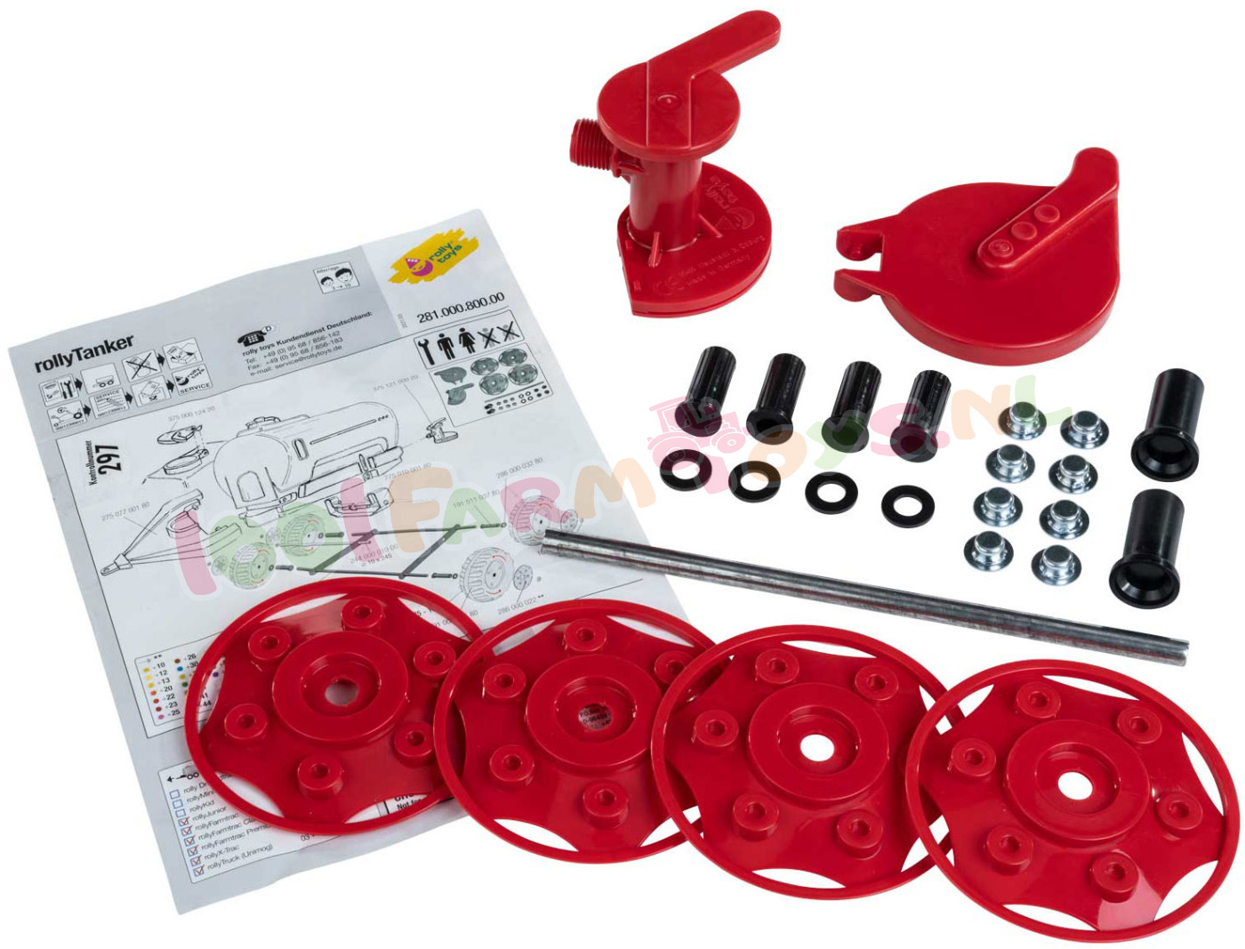 Montage toebehoren Rolly Tanker:bestaat uit:4x Wieldop rood1x Sproeier rood1x Deksel rood6x Asdoppen 10mm
