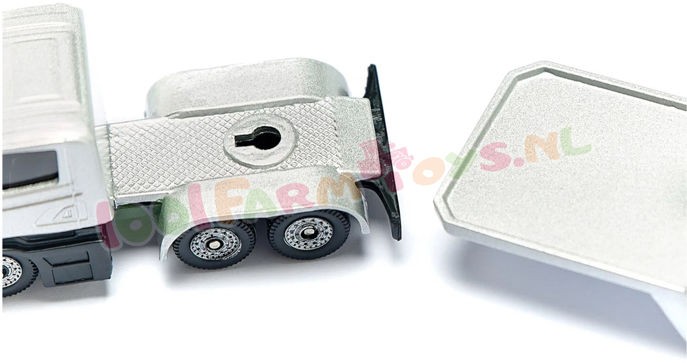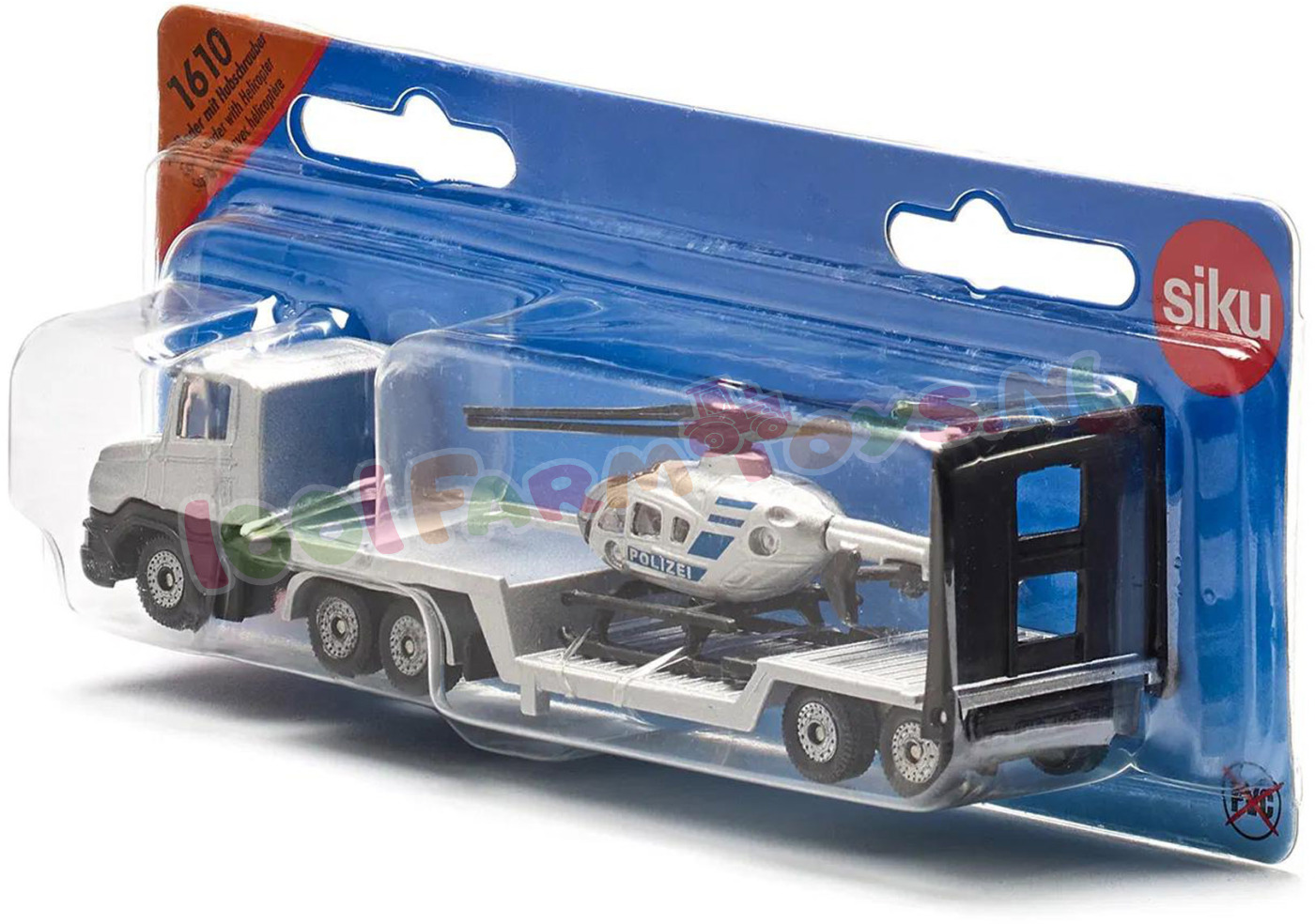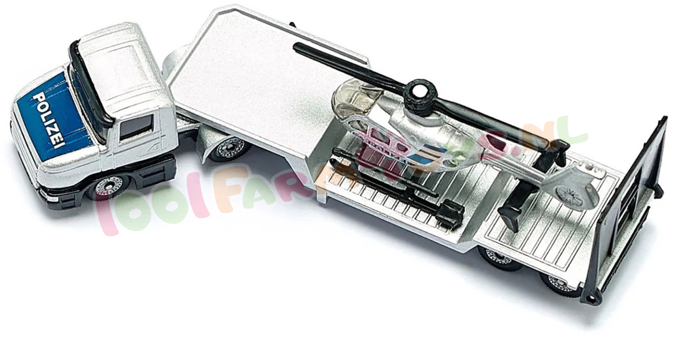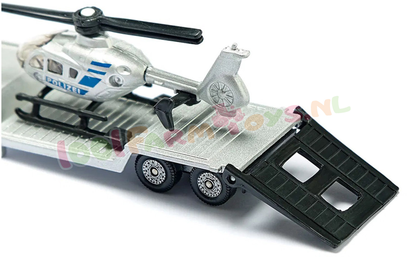 Een unieke aanhanger gemaakt van metalen en kunststof onderdelen. ontworpen om de SIKU politiehelikopter te vervoeren. Hij is speciaal gevormd. heeft een bescherming aan de achterkant en met de rubberen banden kan de bestuurder bijna overal komen. Een set voor speciale taken. inclusief een helikopter met een beweegbare propeller en een transparante cockpit. Het model zal nuttig blijken voor het spel van kleine politieagenten en als interessante aanvulling op menig verzameling.