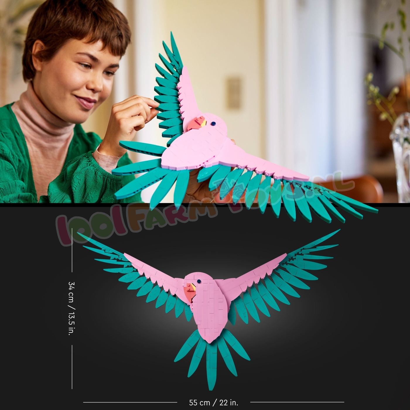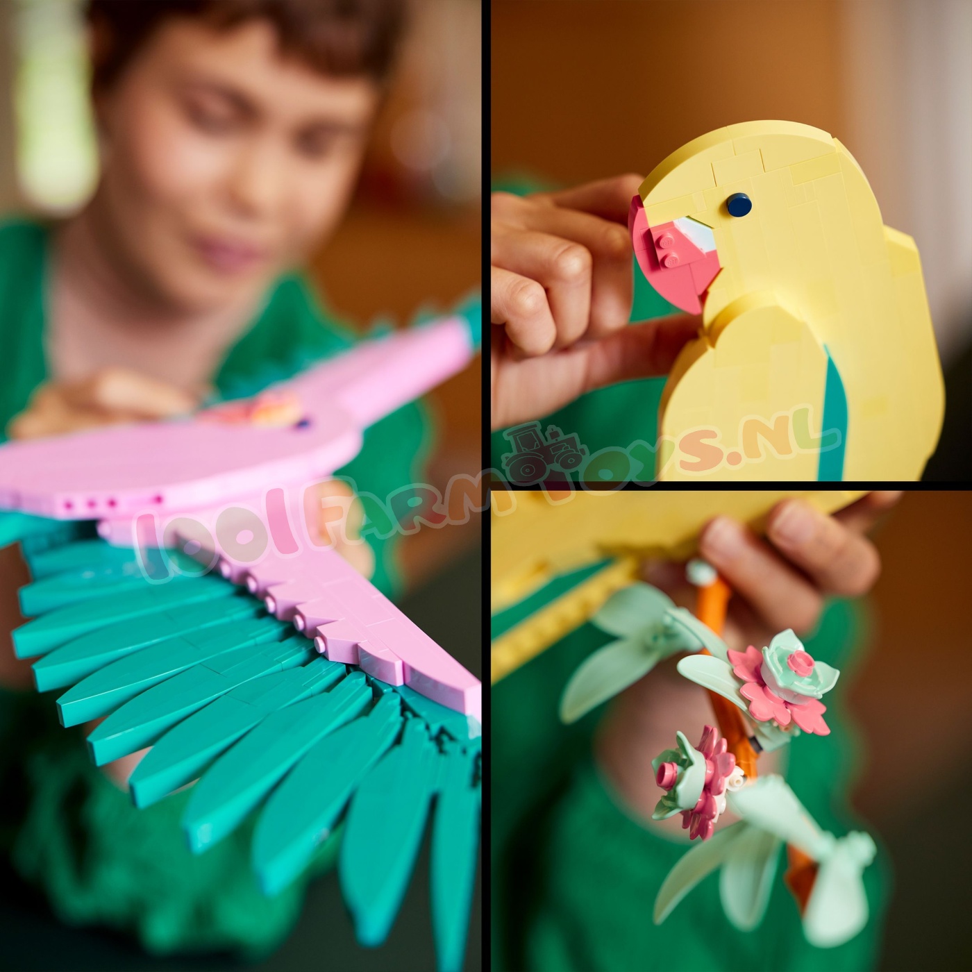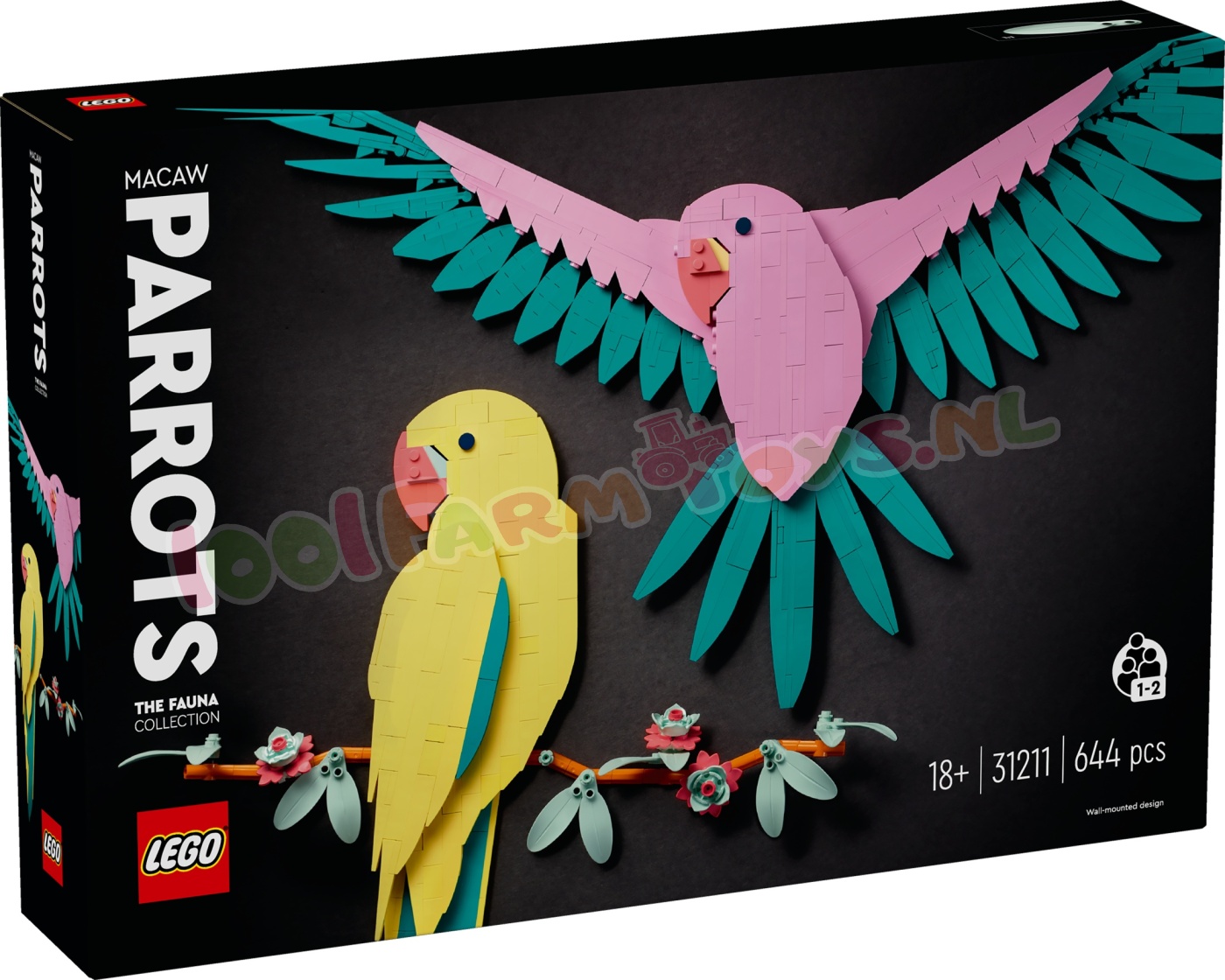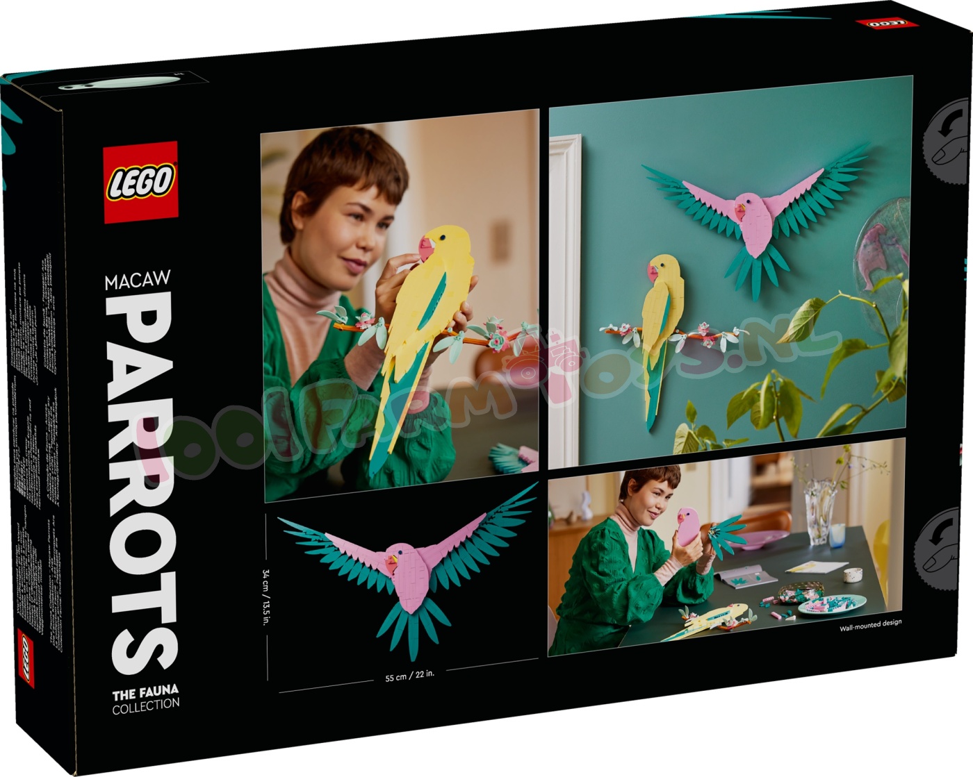 Haal een stukje natuur in huis met deze levendige LEGO® Art De Faunacollectie – Kleurrijke papegaaien (31211) bouwset. Het is een ideale decoratieve cadeautip waarmee volwassen bouwers een prachtige en kleurrijke scène kunnen creëren met 2 papegaaienmodellen. Dit LEGO kunstwerk zonder lijst kan niet worden neergezet en is ontworpen om aan de muur te hangen.Dit stijlvolle 3D-kunstwerk om zelf te bouwen toont 2 exotische. kleurrijke papegaaien: een gele papegaai op een tak versierd met bloemen en een roze papegaai in de lucht met uitgestrekte vleugels. De set is inclusief 2 bouwinstructies. zodat volwassen LEGO fans samen met een geliefde de papegaaien kunnen maken als onderdeel van een ontspannende en sociale ervaring.Deze LEGO Art bouwset biedt volwassenen een boeiend project. waarbij ze hun eigen blikvanger maken en genieten van een ontspannende creatieve activiteit. Er zijn diverse sets in het assortiment voor iedereen met een passie voor muziek. kunst. interieurontwerp of films. Papegaaienkunstwerk – haal een stukje natuur in huis met deze Kleurrijke papegaaien bouwset Natuurlijke kunst aan de muur – gebruik de 644 LEGO® stenen uit de set om een vrolijk tafereel te creëren met 2 kleurrijke papegaaien: de een zit op eenbloeiende tak en de andere vliegt met gespreide vleugels Hangend display – dit frameloze LEGO® kunstwerk kan niet worden neergezet en is ontworpen om aan de muur te worden gehangen Een sociale bouwervaring – deze papegaaienset bevat 2 bouwinstructies. zodat je het model samen met iemand anders kunt bouwen LEGO® Art bouwsets voor volwassenen – een cadeautip voor volwassen LEGO® fans die ervan houden om helemaal op te gaan in een creatieve activiteit en een boeiend bouwproject op zich te nemen Muurdecoratie voor woonkamers – elke set geeft volwassenen de kans om hun eigen kunstwerk te creëren voor thuis of op kantoor Afmetingen – de 644-delige set bevat een gele papegaai van ca. 40 cm hoog en een roze papegaai van ca. 35 cm hoog.