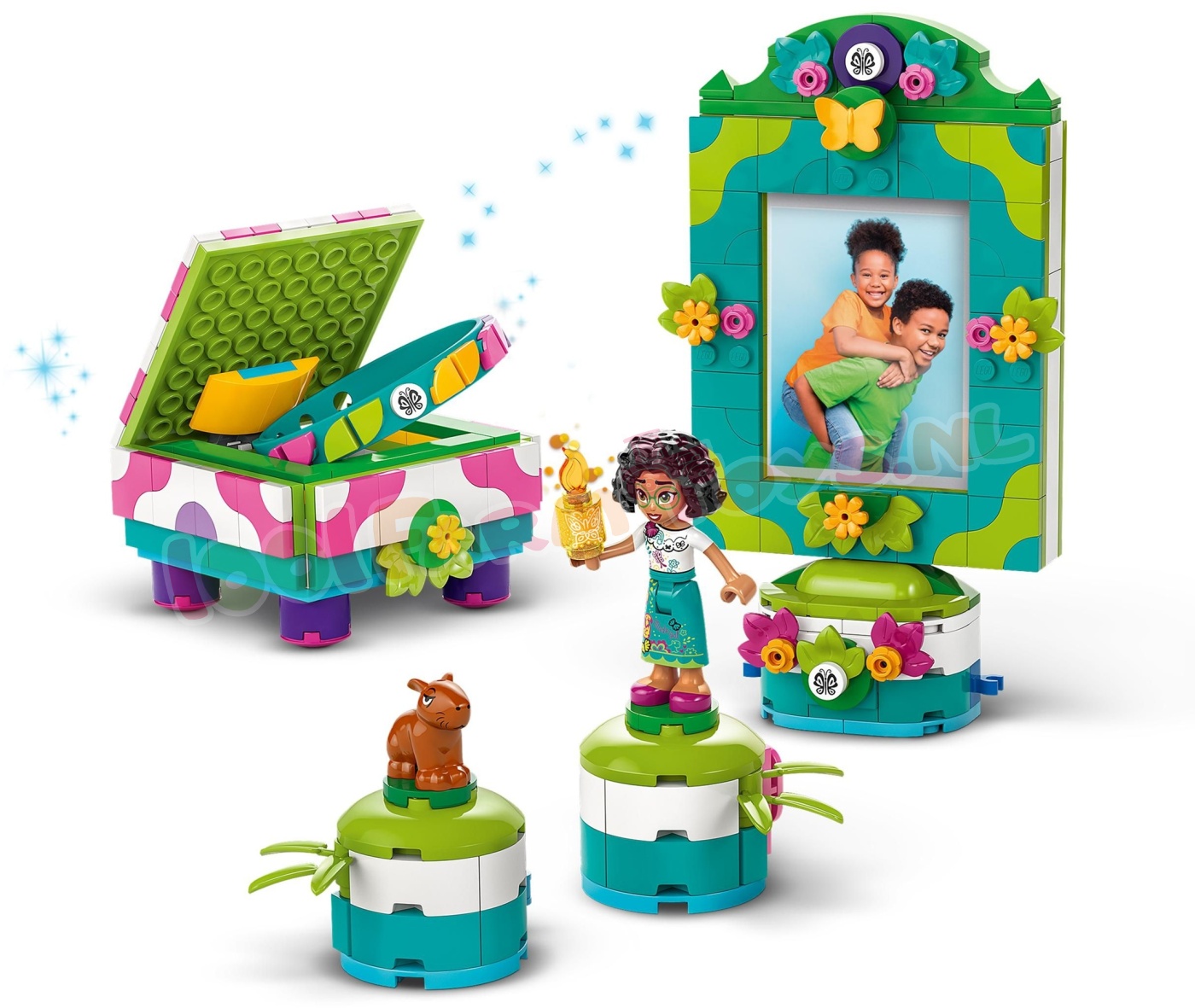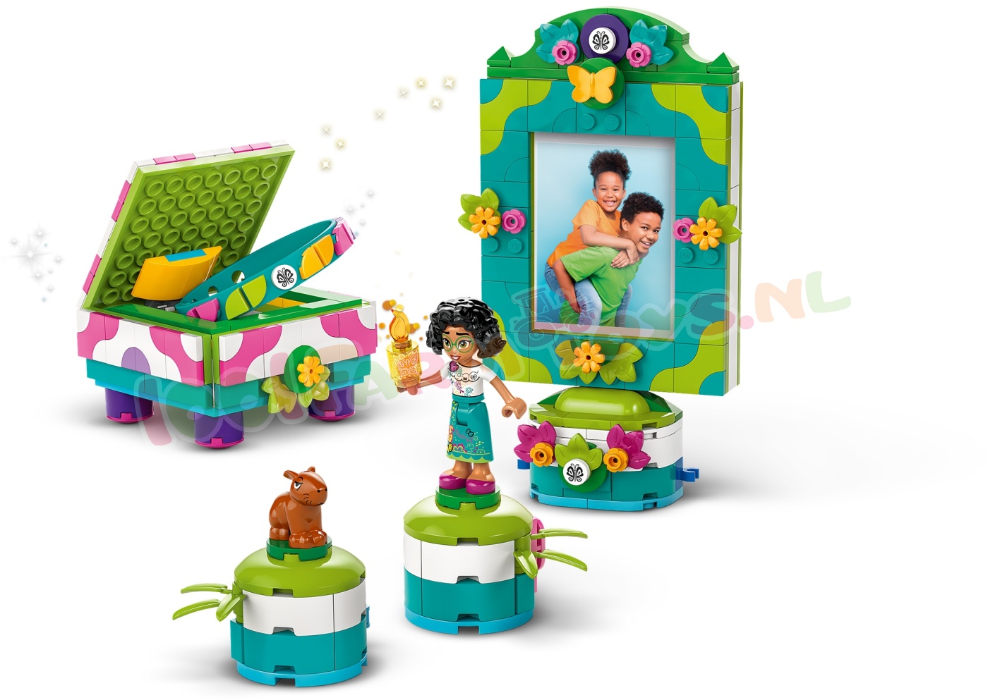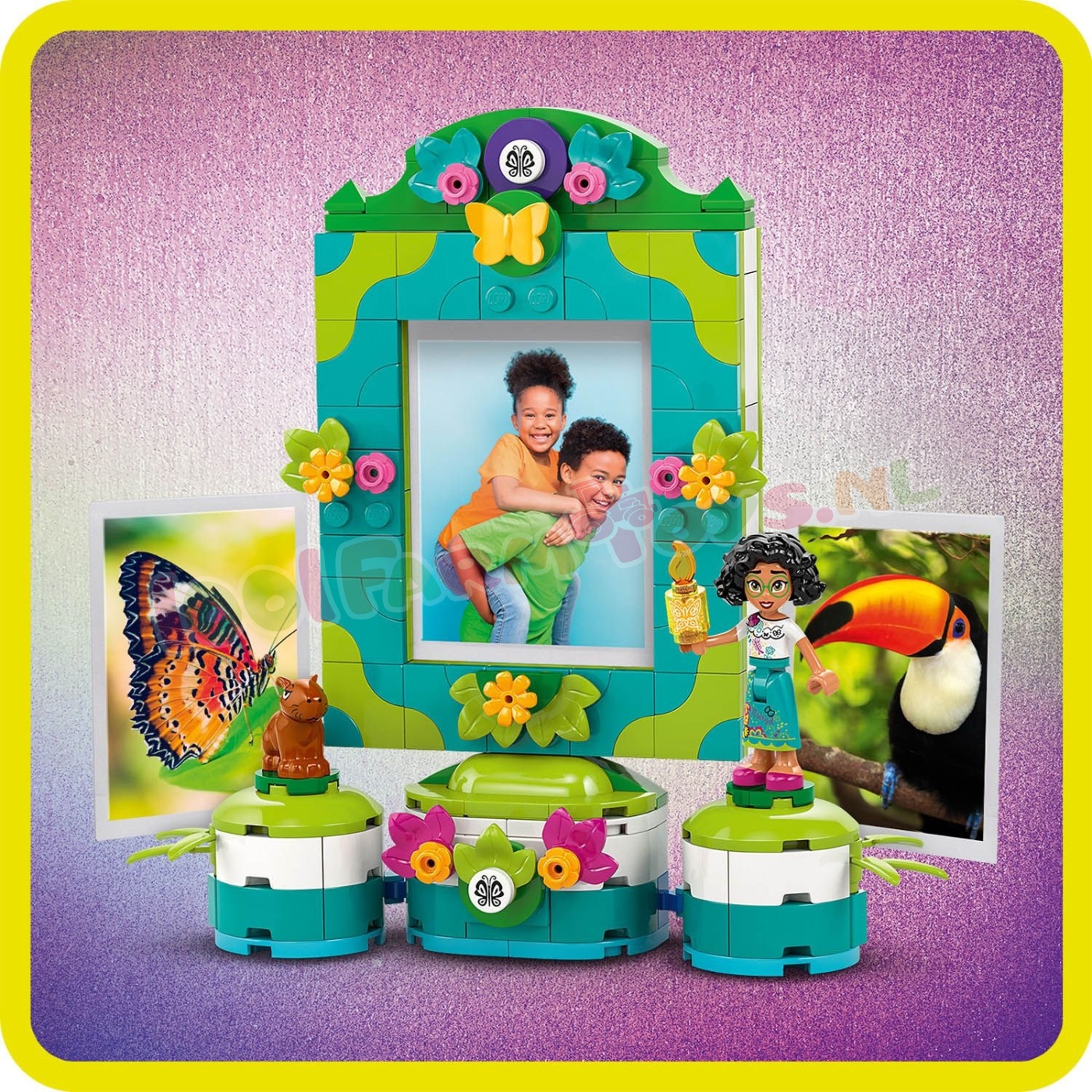 Spreek Disney fans van 6 jaar en ouder aan met dit creatieve LEGO® | Disney Encanto Mirabels fotolijstje en sieradendoos (43239) bouwspeelgoed. De set bestaat uit een juwelendoosje met ruimte voor de meegeleverde armband. plus een fotolijstje en standaard met extra clips voor kleine foto's en 2 plekken voor het Mirabel LEGO | Disney minipoppetje en de LEGO | Disney capibarafiguur.Deze kleurrijke Disney bouwset met meerdere voorwerpen is gemaakt om creatieve kinderen te inspireren. Het is een leuk cadeau voor meisjes. jongens en fans die op zoek zijn naar een nieuwe creatieve uitlaatklep. Bouwers genieten ook van een eenvoudige en intuïtieve bouwervaring met de LEGO Builder app. Hiermee kunnen ze inzoomen en modellen in 3D draaien. sets opslaan en hun voortgang bijhouden.Deze set is gemaakt voor korte speelsessies en kan worden toegevoegd aan andere LEGO sets en LEGO | Disney bouwspeelgoed uit de serie (elke set is apart verkrijgbaar) om het speelplezier uit te breiden. LEGO® | Disney Encanto ontwerpset voor kinderen – met de bouwset Mirabels fotolijstje en sieradendoos kunnen meisjes en jongens vanaf 6 jaar veel plezier beleven terwijl ze hun creativiteit de vrije loop laten LEGO® fotolijst – de bouwbare set bevat een klein juwelendoosje. een fotolijstje met standaard en extra clips. een draagbare armband. plus een Mirabel LEGO | Disney Encanto minipoppetje Details uit Encanto – de bouwset bevat verhaalideeën zoals de kaars uit de film. een LEGO® | Disneycapibarafiguur en veel elementen om te versieren Ontwerpen en spelen – met deze LEGO® bouwset kunnen fans een juwelenkistje en een fotolijstje bouwen. de voorwerpen samen met de armband versieren en hun ontwerpen op elk gewenst moment aanpassen Creatief Encanto cadeau voor kinderen – een leuk cadeau voor meisjes. jongens en Disney fans vanaf 6 jaar: een fantasierijke verrassing uit een film waar ze dol op zijn LEGO® | Disney plezier – Encanto fans kunnen het speelplezier uitbreiden door dezebouw- en speelset toe te voegen aan andere LEGO sets (apart verkrijgbaar) uit het Disney assortiment Ontdek je passie – deze bouwset met 2 decoratieve modellen en een armband die eindeloos kunnen worden aangepast stimuleert spelenderwijs de interesse voor design en belangrijke vaardigheden Afmetingen – deze 334-delige speelset bevat een bouwbaar fotolijstje van ca. 15 cm hoog. 14 cm breed en 5 cm diep.