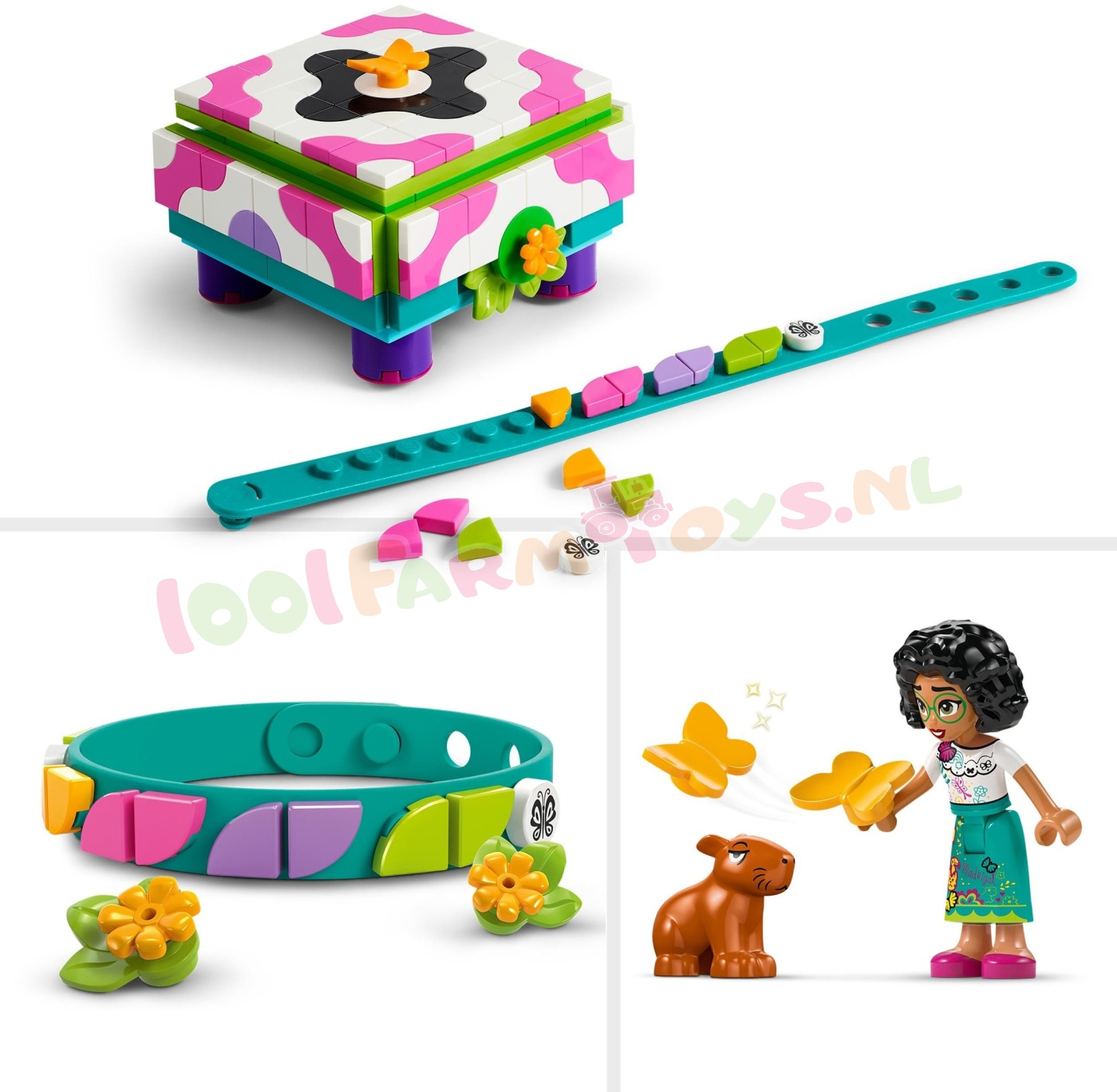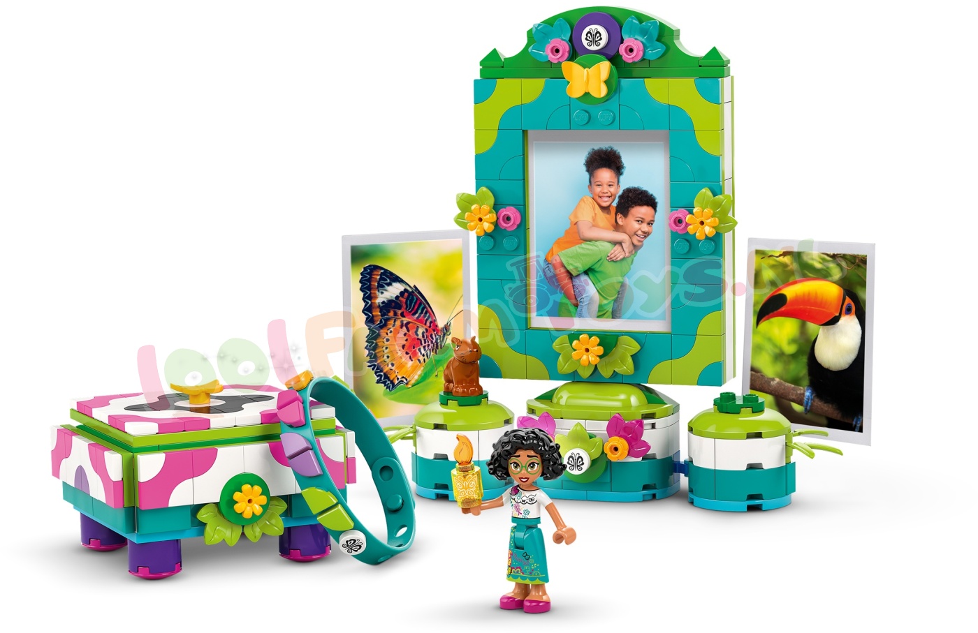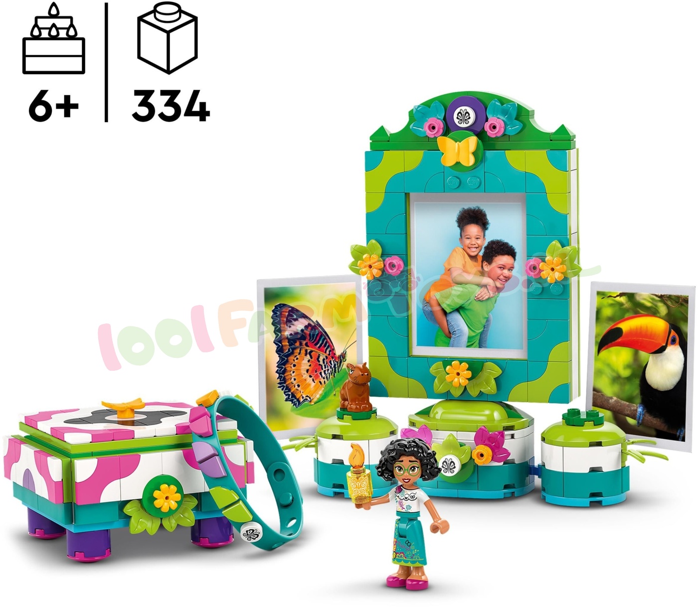 Spreek Disney fans van 6 jaar en ouder aan met dit creatieve LEGO® | Disney Encanto Mirabels fotolijstje en sieradendoos (43239) bouwspeelgoed. De set bestaat uit een juwelendoosje met ruimte voor de meegeleverde armband. plus een fotolijstje en standaard met extra clips voor kleine foto's en 2 plekken voor het Mirabel LEGO | Disney minipoppetje en de LEGO | Disney capibarafiguur.Deze kleurrijke Disney bouwset met meerdere voorwerpen is gemaakt om creatieve kinderen te inspireren. Het is een leuk cadeau voor meisjes. jongens en fans die op zoek zijn naar een nieuwe creatieve uitlaatklep. Bouwers genieten ook van een eenvoudige en intuïtieve bouwervaring met de LEGO Builder app. Hiermee kunnen ze inzoomen en modellen in 3D draaien. sets opslaan en hun voortgang bijhouden.Deze set is gemaakt voor korte speelsessies en kan worden toegevoegd aan andere LEGO sets en LEGO | Disney bouwspeelgoed uit de serie (elke set is apart verkrijgbaar) om het speelplezier uit te breiden. LEGO® | Disney Encanto ontwerpset voor kinderen – met de bouwset Mirabels fotolijstje en sieradendoos kunnen meisjes en jongens vanaf 6 jaar veel plezier beleven terwijl ze hun creativiteit de vrije loop laten LEGO® fotolijst – de bouwbare set bevat een klein juwelendoosje. een fotolijstje met standaard en extra clips. een draagbare armband. plus een Mirabel LEGO | Disney Encanto minipoppetje Details uit Encanto – de bouwset bevat verhaalideeën zoals de kaars uit de film. een LEGO® | Disneycapibarafiguur en veel elementen om te versieren Ontwerpen en spelen – met deze LEGO® bouwset kunnen fans een juwelenkistje en een fotolijstje bouwen. de voorwerpen samen met de armband versieren en hun ontwerpen op elk gewenst moment aanpassen Creatief Encanto cadeau voor kinderen – een leuk cadeau voor meisjes. jongens en Disney fans vanaf 6 jaar: een fantasierijke verrassing uit een film waar ze dol op zijn LEGO® | Disney plezier – Encanto fans kunnen het speelplezier uitbreiden door dezebouw- en speelset toe te voegen aan andere LEGO sets (apart verkrijgbaar) uit het Disney assortiment Ontdek je passie – deze bouwset met 2 decoratieve modellen en een armband die eindeloos kunnen worden aangepast stimuleert spelenderwijs de interesse voor design en belangrijke vaardigheden Afmetingen – deze 334-delige speelset bevat een bouwbaar fotolijstje van ca. 15 cm hoog. 14 cm breed en 5 cm diep.