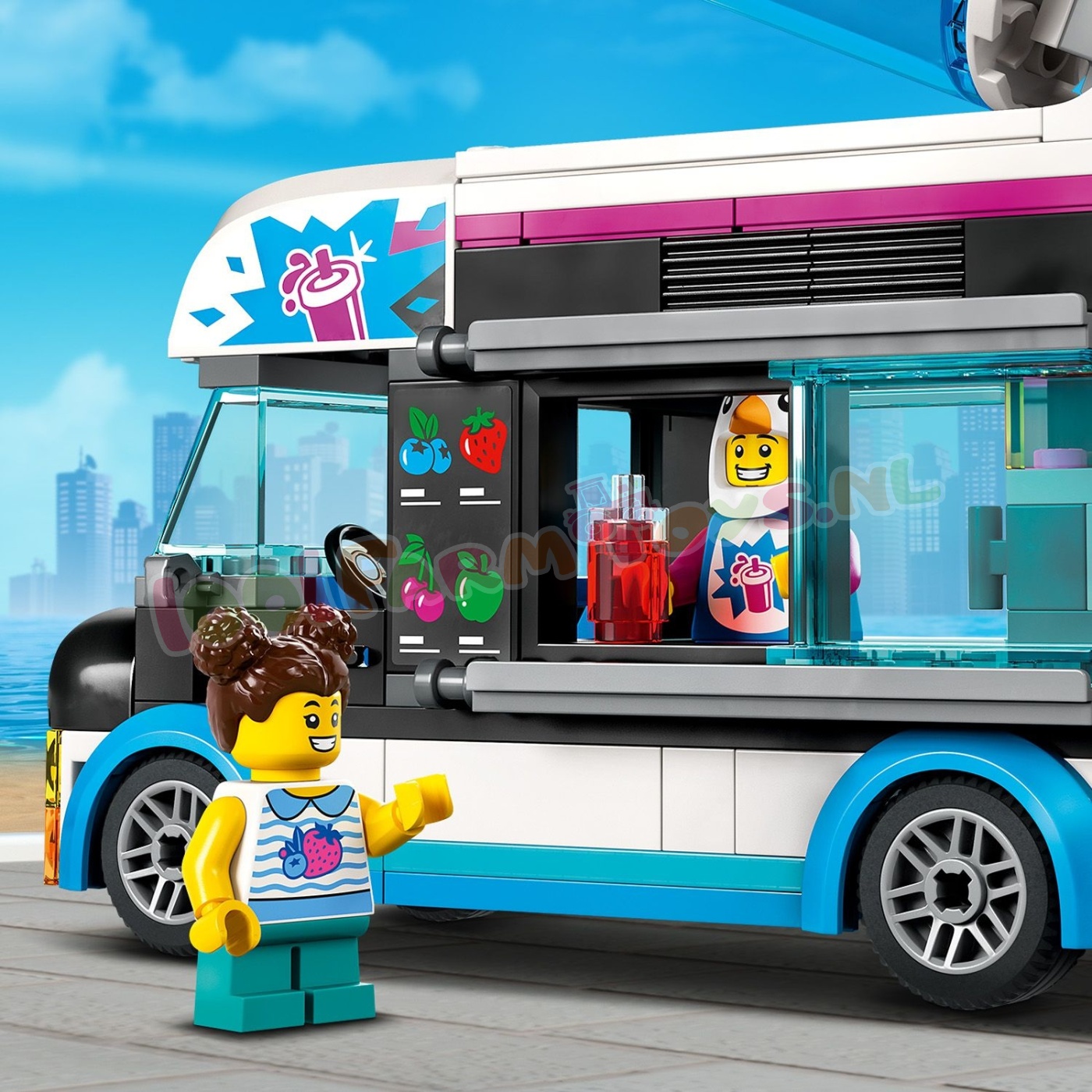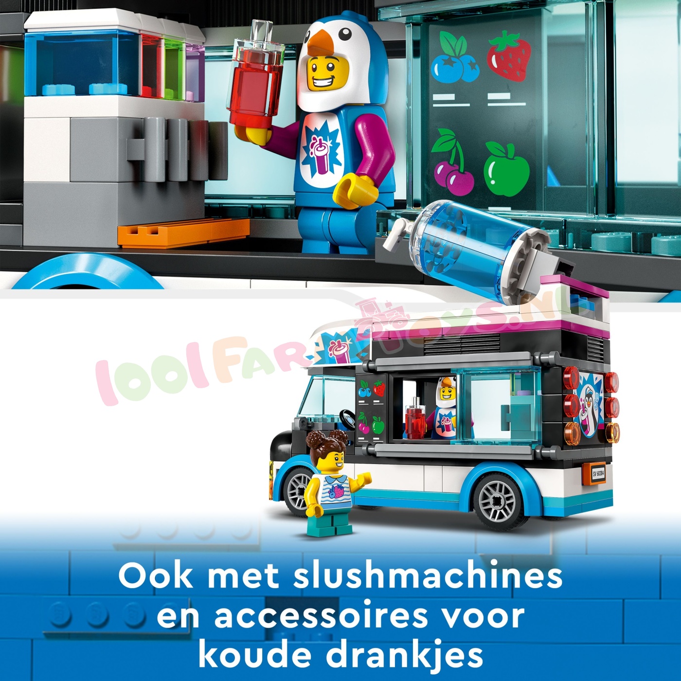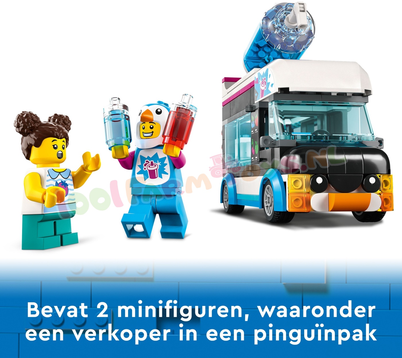Zorg voor een zomerse sfeer met de LEGO® City Pinguïn Slush truck (60384). Deze auto met pinguïnthema heeft veel coole functies en mogelijkheden voor fantasierijk spelen voor kinderen vanaf 5 jaar. inclusief een bereidingsruimte met 4 'slushmachines' en een schuifluik. Voeg de klant en de verkoper in pinguïnpak toe en de pret kan beginnen!Inclusief digitale bouwinstructiesDe LEGO City Pinguïn Slush truck wordt geleverd met eenvoudige bouwinstructies met afbeeldingen en de LEGO Builder app– een digitale bouwpartner met intuïtieve zoom- en draaifuncties waarmee kinderen hun model van alle kanten kunnen bekijken terwijl ze het bouwen.Spelenderwijs de wereld ontdekkenKinderen zien overal om zich heen interessante voertuigen en machines. Met de LEGO City Geweldige voertuigen bouwsets kunnen ze die van dichtbij ontdekken met realistische modellen en leuke personages die inspiratie bieden voor eindeloos speelplezier. Speelset met verkooptruck – de LEGO® City Geweldige voertuigen reeks is nog cooler geworden met deze Pinguïn Slush speelgoedtruck vol authentieke kenmerken en functies voor urenlang fantasierijk speelplezier Wat zit er in de doos – alles wat kinderen nodig hebben om de Pinguïn Slush truck te bouwen. plus 2 minifiguren waaronder een verkoper in pinguïnpak Net als in het echt – kinderen kunnen de zijkant van de wagen openen om toegang te krijgen tot een voorbereidingsruimte met 4 'slushmachines' en een schuifluik om klanten te bedienen Leuk speelgoed met een zomerse sfeer voor kinderen vanaf 5 jaar – geef de LEGO® City Pinguïn Slush truck (60384) speelset cadeau voor een verjaardag of een andere gelegenheid Afmetingen – de Pinguïn Slush truck is ca. 12 cm hoog. 14 cm lang en 6 cm breed LEGO® minifiguuraccessoires – inclusief speelgoedaccessoires zoals een pinguïnmuts voor de verkoper en 2 slushbekers Inclusief gedrukte en digitale bouwinstructies – met de LEGO® Builder app voor smartphones en tablets kunnen kinderen tijdens het bouwen inzoomen op hun model en het vanuit alle hoeken bekijken en draaien Kinderen leren spelenderwijs – LEGO® City bouwspeelgoedsets stimuleren het zelfvertrouwen en belangrijke vaardigheden van kinderen terwijl ze bouwen en spelen Speelgoed waar je op kunt bouwen – alle LEGO® onderdelen voldoen aan strikte industrienormen. waardoor ze consistent. compatibel en leuk om mee te bouwen zijn: dat is al zo sinds 1958 Tot het uiterste getest – LEGO® stenen en onderdelen worden gegooid. verhit. geplet. gedraaid en geanalyseerd om er zeker van te zijn dat ze voldoen aan strenge wereldwijde veiligheidsnormen.