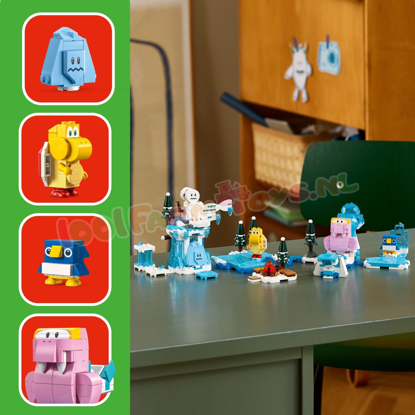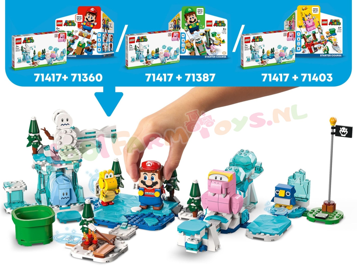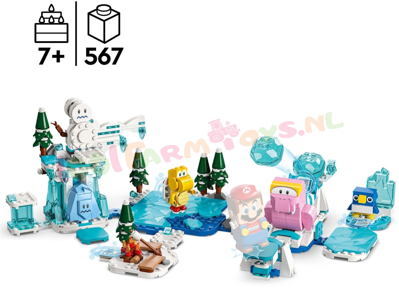 Kinderen kunnen spannend ijsplezier toevoegen aan hun LEGO® Super Mario™ wereld met de Uitbreidingsset: Fliprus' sneeuwavontuur (71417) inclusief 4 Super Mario™ personages. Spelers verdienen digitale munten door met hun LEGO® Mario™. LEGO® Luigi™ of LEGO® Peach™ figuren (niet inbegrepen) een rode Koopa Troopa. Freezie en een Fliprus te verslaan. te schaatsen op het 'ijs'. op te warmen bij het 'vuur' en een verborgen fruitelement aan de babypinguïn te geven. (Let op: je hebt de startset 71360. 71387 of 71403 nodig.)Bijbehorende appDownload de LEGO Super Mario app voor de bouwinstructies. plus inspirerende ideeën en nog meer coole dingen voor een nog leukere creatieve ervaring.TopcadeauDeze speelset om te verzamelen is een geweldig cadeau voor trendsetters van 7 jaar en ouder. Met de LEGO Super Mario startsets en uitbreidingssets kunnen fans hun eigen levels maken en aanpassen voor urenlang plezier en munten verzamelen. Bouwbare Uitbreidingsset: Fliprus' sneeuwavontuur (71417) – met deze LEGO® Super Mario™ uitbreidingsset kunnen kinderen een ijslevel vol actie creëren voor het verzamelen van digitale munten en fantasierijk speelplezier 4 LEGO® Super Mario™ figuren – inclusief een Fliprus. een Freezie. een rode Koopa Troopa en een babypinguïn IJsavonturen – help LEGO® Mario™. LEGO® Luigi™ of LEGO® Peach™ (figuren niet inbegrepen) het hoofd van de sneeuwpop te slaan. de rode Koopa Troopa te verslaan. te schaatsen op het 'ijs'. zich op te warmen bij het 'vuur' en meer Strijd met Fliprus en een fruitig cadeau – spring op het platform voor de ijsbal gooiende Fliprus en versla de Freezie om het verborgen fruitelement te bereiken en aan de babypinguïn te geven Cadeautip voor kinderen van 7 jaar en ouder – geef deze 567-delige set cadeau voor een verjaardag of de feestdagen aan kinderen die een LEGO® Super Mario™ startset (71360. 71387 of 71403) bezitten. Die is vereist om met deze set te kunnen spelen Herbouwen en combineren – deze modulaire set is ca. 13 cm hoog. 39 cm breed en 26 cm diep in de basisopstelling en kan worden gecombineerd met andere LEGO® Super Mario™ speelgoedsets Digitale instructies – download de LEGO® Super Mario™ app voor de bouwinstructies. creatieve inspiratie en meer. Ga naar LEGO.com/devicecheck voor een lijst met compatibele Android- en iOS-apparaten Stimuleer de verbeelding – LEGO® Super Mario™ speelgoedsets staan garant voor veel muntenverzamelplezier en eindeloze creatieve uitdagingen doordat ze uit te breiden en om te bouwen zijn. Ze zijn ideaal om alleen of juist samen mee te spelen Topkwaliteit – al sinds 1958 voldoen LEGO® onderdelen aan strikte industrienormen om ervoor te zorgen dat ze eenvoudig en stevig op elkaar passen en robuuste modellen opleveren Veiligheid is onze prioriteit – LEGO® bouwstenen worden op vrijwel alle mogelijke manieren getest om er zeker van te zijn dat ze voldoen aan hoge wereldwijde veiligheidsnormen.