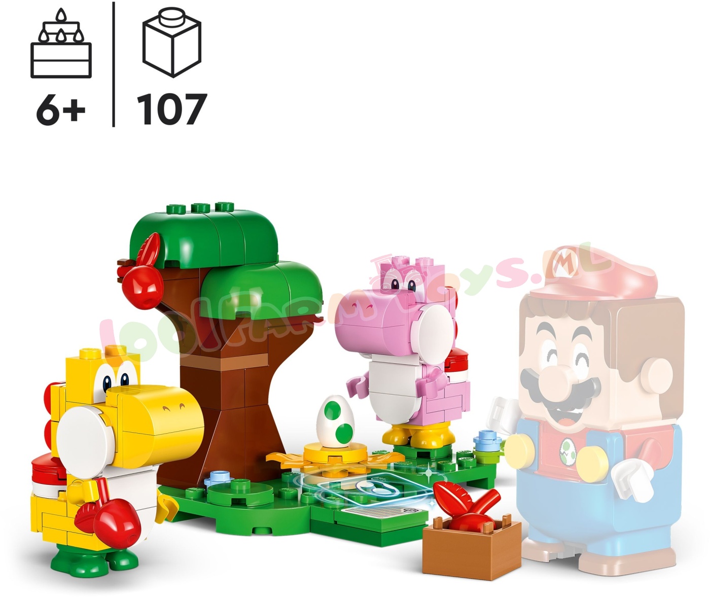 Laat het rollenspel beginnen met Yoshi's eigenaardige woud met dit LEGO® Super Mario™ bouwspeelgoed voor kinderen (71428) vanaf 6 jaar. Dit coole cadeau voor gamers bevat roze Yoshi en gele Yoshi LEGO Super Mario speelgoedfiguren. plus een bouwbaar bos met een appelboom en een Yoshi-ei element. Help de Yoshi's om appels uit de boom te verzamelen. doe ze in een mand en zorg voor het Yoshi-ei.Voeg voor interactief spelen een LEGO® Mario™. LEGO® Luigi™ of LEGO® Peach™ figuur toe uit een LEGO Super Mario startset (71360. 71387 of 71403 – elk apart verkrijgbaar). Als een interactieve figuur op de actietag springt. verschijnt er een ei op het digitale scherm. Wieg de figuur als een baby om het digitale ei uit te broeden en kijk welke Yoshi je op het buikscherm krijgt. Spring en draai dan om de stem van de Yoshi te activeren.Je vindt de bouwinstructies voor deze uitbreidingsset in de LEGO Super Mario app. die ook inspiratie biedt voor verschillende manieren om te bouwen en te spelen. Yoshi verzamelspeelgoed voor kinderen met een LEGO® Yoshi-ei element – speel rollenspellen in de LEGO® Super Mario™ wereld met de Uitbreidingsset: Yoshi's eigenaardige woud met een bouwbaar bos Inclusief 2 bouwbare Super Mario™ personages – help de roze Yoshi en gele Yoshi voor het Yoshi-ei te zorgen. verzamel appels uit de boom en leg ze in een mand Interactief spelen – nodig LEGO® Mario™. LEGO® Luigi™ of LEGO® Peach™ (figuren niet inbegrepen) uit om naar het bos te komen en spring op de actietag om een ei op hun digitale scherm te laten verschijnen Broed het digitale Yoshi-ei uit – wieg de interactieve figuur als een baby om het digitale ei uit te broeden. spring en draai ermee om de stem van Yoshi te activeren. en meer Cadeau voor kinderen vanaf 6 jaar – geef deze 107-delige set cadeau voor de feestdagen aan meisjes. jongens en gamers. Voor interactief spelen is een LEGO® Super Mario™ startset (71360. 71387 of 71403) vereist Bouwen met behulp van een app – download de LEGO® Super Mario™ app voor de bouwinstructies. creatieve inspiratie en meer. Ga naar LEGO.com/devicecheck voor een lijst met compatibele Android- en iOS-apparaten Inspireer kinderen – LEGO® Super Mario™ speelsets staan voor rollenspel. digitaal munten verzamelen en creatieve uitdagingen doordat ze uit te breiden en om te bouwen zijn. Ze zijn ideaal om alleen of juist samen mee te spelen Bouwbaar bos – Yoshi's woud is ca. 7 cm hoog. 11 cm breed en 7 cm diep en kan worden toegevoegd aan andere LEGO® Super Mario™ sets.