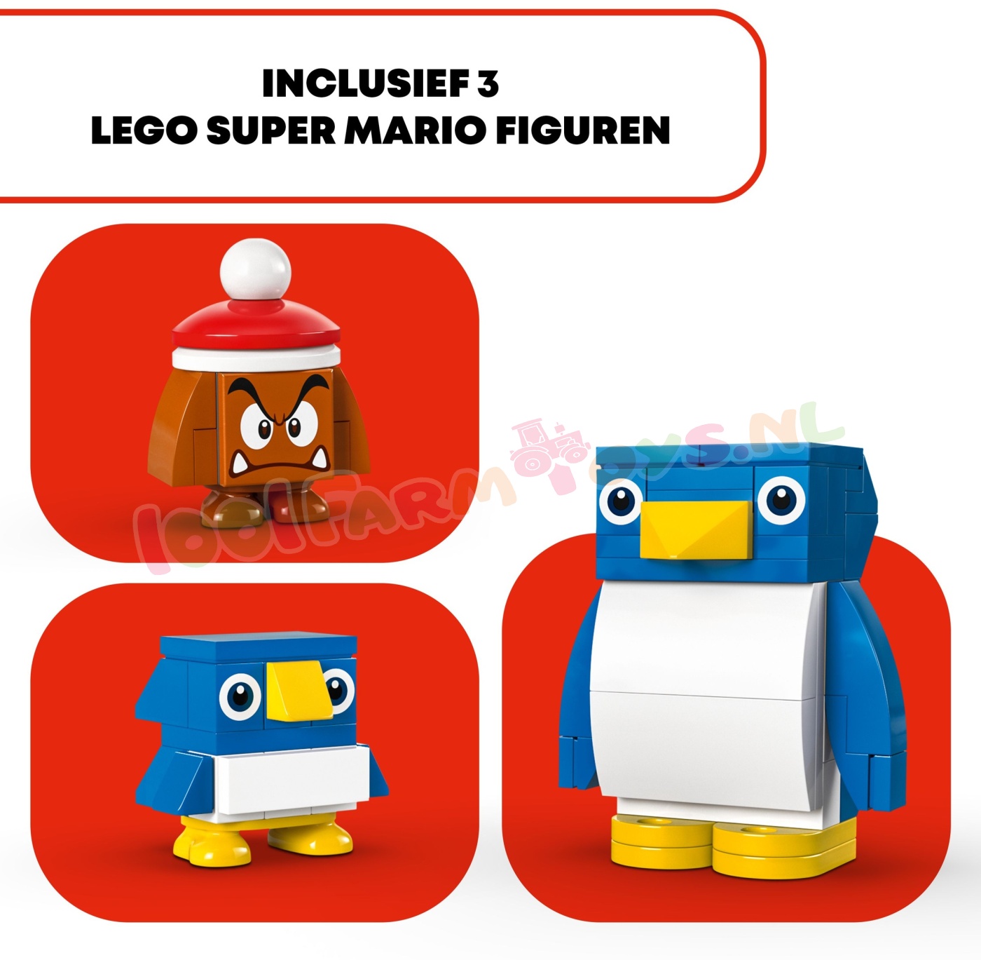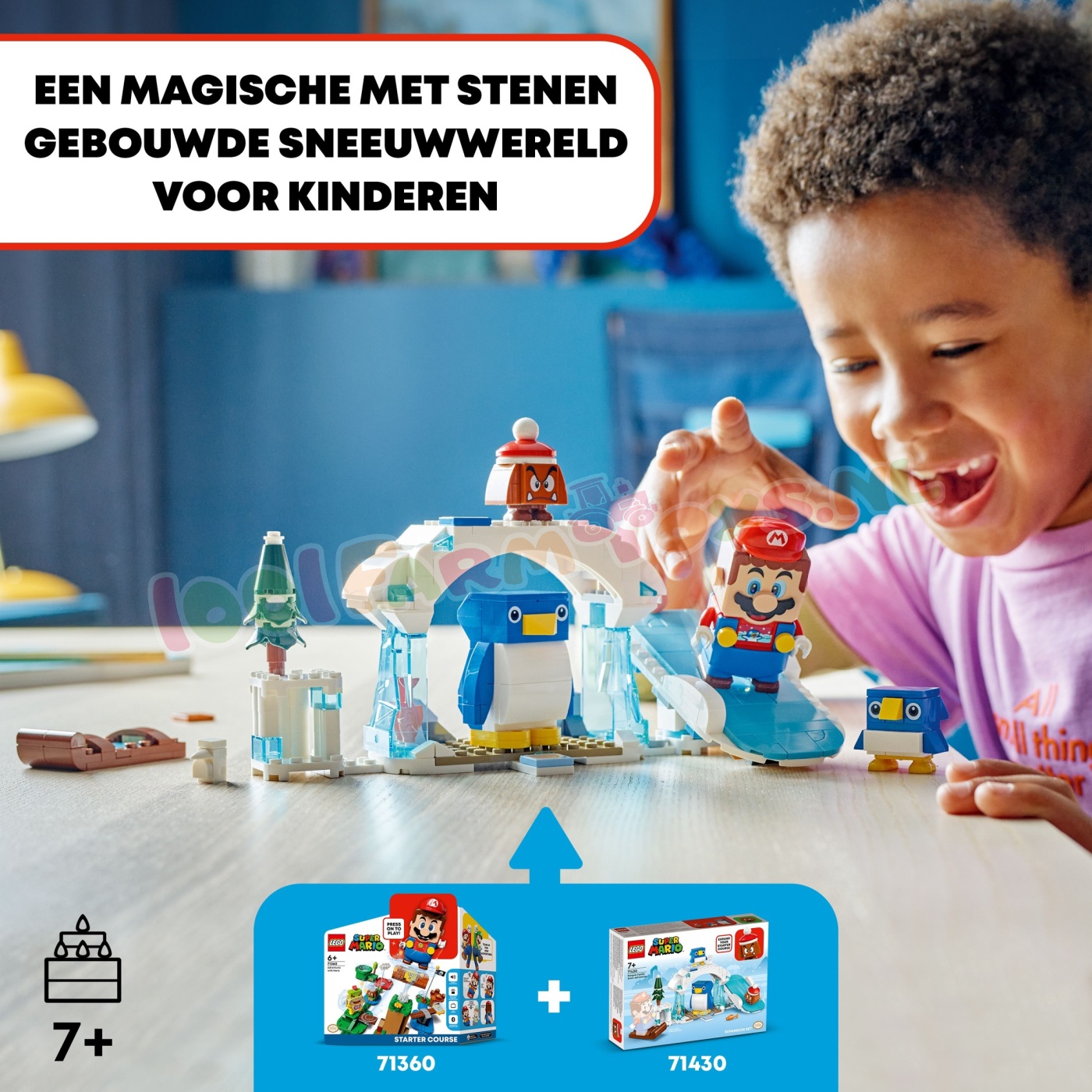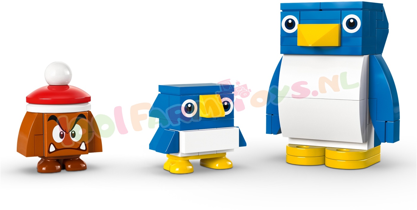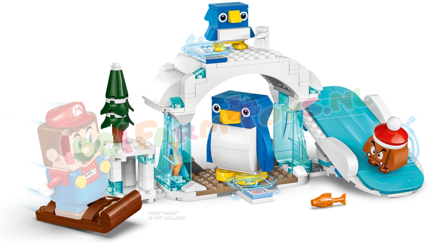 Speel rollenspellen en maak een leuk level met de LEGO® Super Mario™ Uitbreidingsset: Sneeuwavontuur met penguin en familie (71430). Dit bouwspeelgoed voor kinderen vanaf 7 jaar bevat 3 Super Mario™ personages – een van LEGO® stenen gebouwde Penguin. een babypinguïn en een Goomba figuur met winterse muts – plus een bouwbare ijsgrot. een 'ijsglijbaan' die kan worden omgebouwd tot een ijsbaan. 2 visfiguren en een slee voor creatief speelplezier.Voeg voor interactief spelen een LEGO® Mario™. LEGO® Luigi™ of LEGO® Peach™ figuur toe uit een LEGO Super Mario startset (71360. 71387 of 71403 – elk apart verkrijgbaar) en verdien digitale munten voor het herenigen van de babypinguïn met zijn ouder. het verslaan van de Goomba en meer.Deze set is een leuk cadeau voor gamers. Download de bijbehorende LEGO Super Mario app voor de bouwinstructies. fantasierijke bouw- en speelideeën en een veilige omgeving waar kinderen hun creaties met andere fans kunnen delen. LEGO® Super Mario™ bouwspeelgoed voor kinderen met een Goomba figuur – speel in een ijsgrot. ga sleeën en schaatsen met de Uitbreidingsset: Sneeuwavontuur met penguin en familie Inclusief 3 LEGO® Super Mario™ personages – een van LEGO® stenen gebouwde Penguin. een babypinguïn en een Goomba figuur met wintermuts. plus 2 visfiguren Rollenspelplezier – hang rond met de pinguïns in de grot. help ze van de 'ijsglijbaan' te sleeën of verander deze in een ijsbaan Interactief digitaal spelen – help LEGO® Mario™. LEGO® Luigi™ of LEGO® Peach™ (figuren niet inbegrepen) om de babypinguïn met zijn ouder te herenigen. op het 'ijs' te sleeën. de Goomba te verslaan en meer Cadeau voor gamers vanaf 7 jaar – geef deze kleine LEGO® set als verrassingscadeau aan kinderen. Voor interactief spelen is een LEGO® Super Mario™ startset (71360. 71387 of 71403) vereist De LEGO® Super Mario™ app – download de app voor de bouwinstructies. creatieve inspiratie en meer. Ga naar LEGO.com/devicecheck voor een lijst met compatibele Android- en iOS-apparaten Stimuleer de creativiteit van kinderen – LEGO® Super Mario™ speelsets staan voor rollenspel. digitaal munten verzamelen en creatieve uitdagingen. Ze zijn ideaal om alleen of juist samen mee te spelen Creëer een ijslevel – dit modulaire bouwspeelgoed met 228 onderdelen is ca. 9 cm hoog. 22 cm breed en 12 cm diep en kan worden gecombineerd met andere LEGO® Super Mario™ sets.