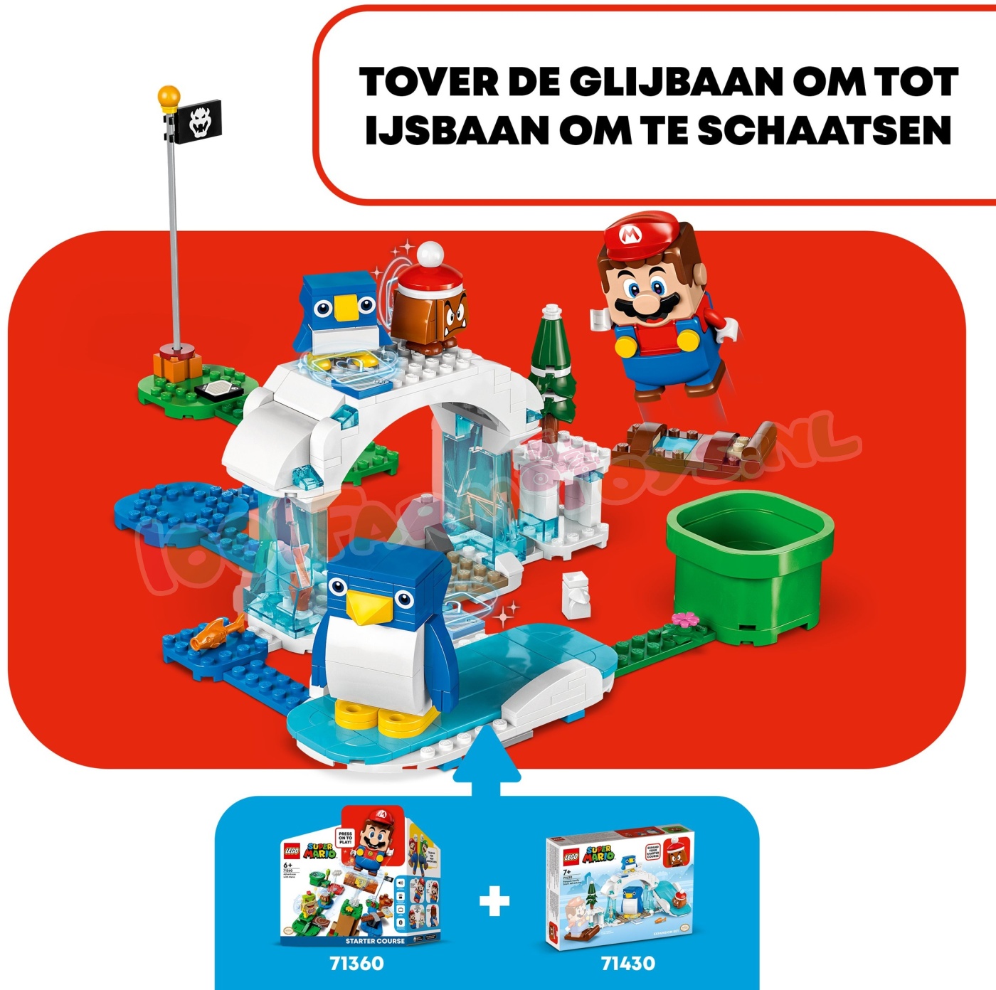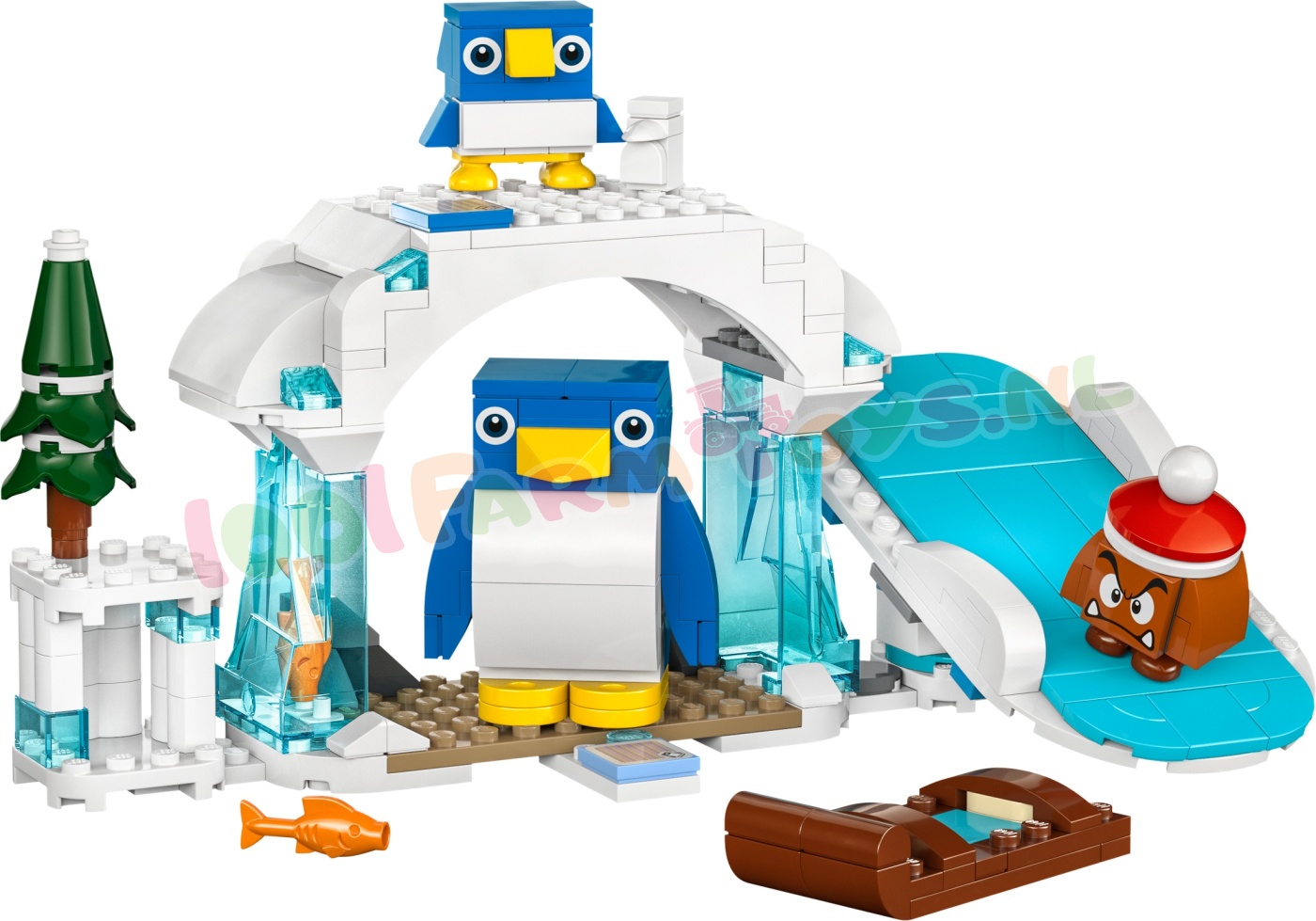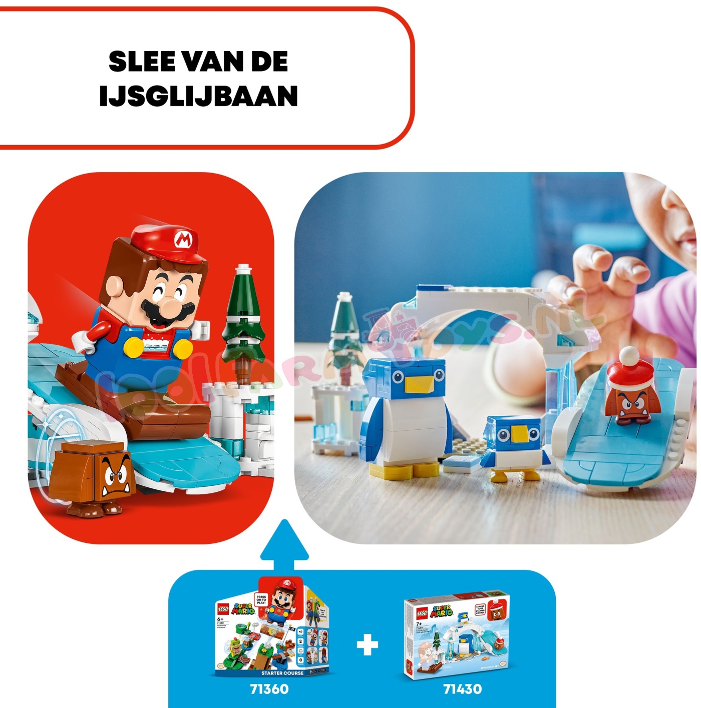 Speel rollenspellen en maak een leuk level met de LEGO® Super Mario™ Uitbreidingsset: Sneeuwavontuur met penguin en familie (71430). Dit bouwspeelgoed voor kinderen vanaf 7 jaar bevat 3 Super Mario™ personages – een van LEGO® stenen gebouwde Penguin. een babypinguïn en een Goomba figuur met winterse muts – plus een bouwbare ijsgrot. een 'ijsglijbaan' die kan worden omgebouwd tot een ijsbaan. 2 visfiguren en een slee voor creatief speelplezier.Voeg voor interactief spelen een LEGO® Mario™. LEGO® Luigi™ of LEGO® Peach™ figuur toe uit een LEGO Super Mario startset (71360. 71387 of 71403 – elk apart verkrijgbaar) en verdien digitale munten voor het herenigen van de babypinguïn met zijn ouder. het verslaan van de Goomba en meer.Deze set is een leuk cadeau voor gamers. Download de bijbehorende LEGO Super Mario app voor de bouwinstructies. fantasierijke bouw- en speelideeën en een veilige omgeving waar kinderen hun creaties met andere fans kunnen delen. LEGO® Super Mario™ bouwspeelgoed voor kinderen met een Goomba figuur – speel in een ijsgrot. ga sleeën en schaatsen met de Uitbreidingsset: Sneeuwavontuur met penguin en familie Inclusief 3 LEGO® Super Mario™ personages – een van LEGO® stenen gebouwde Penguin. een babypinguïn en een Goomba figuur met wintermuts. plus 2 visfiguren Rollenspelplezier – hang rond met de pinguïns in de grot. help ze van de 'ijsglijbaan' te sleeën of verander deze in een ijsbaan Interactief digitaal spelen – help LEGO® Mario™. LEGO® Luigi™ of LEGO® Peach™ (figuren niet inbegrepen) om de babypinguïn met zijn ouder te herenigen. op het 'ijs' te sleeën. de Goomba te verslaan en meer Cadeau voor gamers vanaf 7 jaar – geef deze kleine LEGO® set als verrassingscadeau aan kinderen. Voor interactief spelen is een LEGO® Super Mario™ startset (71360. 71387 of 71403) vereist De LEGO® Super Mario™ app – download de app voor de bouwinstructies. creatieve inspiratie en meer. Ga naar LEGO.com/devicecheck voor een lijst met compatibele Android- en iOS-apparaten Stimuleer de creativiteit van kinderen – LEGO® Super Mario™ speelsets staan voor rollenspel. digitaal munten verzamelen en creatieve uitdagingen. Ze zijn ideaal om alleen of juist samen mee te spelen Creëer een ijslevel – dit modulaire bouwspeelgoed met 228 onderdelen is ca. 9 cm hoog. 22 cm breed en 12 cm diep en kan worden gecombineerd met andere LEGO® Super Mario™ sets.