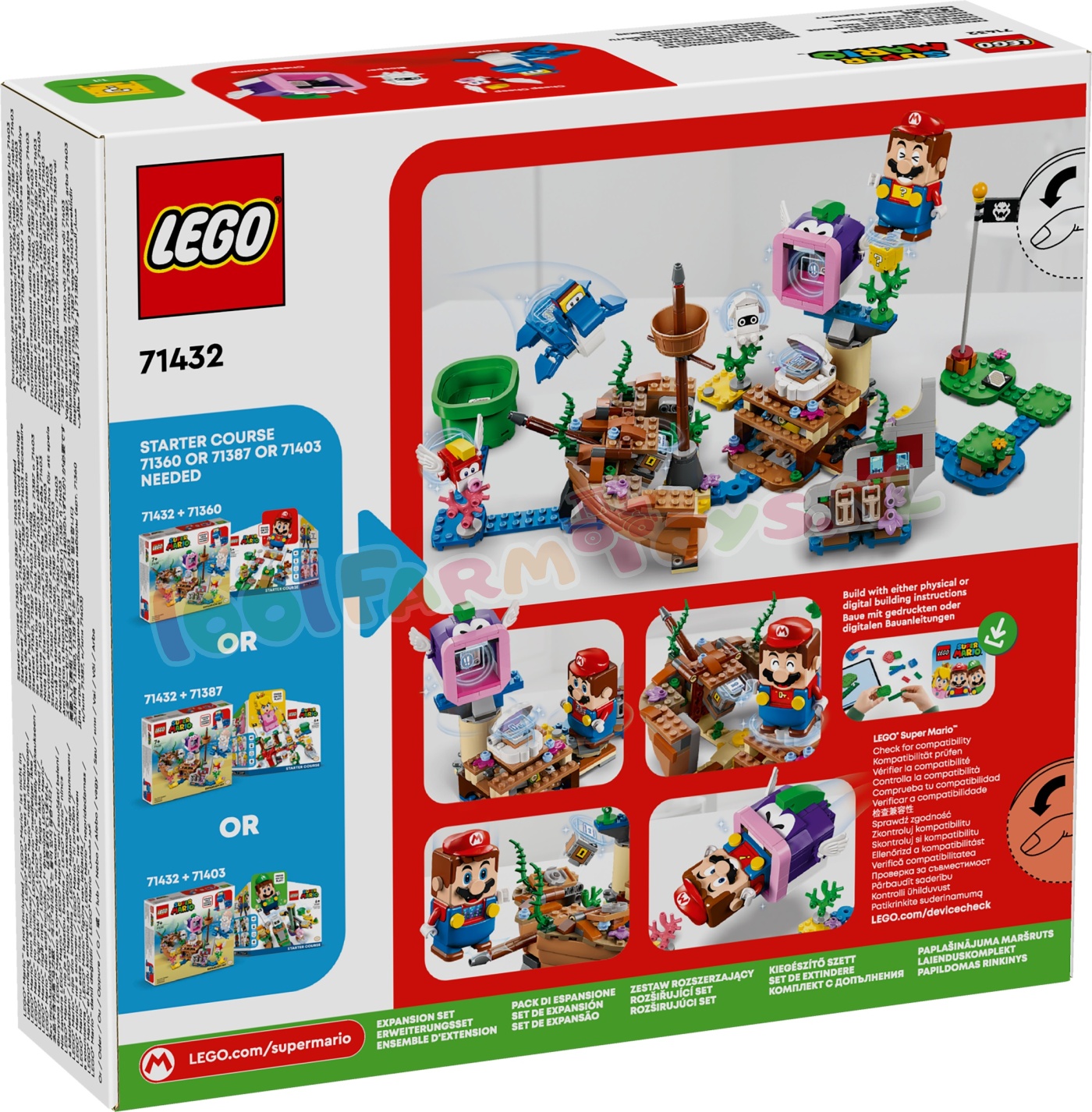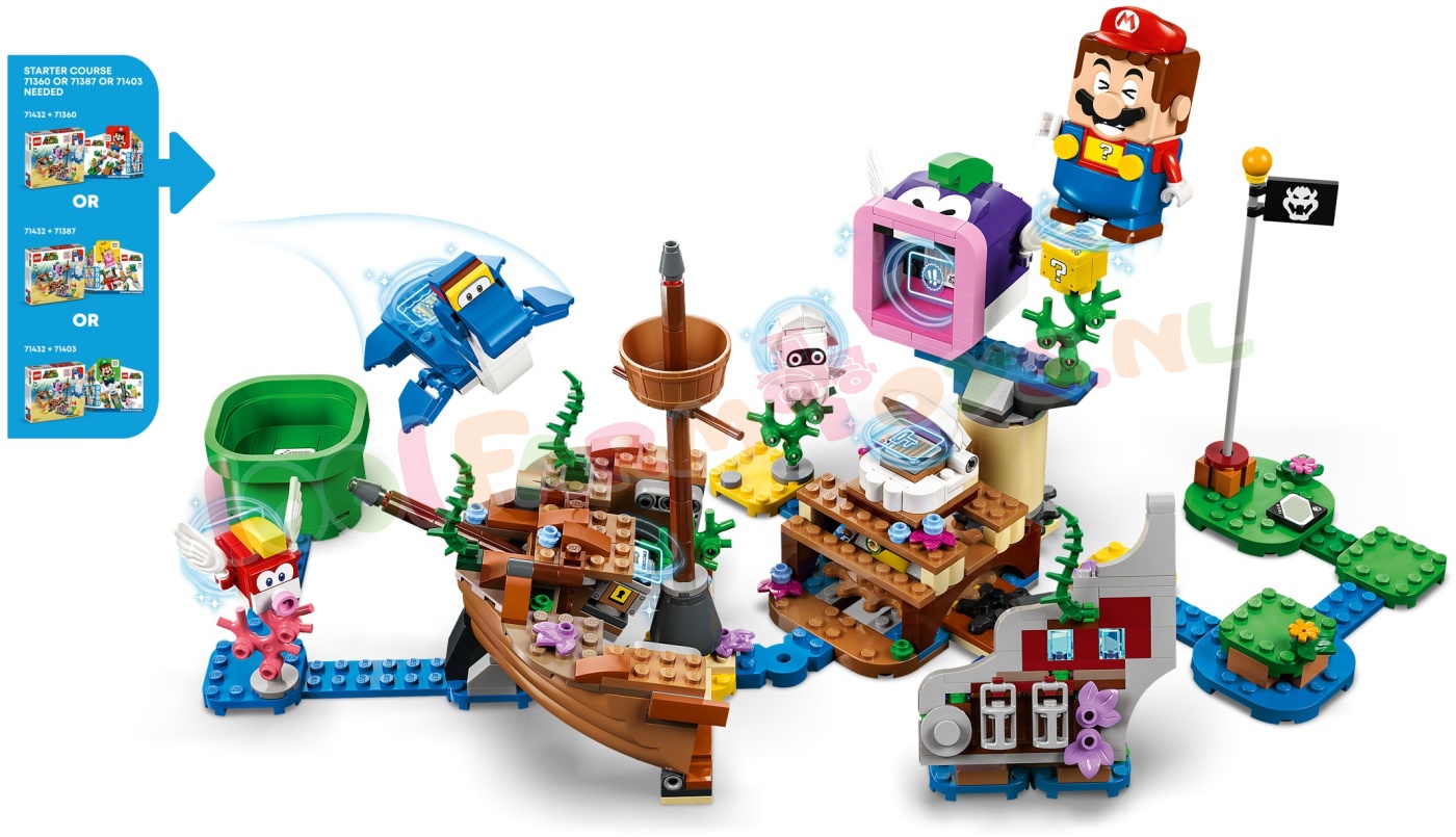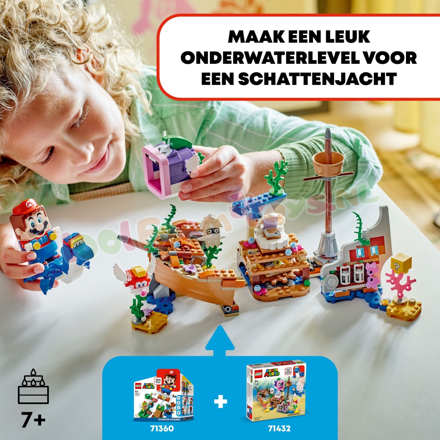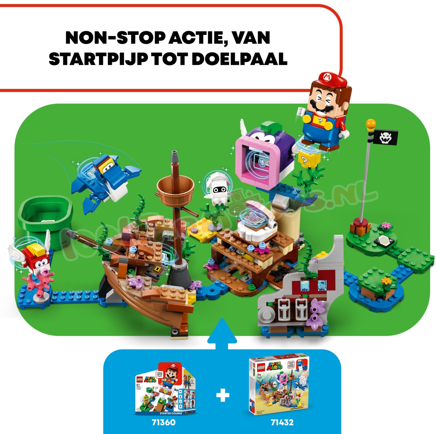 Creëer een spannend LEGO® Super Mario™ onderwaterlevel voor een schattenjacht met de Uitbreidingsset: Dorries gezonken scheepswrak (71432). Rijd op een Dorrie met een interactieve LEGO® Mario™. LEGO® Luigi™ of LEGO® Peach™ figuur (figuren niet inbegrepen) en verken het scheepswrak. Let op: voor interactief spelen is de startset 71360. 71387 of 71403 vereist.Dit bouwspeelgoed voor kinderen vanaf 7 jaar wordt geleverd met 4 bouwbare LEGO Super Mario™ personages: Dorrie. een Cheep Cheep. Cheep Chomp en Blooper. Draai aan het platform om het sleutelblok te ontdekken dat verborgen is in de schelp en open de schatkist om de edelsteen te pakken. Het ?-blok biedt willekeurige beloningen en de Cheep Chomp kan op een interactieve figuur in zijn mond kauwen voor leuke digitale reacties.In de LEGO Super Mario app vind je de bouwinstructies. De app biedt kinderen daarnaast creatieve bouw- en speelideeën en een veilige omgeving waar ze hun creaties kunnen delen. Uitbreidingsset: Dorries gezonken scheepswrak – voeg een avontuurlijke speurtocht toe aan de LEGO® Super Mario™ wereld van kinderen met dit bouwbare scheepswrak 4 bouwbare Super Mario™ personages – rijd op een Dorrie met LEGO® Mario™. LEGO® Luigi™ of LEGO® Peach™ (figuren niet inbegrepen) en versla de Cheep Cheep. Cheep Chomp en Blooper Interactief avonturenspeelgoed voor plezier met het hele gezin – verken het scheepswrak met een interactieve figuur. draai het platform om het sleutelblok in de schelp te onthullen en open de schatkist om de edelsteen te pakken Verzamelspeelgoed voor kinderen – ontvang willekeurige beloningen van het ?-blok en zie hoe een interactieve figuur reageert als de Cheep Chomp erop kauwt Cadeau voor gamers vanaf 7 jaar – deze 500-delige set is een leuk cadeau voor kinderen. Voor interactief spelen is een LEGO® Super Mario™ startset (71360. 71387 of 71403) vereist De LEGO® Super Mario™ app – download de app voor de bouwinstructies. inspirerende ideeën en meer. Ga naar LEGO.com/devicecheck voor een lijst met compatibele Android- en iOS-apparaten Voed de creativiteit van kinderen – LEGO® Super Mario™ speelgoed staat voor rollenspel. digitaal munten verzamelen en creatieve uitdagingen doordat het uit te breiden en om te bouwen is. Het is ideaal om alleen of juist samen mee te spelen Modulaire set – deze set is ca. 17 cm hoog. 30 cm breed en 21 cm diep in de basisopstelling en kan op verschillende manieren worden ingedeeld en gecombineerd met andere LEGO® Super Mario™ sets.