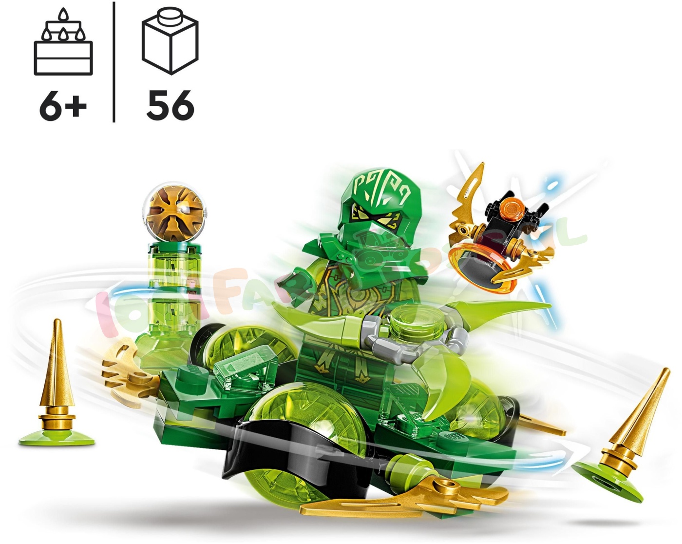 Met Lloyd's drakenkracht Spinjitzu Spin (71779) kunnen ninjafans van 6 jaar en ouder hun held trainen en hem helpen zijn Spinjitzuvaardigheden te verbeteren. gevoed door drakenkracht. Kinderen kunnen urenlang oefenen om drakenkracht Lloyd te laten navigeren door een hindernisbaan in het Grote Bos. alleen of met vrienden.Help een ninja Spinjitzuvaardigheden te ontwikkelenKinderen kunnen drakenkracht Lloyd in de spinner met 3 exclusieve groene drakenkrachtelementen plaatsen. eraan draaien en kijken hoe hij rondtolt. Hij moet de scherpe obstakels ontwijken. de Imperium Droid verslaan en de gouden drakenenergiekern uit de schaal te grijpen. Er is ook een groen drakenkrachtelement en kinderen kunnen er nog 4 verzamelen in verschillende kleuren in andere NINJAGO® sets.Een leuke digitale ervaring voor LEGO® fansLaat de LEGO Builder app jou en je kind begeleiden tijdens een eenvoudig en intuïtief bouwavontuur. Zoom in en draai modellen in 3D. bewaar sets en houd je voortgang bij. Speelgoedspinner – ninjafans van 6 jaar en ouder kunnen drakenkracht Lloyd trainen om door een hindernisbaan te navigeren met deze LEGO® NINJAGO® Lloyd's drakenkracht Spinjitzu Spin (71779) speelset 1 minifiguur – de speelset wordt geleverd met een minifiguur van drakenkracht Lloyd. plus een figuur van een Imperium Droid die rond kan tollen en omvalt wanneer hij geraakt wordt Draaiend speelgoed – kinderen kunnen drakenkracht Lloyd in de spinner plaatsen die is versierd met 3 exclusieve groene drakenkrachtelementen. eraan draaien en kijken hoe hij snel ronddraait en verschillende trucs uitvoert Ninjaprijs – de stevige speelset wordt ook geleverd met een gouden drakenenergiekern in een kom die drakenkracht Lloyd moet zien te bemachtigen en 2 scherpe obstakels Maak de reeks compleet – er zijn nog 2 sets met NINJAGO® actiespeelgoed: Kai's drakenkracht Spinjitzu Flip (71777) en Nya's drakenkracht Spinjitzu Drift (71778) Bouwen en spelen – deze 56-delige speelset laat kinderen vanaf 6 jaar snel bouwen voordat ze drakenkracht Lloyd gaan trainen. Ideaal als verjaardagscadeau of zomaar tussendoor Voor onderweg – de spinner is ca. 5 cm hoog. 8 cm lang en 17 cm breed – de ideale afmetingen om thuis mee te spelen of om mee te nemen naar een vriendje of vriendinnetje Een nieuwe bouwervaring – de LEGO® Builder app begeleidt kinderen op een intuïtief bouwavontuur. Ze kunnen sets opslaan. hun voortgang bijhouden. inzoomen en hun modellen in 3D draaien tijdens het bouwen Kwaliteit gegarandeerd – LEGO® stenen worden al meer dan 60 jaar zo gemaakt dat ze elke keer weer eenvoudig in elkaar te zetten zijn Altijd in veilige handen – LEGO® bouwstenen voldoen aan strenge wereldwijde veiligheidsnormen.