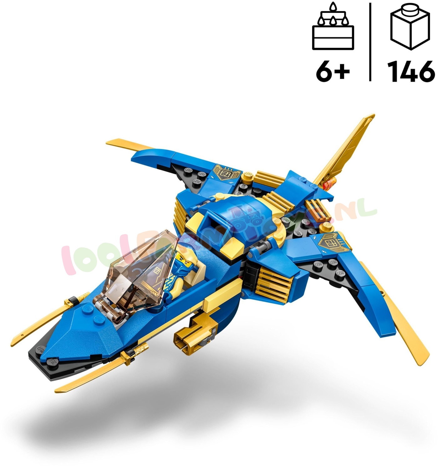 Geef ninjafans van 7 jaar en ouder de kans om de lucht in te gaan boven NINJAGO® City met Jay's Bliksemstraaljager EVO (71784). Dit supercoole vlieguig kan worden geüpgraded naar een nog groter en imposanter model door 2 noppenschieters. gouden zwaarden en een gouden roer toe te voegen.Spannende vliegavonturen voor ninjafansDeze bouwset van een bliksemstraaljager wordt geleverd met een minifiguur van Jay. die kinderen in de cockpit kunnen plaatsen om hoog in de lucht ninja-avonturen na tespelen. Kinderen kunnen het model ook combineren met andere NINJAGO sets in hun collectie voor nog meer speelmogelijkheden.LEGO® Builder appLaat de LEGO Builder app jou en je kind begeleiden tijdens het eenvoudige en intuïtieve bouwavontuur. Zoom in en draai modellen in 3D. bewaar sets en houd je voortgang bij. Ninja-speelgoedvliegtuig – kinderen kunnen hoog in de lucht avonturen beleven met de LEGO® NINJAGO® Jay's Bliksemstraaljager EVO (71784) set 1 minifiguur – de speelset bevat een minifiguur van Jay. bewapend met een zwaard. die kinderen in de cockpit achter de knoppen van de straaljager kunnen plaatsen voor snelle vliegavonturen NINJAGO® straaljager die kan worden geüpgraded – Kinderen kunnen de straaljager upgraden naar een nog groter en imposanter model door 2 noppenschieters. gouden zwaarden en een gouden roer toe te voegen Nog meer ninja-actie – bekijk ook Nya's Waterdraak EVO (71800). Lloyd's Mech Battle EVO (71781). Kai's Mech Rider EVO (71783) en andere sets uit de LEGO® NINJAGO® collectie Leuk LEGO® cadeau-idee – met deze 146-delige speelset kunnen kinderen van 7 jaar en ouder zelfstandig bouwen. Een leuk cadeau voor zomaar tussendoor. een verjaardag of de feestdagen Ook voor onderweg – deze LEGO® NINJAGO® straaljager is ca. 6 cm hoog. 22 cm lang en 21 cm breeden er kan thuis of onderweg door gepassioneerde ninjafans mee worden gespeeld Een nieuwe bouwervaring – de LEGO® Builder app begeleidt kinderen op een intuïtief bouwavontuur. Ze kunnen sets opslaan. hun voortgang bijhouden. inzoomen en hun modellen in 3D draaien tijdens het bouwen Topkwaliteit – LEGO® stenen worden al meer dan 60 jaar zo gemaakt dat ze elke keer weer consistent in elkaar te zetten zijn Altijd in veilige handen – LEGO® bouwstenen voldoen aan strenge wereldwijde veiligheidsnormen.