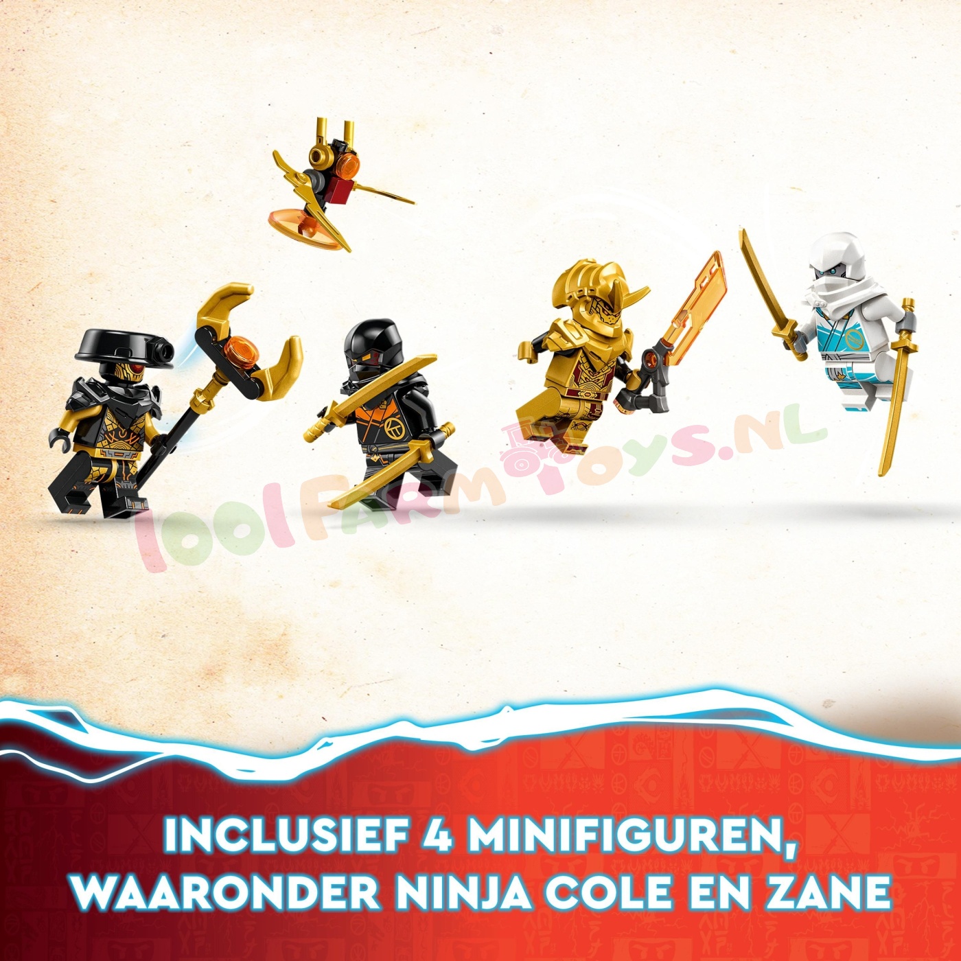 Ninjafans van 7 jaar en ouder kunnen scènes uit de tv-serie NINJAGO® Dragons Rising naspelen met de gloednieuwe spinnerfunctie op Zane's drakenkracht Spinjitzu racewagen (71791). Als ze de spoiler naar beneden duwen. gaan de achterwielen omhoog en beweegt de auto op zijn drakenkrachtelementen.4 minifiguren om spannende confrontaties na te spelenDeze autospeelset bevat 4 minifiguren: de ninjastrijders Zane en Cole. elk met 2 katana's. een Imperium gardecommandant en een Imperium klauwjager. plus een Imperium Droid. De Imperium gardecommandant heeft een Imperium zwaard. de Imperium klauwjager heeft een 'elektrische' staf en beide reizen op coole zweefvliegers. Er zijn 2 blauwe drakenkrachtelementen en kinderen kunnen er nog 4 verzamelen in verschillende kleuren in andere NINJAGO sets.LEGO® Builder appLaat de LEGO Builder app jou en je kind begeleiden tijdens een eenvoudig en intuïtief bouwavontuur. Zoom in en draai modellen in 3D. bewaar sets en houd je voortgang bij. Ninja-autospeelset – kinderen vanaf 7 jaar kunnen supersnelle race-actie uit de tv-serie NINJAGO® Dragons Rising naspelen met Zane's drakenkracht Spinjitzu racewagen (71791) 4 minifiguren – de speelset bevat minifiguren van de ninjastrijders Cole en Zane. elk met 2 katana's. een Imperium gardecommandant met een Imperium zwaard en een Imperium klauwjager met een 'elektrische' staf Draaiende ninja-auto – met de gloednieuwe spinnerfunctie op de auto kunnen kinderen de spoiler naar beneden duwen en de auto laten rondtollen op zijn drakenkrachtelementen 2 zweefvliegers – de drakenjagers kunnen tijdens duels in de lucht zweven op hun zweefvliegers Meer ninja-actie – ontdek ook Sora's transformerende mecharacemotor (71792). Tempel van de drakenenergiekernen (71795) en andere sets in het LEGO® NINJAGO® assortiment Bouw een onvergetelijk avontuur – deze 307-delige speelset laat enthousiaste ninjafans genieten van het bouwproces voordat ze hun fantasie de vrije loop laten. Ideaal als verjaardagscadeau of zomaar tussendoor Draagbaar formaat – de LEGO® NINJAGO® auto is ca. 6 cm hoog. 20 cm lang en 12 cm breed. zodat kinderen hem ook kunnen meenemen naar een speelafspraak Een nieuwe bouwervaring – de LEGO® Builder app begeleidt kinderen op een intuïtief bouwavontuur. Ze kunnen sets opslaan. hun voortgang bijhouden. inzoomen en hun modellen in 3D draaien tijdens het bouwen Topkwaliteit – LEGO® stenen worden al meer dan 60 jaar zo gemaakt dat ze elke keer weer consistent in elkaar te zetten zijn Altijd in veilige handen – LEGO® bouwstenen voldoen aan strenge wereldwijde veiligheidsnormen.
