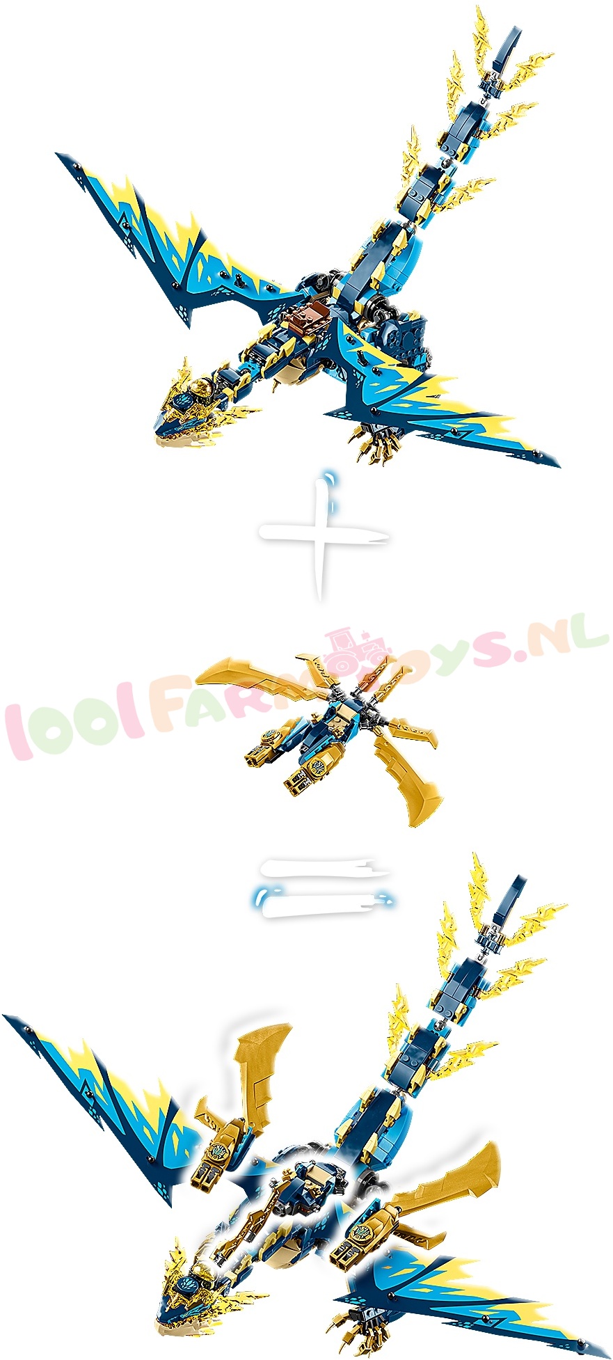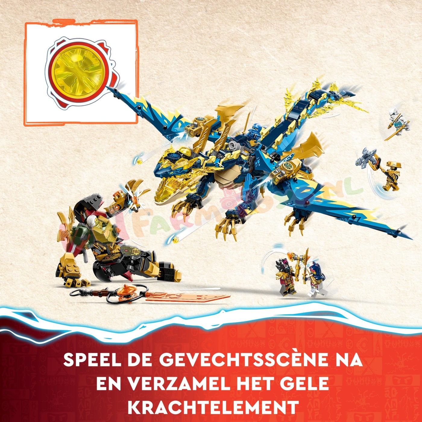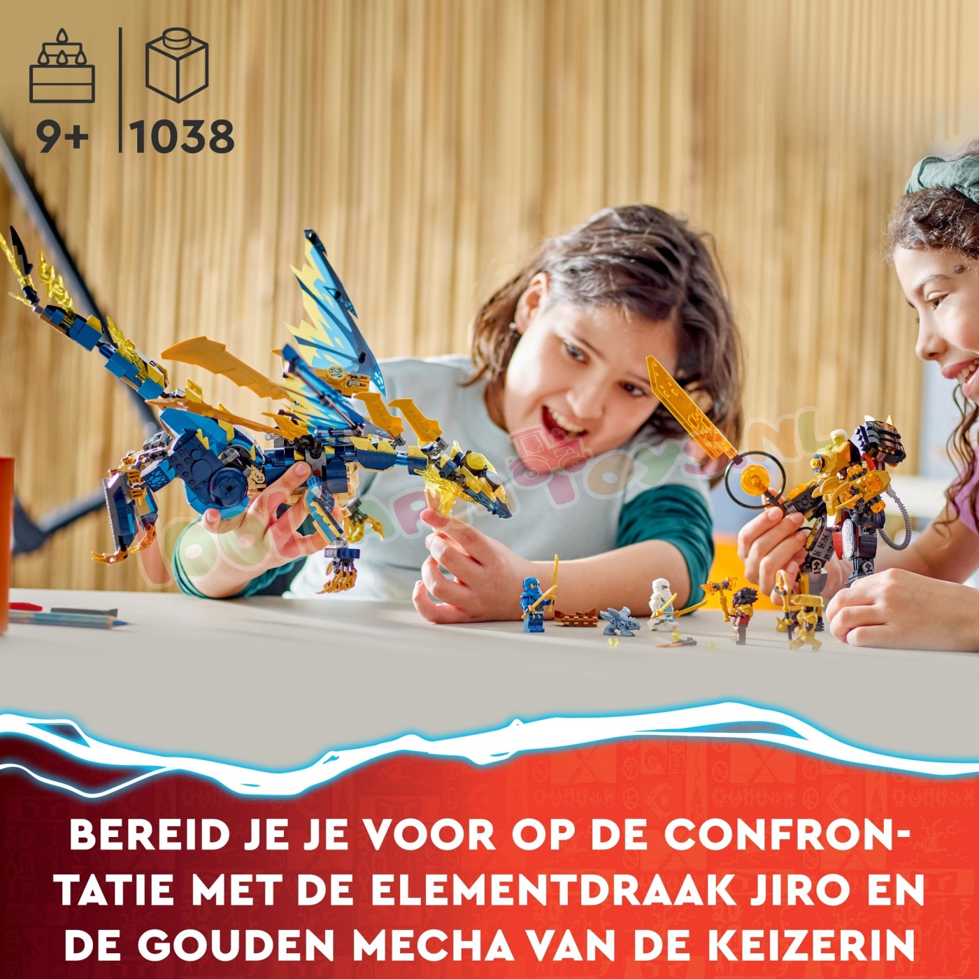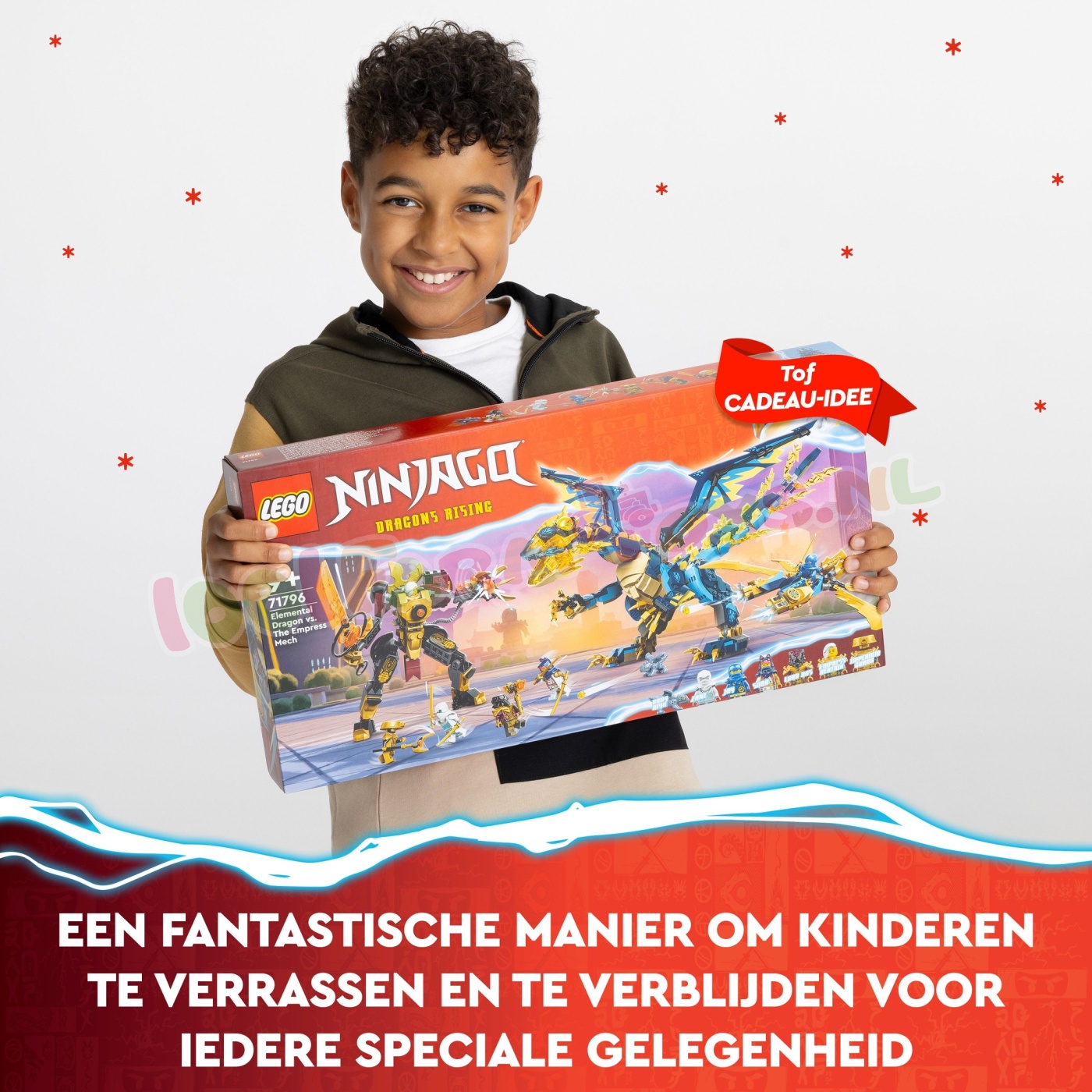 Ninjafans vanaf 9 jaar kunnen een spannende scène uit de tv-serie NINJAGO® Dragons Rising naspelen met de Elementdraak vs. de mecha van de keizerin (71796). Deze bouwset bevat de draak Jiro. die kan worden versterkt door de gouden zwaardvleugels en noppenschieters van een vliegtuigje toe te voegen. plus de verstelbare gouden mecha van de keizerin en haar krachtige MegaQuake-wapen.Hoogwaardig kinderspeelgoedEr zijn 6 minifiguren: Jay. Sora en Zane hebben elk 2 gouden katana's om Lord Ras met zijn hamer. keizerin Beatrix met haar Imperium zwaard en een Imperium bewaker met een staf te verslaan. Er is ook een geel drakenkrachtelement. Kinderen kunnen nog 4 drakenkrachtelementen in verschillende kleuren en 4 gouden drakenenergiekernen verzamelen in andere NINJAGO sets.Een leuke digitale ervaring voor LEGO® bouwersLaat de LEGO Builder app jou en je kind begeleiden tijdens een eenvoudig en intuïtief bouwavontuur. Zoom in en draai modellen in 3D. bewaar sets en houd je voortgang bij. Speelset met een draak en mecha – kinderen vanaf 9 jaar kunnen een onvergetelijke confrontatie uit de tv-serie NINJAGO® Dragons Rising naspelen met de Elementdraak vs. de mecha van de keizerin (71796) set 6 minifiguren – Jay. Sora en Zane. elk met 2 gouden katana's om het op te nemen tegen Lord Ras en zijn hamer. keizerin Beatrix met haar Imperium zwaard en een Imperium bewaker met een staf Vliegtuigje – de ninja's kunnen opstijgen in een vliegtuigje met gouden zwaardvleugels en krachtige schieters die 4 noppen kunnen afvuren Ninjadraak om te versterken – de draak Jiro wordt nog imposanter door de gouden zwaardvleugels en noppenschieters van het vliegtuigje toe te voegen Geel drakenkrachtelement om te verzamelen – de ninja's en keizerin Beatrix strijden om deze krachtbron. Kinderen kunnen nog 4 krachtelementen in verschillende kleuren verzamelen in andere LEGO® NINJAGO® sets LEGO® cadeau-idee – deze fraaie bouwset met 1038 onderdelen voor kinderen van 9 jaar en ouder biedt een leuke bouw- en speelervaring en kan cadeau worden gegeven voor een verjaardag of de feestdagen Om neer te zetten – Jiro de elementdraak is ca. 25 cm hoog en ziet er ook cool uit in een kinderkamer wanneer er even geen confrontaties mee worden nagespeeld Een nieuwe bouwervaring – de LEGO® Builder app begeleidt kinderen op een intuïtief bouwavontuur. Ze kunnen sets opslaan. hun voortgang bijhouden. inzoomen en hun modellen in 3D draaien tijdens het bouwen Topkwaliteit – LEGO® stenen worden al meer dan 60 jaar zo gemaakt dat ze elke keer weer consistent in elkaar te zetten zijn Veiligheid gegarandeerd – LEGO® bouwstenen voldoen aan strenge wereldwijde veiligheidsnormen.