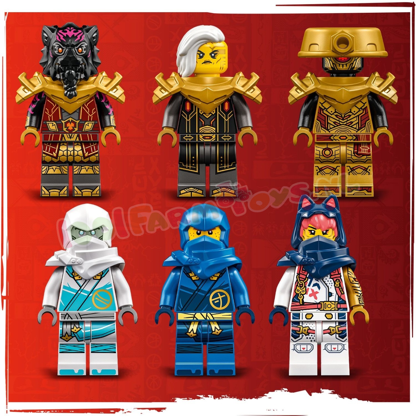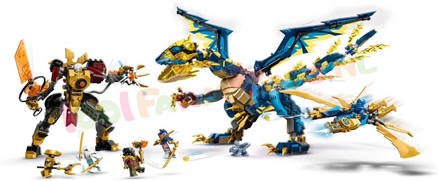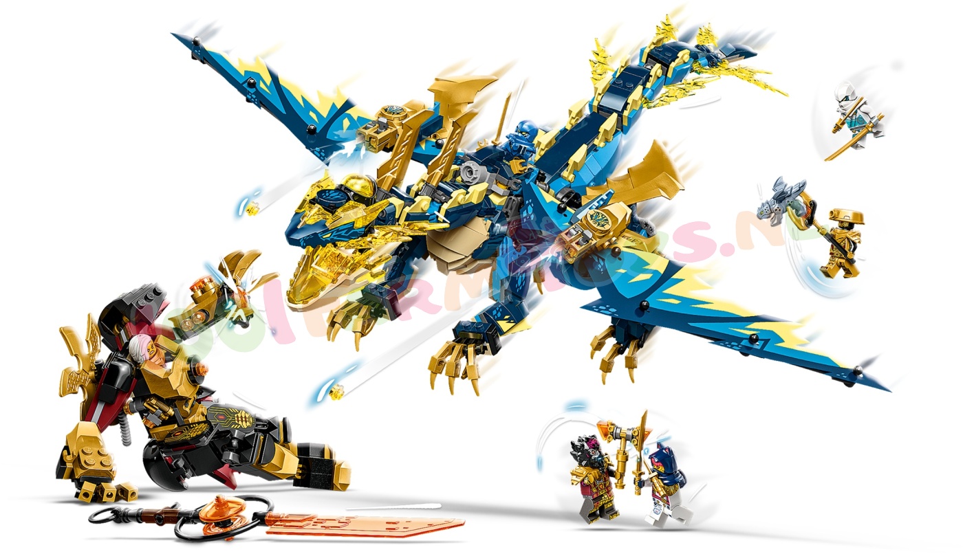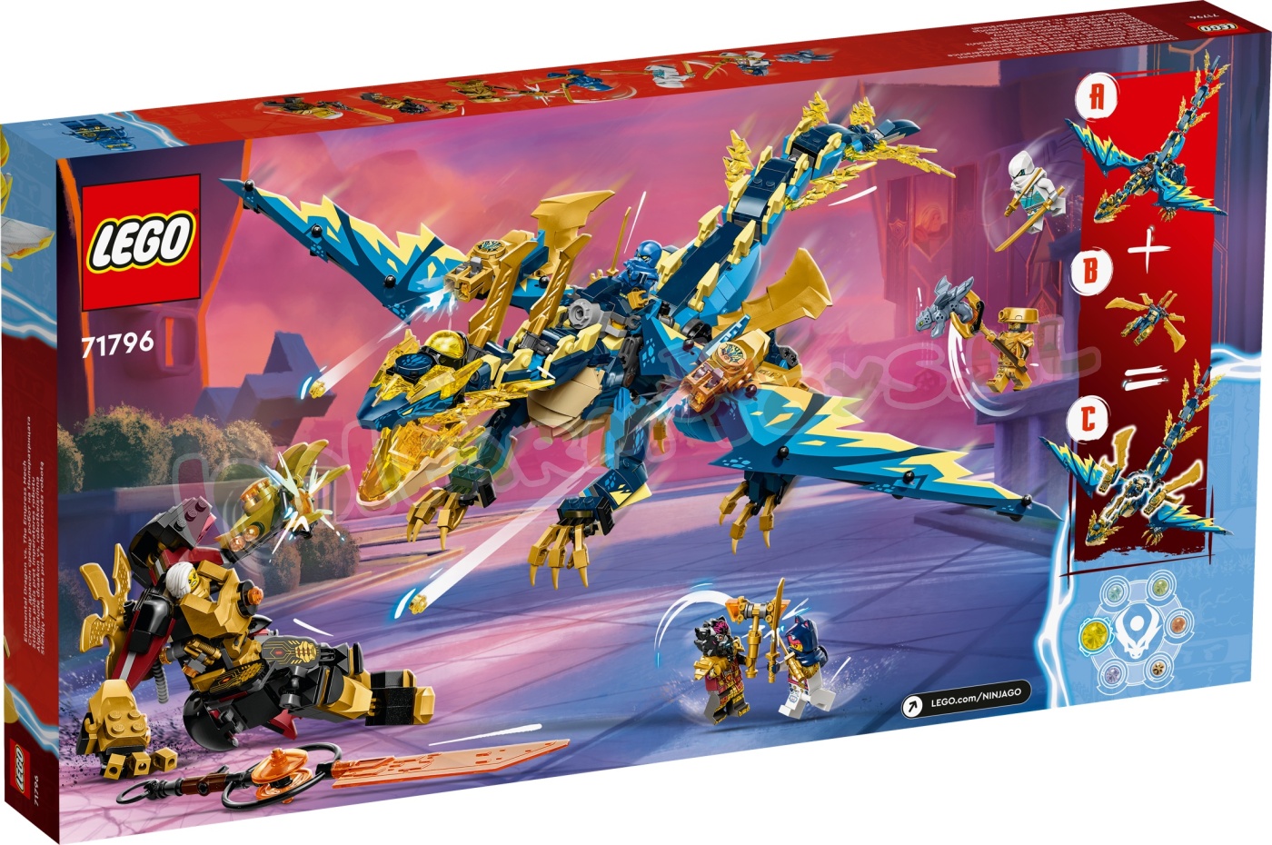 Ninjafans vanaf 9 jaar kunnen een spannende scène uit de tv-serie NINJAGO® Dragons Rising naspelen met de Elementdraak vs. de mecha van de keizerin (71796). Deze bouwset bevat de draak Jiro. die kan worden versterkt door de gouden zwaardvleugels en noppenschieters van een vliegtuigje toe te voegen. plus de verstelbare gouden mecha van de keizerin en haar krachtige MegaQuake-wapen.Hoogwaardig kinderspeelgoedEr zijn 6 minifiguren: Jay. Sora en Zane hebben elk 2 gouden katana's om Lord Ras met zijn hamer. keizerin Beatrix met haar Imperium zwaard en een Imperium bewaker met een staf te verslaan. Er is ook een geel drakenkrachtelement. Kinderen kunnen nog 4 drakenkrachtelementen in verschillende kleuren en 4 gouden drakenenergiekernen verzamelen in andere NINJAGO sets.Een leuke digitale ervaring voor LEGO® bouwersLaat de LEGO Builder app jou en je kind begeleiden tijdens een eenvoudig en intuïtief bouwavontuur. Zoom in en draai modellen in 3D. bewaar sets en houd je voortgang bij. Speelset met een draak en mecha – kinderen vanaf 9 jaar kunnen een onvergetelijke confrontatie uit de tv-serie NINJAGO® Dragons Rising naspelen met de Elementdraak vs. de mecha van de keizerin (71796) set 6 minifiguren – Jay. Sora en Zane. elk met 2 gouden katana's om het op te nemen tegen Lord Ras en zijn hamer. keizerin Beatrix met haar Imperium zwaard en een Imperium bewaker met een staf Vliegtuigje – de ninja's kunnen opstijgen in een vliegtuigje met gouden zwaardvleugels en krachtige schieters die 4 noppen kunnen afvuren Ninjadraak om te versterken – de draak Jiro wordt nog imposanter door de gouden zwaardvleugels en noppenschieters van het vliegtuigje toe te voegen Geel drakenkrachtelement om te verzamelen – de ninja's en keizerin Beatrix strijden om deze krachtbron. Kinderen kunnen nog 4 krachtelementen in verschillende kleuren verzamelen in andere LEGO® NINJAGO® sets LEGO® cadeau-idee – deze fraaie bouwset met 1038 onderdelen voor kinderen van 9 jaar en ouder biedt een leuke bouw- en speelervaring en kan cadeau worden gegeven voor een verjaardag of de feestdagen Om neer te zetten – Jiro de elementdraak is ca. 25 cm hoog en ziet er ook cool uit in een kinderkamer wanneer er even geen confrontaties mee worden nagespeeld Een nieuwe bouwervaring – de LEGO® Builder app begeleidt kinderen op een intuïtief bouwavontuur. Ze kunnen sets opslaan. hun voortgang bijhouden. inzoomen en hun modellen in 3D draaien tijdens het bouwen Topkwaliteit – LEGO® stenen worden al meer dan 60 jaar zo gemaakt dat ze elke keer weer consistent in elkaar te zetten zijn Veiligheid gegarandeerd – LEGO® bouwstenen voldoen aan strenge wereldwijde veiligheidsnormen.