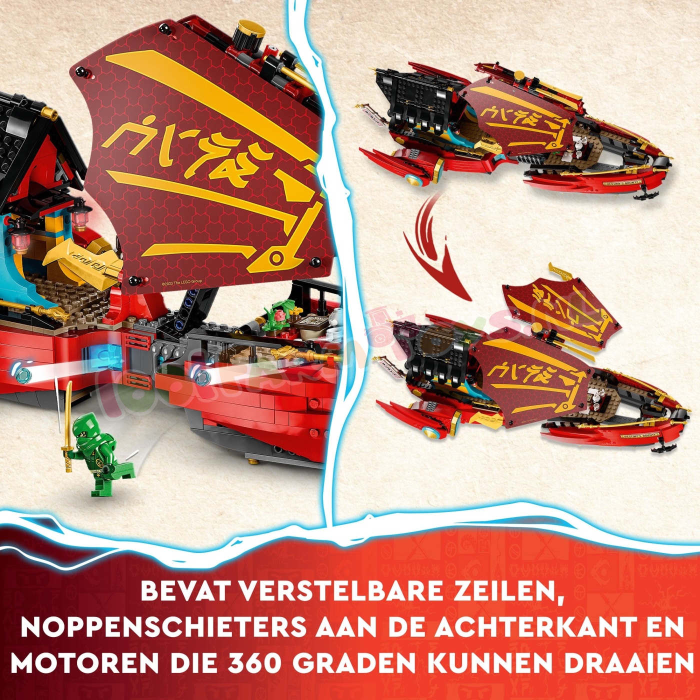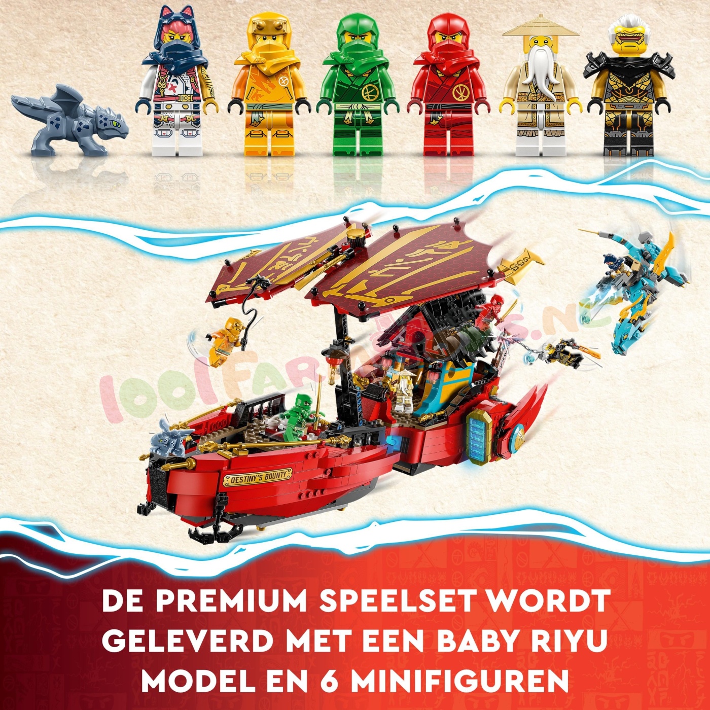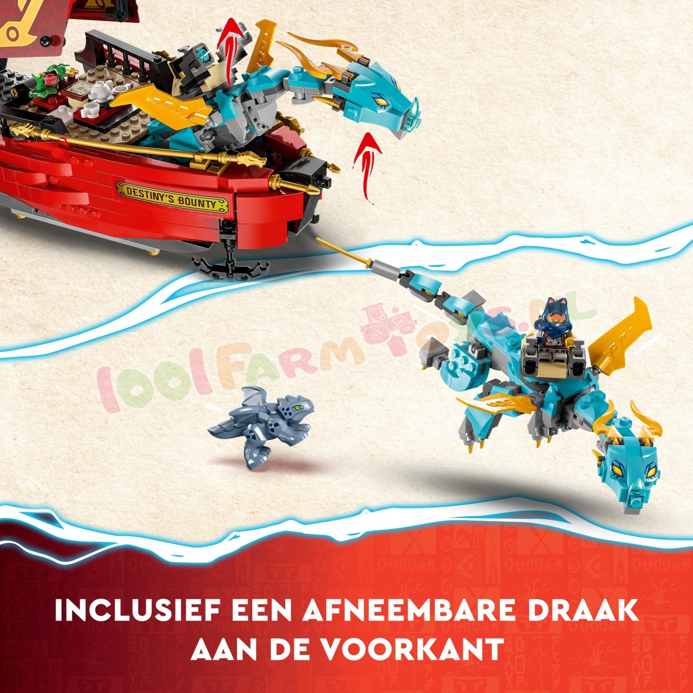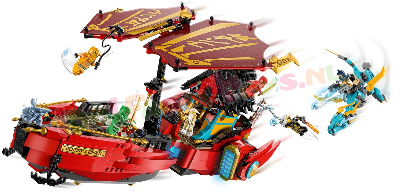 Ninjafans van 9 jaar en ouder zullen weg zijn van deze vernieuwde Destiny's Bounty – race tegen de klok (71797) speelset. Het bekende voertuig is nu een luchtschip. waarmee de ninja's boven de onlangs verenigde wereld kunnen zeilen. Met een afneembare draak aan de voorkant. verstelbare zeilen. noppenschieters aan de achterkant en motoren die 360 graden kunnen draaien. plus een afneembaar dak met daaronder een navigatieruimte en een speelkamer met speelautomaat.Cool kinderspeelgoedInclusief een model van baby Riyu en 6 minifiguren: Meester Wu met zijn staf. Arin met een enterhaak. Sora. Lloyd en Kai. die elk een gouden katana hebben. en Rapton met een Imperium zwaard en zijn eigen enterhaak om spannende scènes uit de tv-serie NINJAGO® Dragons Rising na te spelen.Een leuke digitale ervaring voor LEGO® fansLaat de LEGO Builder app jou en je kind begeleiden tijdens een eenvoudig en intuïtief bouwavontuur. Zoom in en draai modellen in 3D. bewaar sets en houd je voortgang bij. LEGO® NINJAGO® luchtschip – kinderen vanaf 9 jaar kunnen avonturen in de lucht naspelen met deze vernieuwde Destiny's Bounty – race tegen de klok (71797) speelset 6 minifiguren – het luchtschip wordt geleverd met minifiguren van Meester Wu. Arin. Sora. Lloyd. Kai en Rapton. elk met minstens 1 wapen voor rollenspellen boordevol actie 2 speelgoeddraken – deze fraaie speelset bevat een verstelbare elementdraak die aan de voorkant van het luchtschip kan worden vastgemaakt om het aan te drijven. plus een model van baby Riyu Functies van het luchtschip – het vernieuwde slagschip Destiny's Bounty beschikt over noppenschieters aan de achterkant. verstelbare zeilen en motoren die 360 graden kunnen draaien Afneembaar dak – haal het dak eraf om een navigatieruimte en een speelkamer met een speelautomaat voor de ninja's te onthullen Bouwen en spelen – kinderen vanaf 9 jaar kunnen genieten van een leuke bouwervaring met de 1739 onderdelen van deze set voordat ze de lucht in vliegen boven de nieuwe NINJAGO® wereld Leuk cadeau voor creatieve kinderen – dit vernieuwde ninjavoertuig is ca. 23 cm hoog. 53 cm lang en 31 cm breed. Een bijzonder cadeau voor een verjaardag of de feestdagen Een nieuwe bouwervaring – de LEGO® Builder app begeleidt jonge kinderen op een intuïtief bouwavontuur. Ze kunnen sets opslaan. hun voortgang bijhouden. inzoomen en hun modellen in 3D draaien tijdens het bouwen Topkwaliteit – LEGO® stenen worden al meer dan 60 jaar zo gemaakt dat ze elke keer weer consistent in elkaar te zetten zijn Veiligheid gegarandeerd – LEGO® bouwstenen voldoen aan strenge wereldwijde veiligheidsnormen.