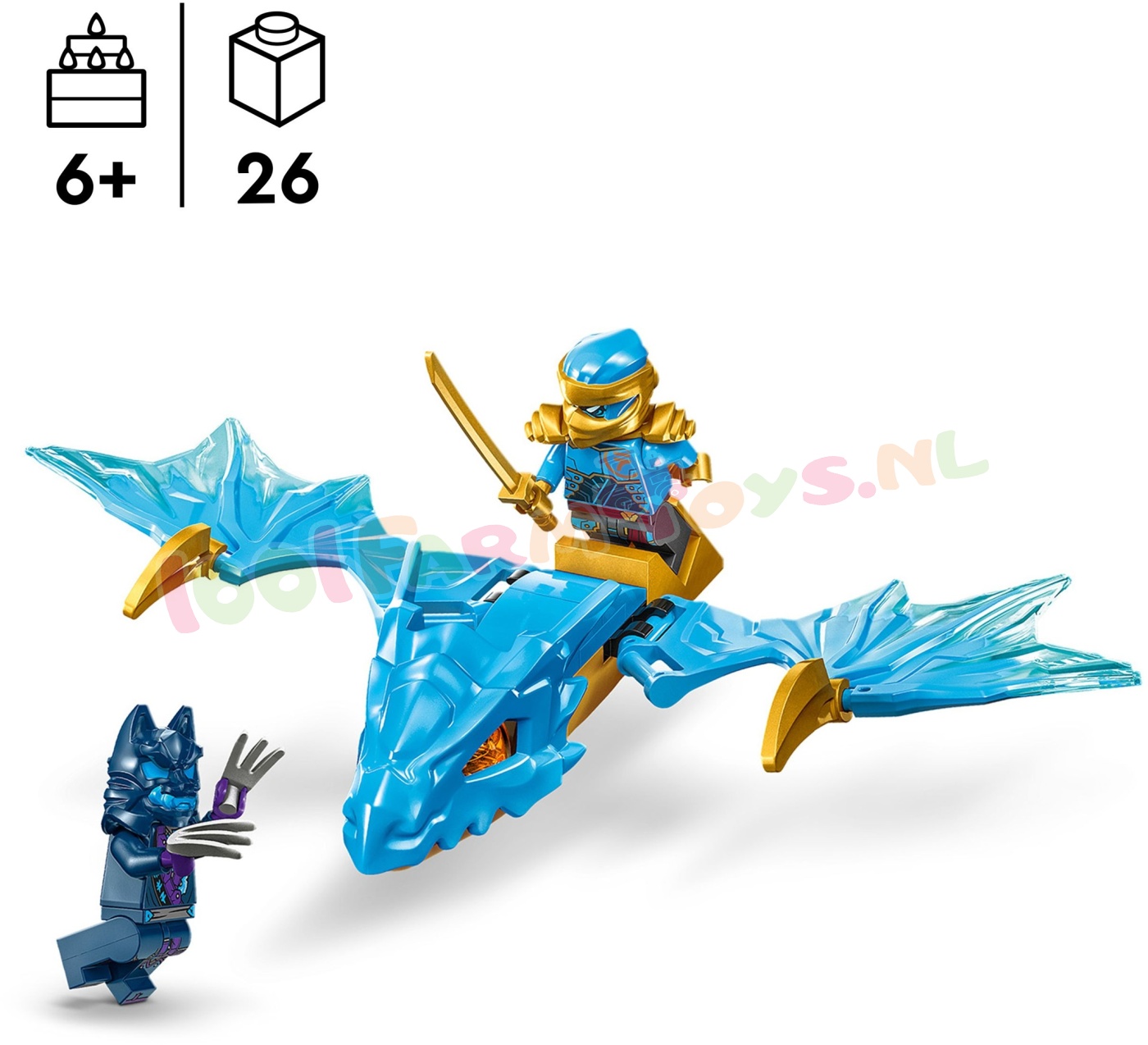 Jongens en meisjes vanaf 6 jaar kunnen spannende scènes uit seizoen 2 van de tv-serie NINJAGO® Dragons Rising naspelen met de ninjaspeelset Nya's rijzende drakenaanval (71802). Kinderen zullen het geweldig vinden om het eerste LEGO® NINJAGO drakenactiespeelgoed ooit te bouwen voordat ze op de gouden staart van de draak slaan en kijken hoe deze in actie komt.Deze bouwset bevat 2 minifiguren: Rijzende draak Nya met een katana die op het drakenmodel kan rijden en een Wolvenmasker klauwstrijder met klauwen. Kinderen kunnen spannende confrontaties tussen de ninjafiguren naspelen om het oranje drakenkrachtelement te bemachtigen uit de verstelbare bek van de blauwe draak.De rest van het LEGO NINJAGO assortiment bouwbaar ninjaspeelgoed omvat mecha. voertuigen en tempels. zodat fans avonturen kunnen naspelen met hun helden (sets worden apart verkocht). Elk model kan worden gemaakt met behulp van de LEGO Builder app. die jou en je kind begeleidt op een eenvoudig en intuïtief bouwavontuur. Drakenspeelgoed boordevol actie voor kinderen – jongens en meisjes vanaf 6 jaar kunnen confrontaties uit seizoen 2 van de NINJAGO® Dragons Rising tv-serie naspelen met de speelgoeddraak in Nya's rijzende drakenaanval Ninja actiespeelgoed – kinderen kunnen Rijzende draak Nya op de rug van de blauwe draak plaatsen. de gouden staart naar beneden slaan en ze allebei naar voren lanceren 2 LEGO® NINJAGO® minifiguren – deze ninjaspeelset bevat een Nya minifiguur met een minikatana. zodat kinderen confrontaties met de Wolvenmasker klauwstrijder kunnen naspelen Drakenkrachtelement – de blauwe speelgoeddraak heeft een oranje drakenkrachtelement in zijn bek Ninjacadeau – deze LEGO® NINJAGO® set biedt een leuke bouw- en speelervaring en is eencadeautip voor kinderen die een onverwachte traktatie verdienen Grotere ninja-avonturen – kijk uit naar meer LEGO® NINJAGO® speelgoed (sets apart verkrijgbaar) om races te organiseren Een universum vol ninjaspeelgoed voor kinderen – LEGO® NINJAGO® sets bevatten mecha. voertuigen en tempels. waarmee kinderen samen met hun ninjahelden kunnen ontsnappen naar een fantasiewereld vol avontuur Afmetingen – deze 26-delige LEGO® bouwset bevat een speelgoeddraak van ca. 2 cm hoog. 18 cm lang en 18 cm breed.