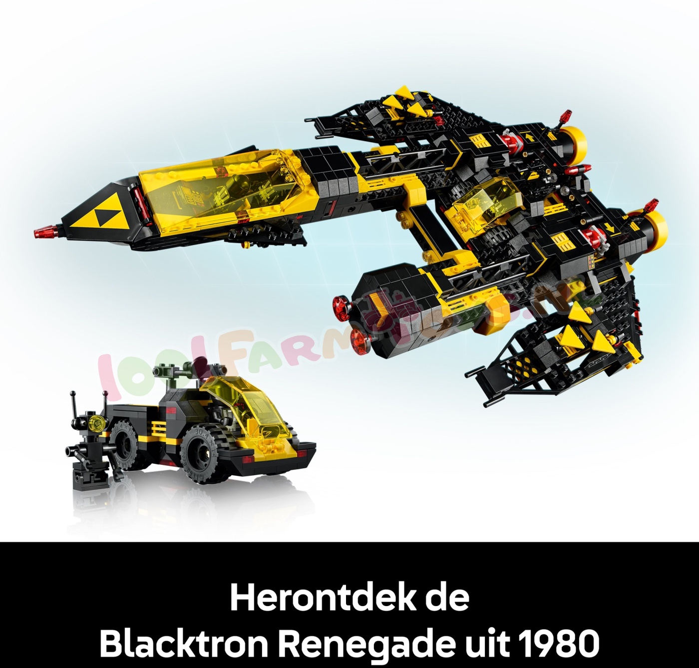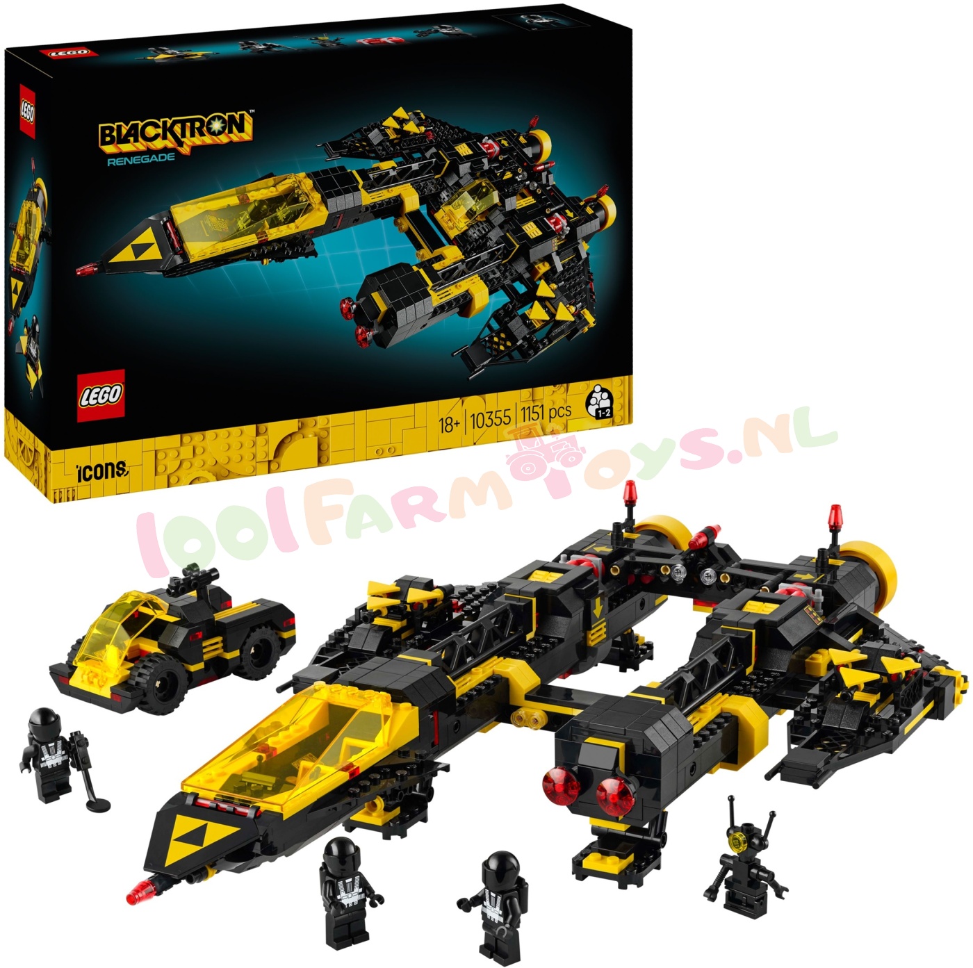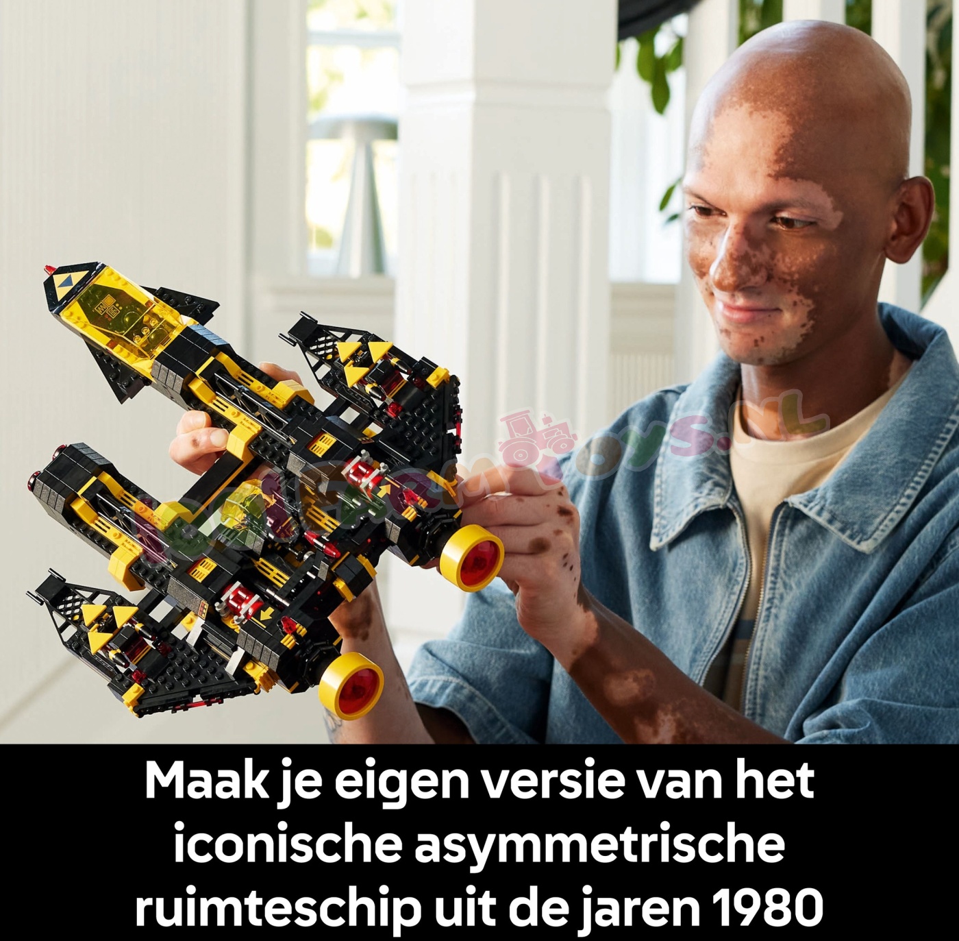 Haal een onvergetelijke LEGO® ruimteset in huis met de LEGO Icons Blacktron Renegade (10355) bouwset voor volwassenen. Deze grotere modulaire versie van het opvallende ruimteschip uit de jaren 1980 bevat moderne vernieuwingen waar elke fan van de LEGO ruimteklassieker blij van zal worden.Het asymmetrische Blacktron Renegade ruimteschip is een modulaire versie met nieuwe kenmerken. waaronder een drop pod. een landingsgestel. 2 op de vleugel gemonteerde ruimtespeeders en 2 motorenergiecilinders. Het model wordt geleverd met 3 Blacktron minifiguren en een droid en kan met online bouwinstructies worden omgebouwd tot een vernieuwde versie van de LEGO Alienator.Deze set bevat afzonderlijke zakjes met stenen. waardoor hij ideaal is om alleen of juist samen te bouwen. Inclusief een gedrukte bouwhandleiding voor de Blacktron Renegade. Digitale 3D-instructies zijn beschikbaar in de LEGO Builder app. waar je ook kunt ontdekken hoe je de Blacktron Renegade kunt ombouwen tot de Blacktron Alienator. Modelbouwset voor volwassen verzamelaars – duik in een nostalgisch bouwproject met de LEGO® Icons Blacktron Renegade bouwset. een eerbetoon aan een geliefde klassieker uit de jaren 1980 Wat zit er in de doos? – alles wat je nodig hebt om het Blacktron Renegade ruimteschipmodel te bouwen. plus een drop pod. 2 ruimtespeeders. 3 Blacktron minifiguren en een droidfiguur Eigenschappen en functies – activeer de drop pod. plaats de ruimtespeeders op de vleugels. laat het landingsgestel zakken en pas het schip gedeeltelijk aan om een Blacktron spaceshuttle te creëren Decoratief model met ruimtethema – voeg een bijzondere blikvanger toe aan je huis of kantoor met dit klassieke displaymodel Ruimtecadeau voor volwassenen – verwen jezelf of vier een verjaardag of een speciale gelegenheid met deze modelbouwset om te verzamelen Bouw om tot de Alienator – inclusief een gedrukte handleiding voor de Blacktron Renegade en 3D-instructies in de LEGO® Builder app. waar je ook kunt ontdekken hoe je het model kunt ombouwen tot de Blacktron Alienator uit de jaren 1980 Alleen of samen bouwen – deze LEGO® Icons ruimteset bevat afzonderlijke zakjes met stenen. waardoor hij geschikt is om alleen of samen met familie en vrienden te bouwen Afmetingen – het Blacktron Renegade ruimteschip in deze 1151-delige bouwset is ca. 9 cm hoog. 47 cm lang en 30 cm breed.