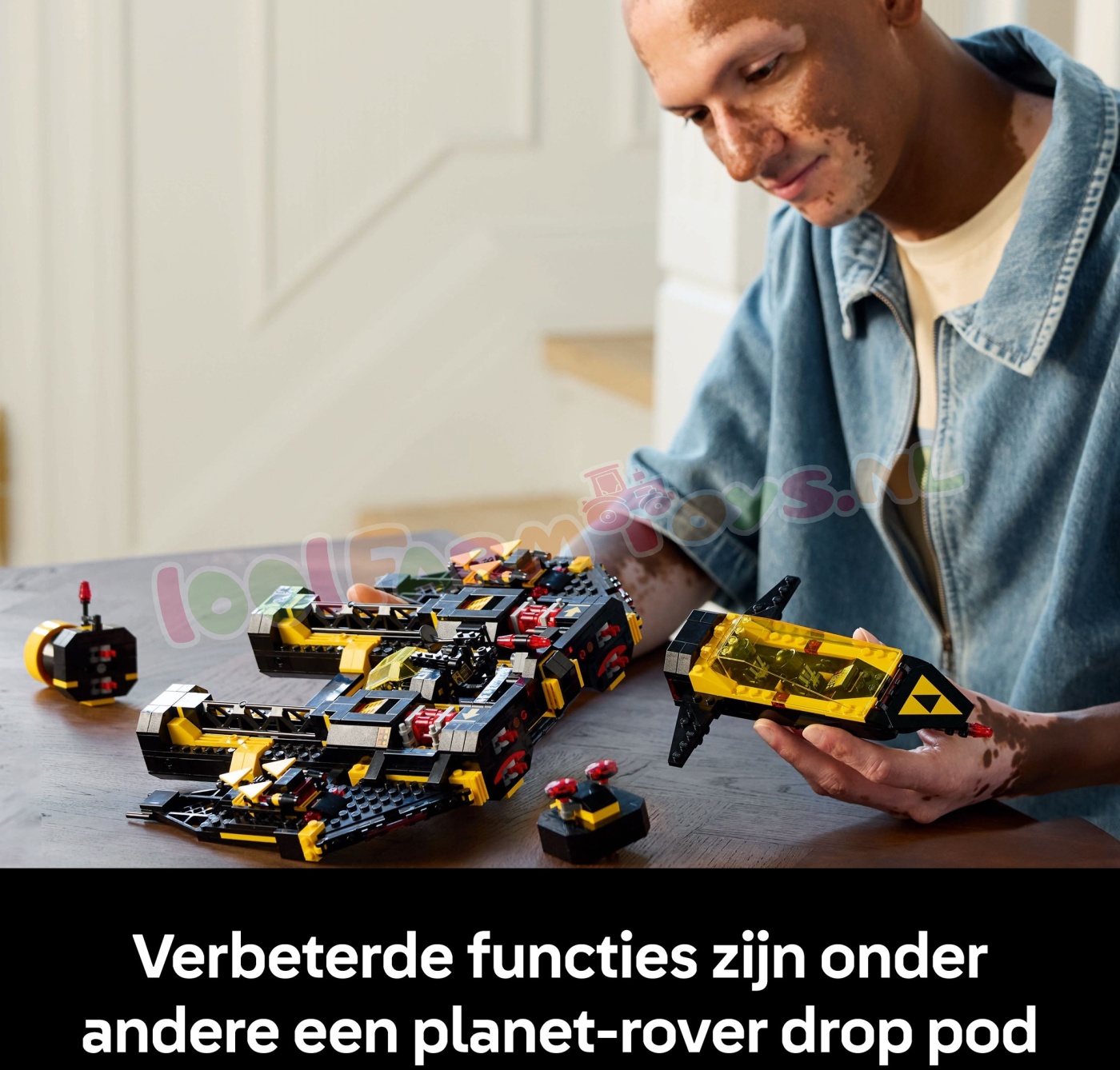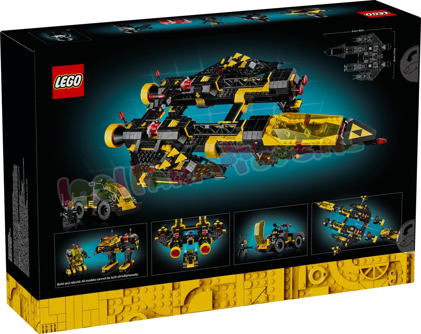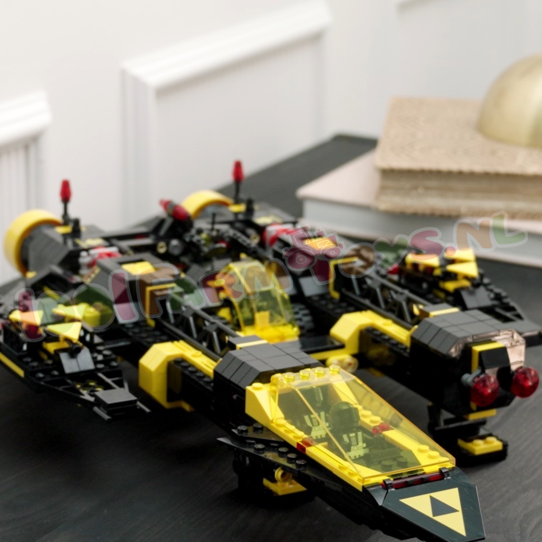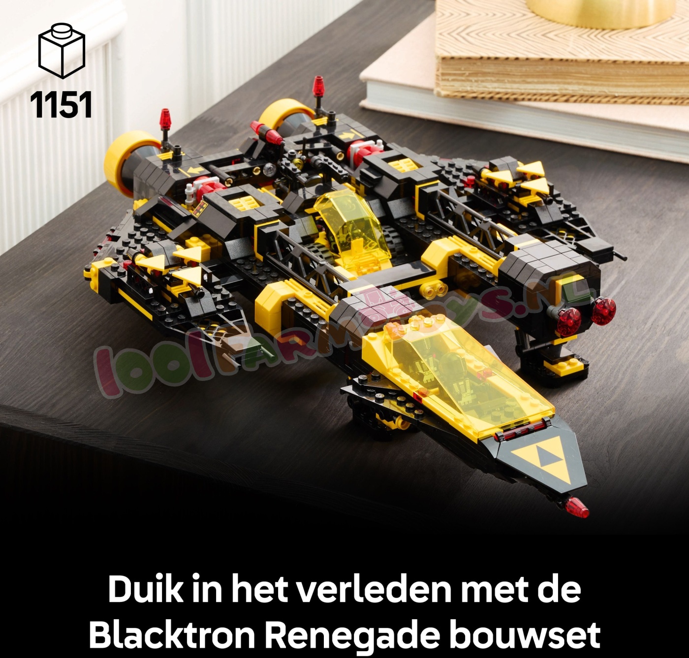 Haal een onvergetelijke LEGO® ruimteset in huis met de LEGO Icons Blacktron Renegade (10355) bouwset voor volwassenen. Deze grotere modulaire versie van het opvallende ruimteschip uit de jaren 1980 bevat moderne vernieuwingen waar elke fan van de LEGO ruimteklassieker blij van zal worden.Het asymmetrische Blacktron Renegade ruimteschip is een modulaire versie met nieuwe kenmerken. waaronder een drop pod. een landingsgestel. 2 op de vleugel gemonteerde ruimtespeeders en 2 motorenergiecilinders. Het model wordt geleverd met 3 Blacktron minifiguren en een droid en kan met online bouwinstructies worden omgebouwd tot een vernieuwde versie van de LEGO Alienator.Deze set bevat afzonderlijke zakjes met stenen. waardoor hij ideaal is om alleen of juist samen te bouwen. Inclusief een gedrukte bouwhandleiding voor de Blacktron Renegade. Digitale 3D-instructies zijn beschikbaar in de LEGO Builder app. waar je ook kunt ontdekken hoe je de Blacktron Renegade kunt ombouwen tot de Blacktron Alienator. Modelbouwset voor volwassen verzamelaars – duik in een nostalgisch bouwproject met de LEGO® Icons Blacktron Renegade bouwset. een eerbetoon aan een geliefde klassieker uit de jaren 1980 Wat zit er in de doos? – alles wat je nodig hebt om het Blacktron Renegade ruimteschipmodel te bouwen. plus een drop pod. 2 ruimtespeeders. 3 Blacktron minifiguren en een droidfiguur Eigenschappen en functies – activeer de drop pod. plaats de ruimtespeeders op de vleugels. laat het landingsgestel zakken en pas het schip gedeeltelijk aan om een Blacktron spaceshuttle te creëren Decoratief model met ruimtethema – voeg een bijzondere blikvanger toe aan je huis of kantoor met dit klassieke displaymodel Ruimtecadeau voor volwassenen – verwen jezelf of vier een verjaardag of een speciale gelegenheid met deze modelbouwset om te verzamelen Bouw om tot de Alienator – inclusief een gedrukte handleiding voor de Blacktron Renegade en 3D-instructies in de LEGO® Builder app. waar je ook kunt ontdekken hoe je het model kunt ombouwen tot de Blacktron Alienator uit de jaren 1980 Alleen of samen bouwen – deze LEGO® Icons ruimteset bevat afzonderlijke zakjes met stenen. waardoor hij geschikt is om alleen of samen met familie en vrienden te bouwen Afmetingen – het Blacktron Renegade ruimteschip in deze 1151-delige bouwset is ca. 9 cm hoog. 47 cm lang en 30 cm breed.