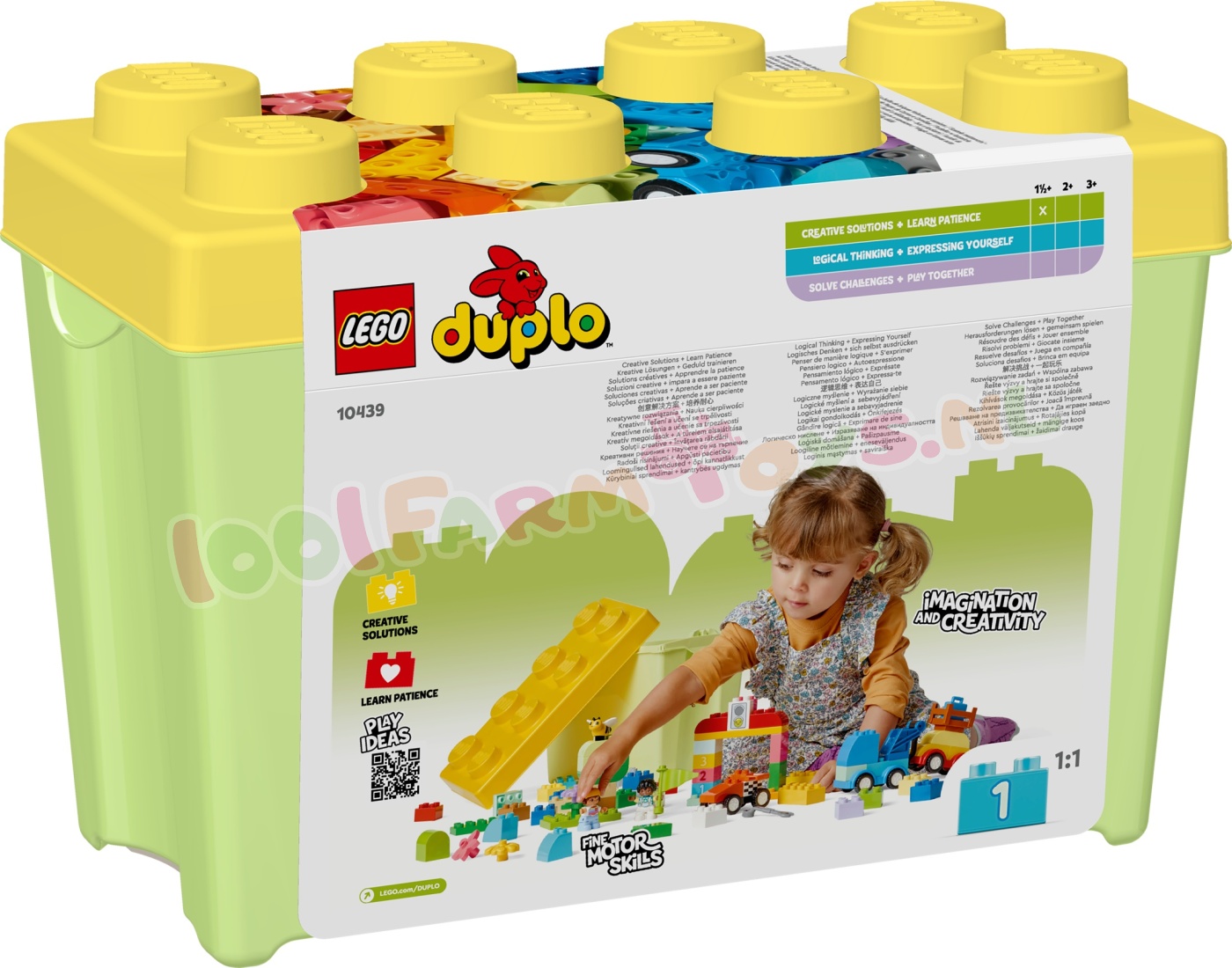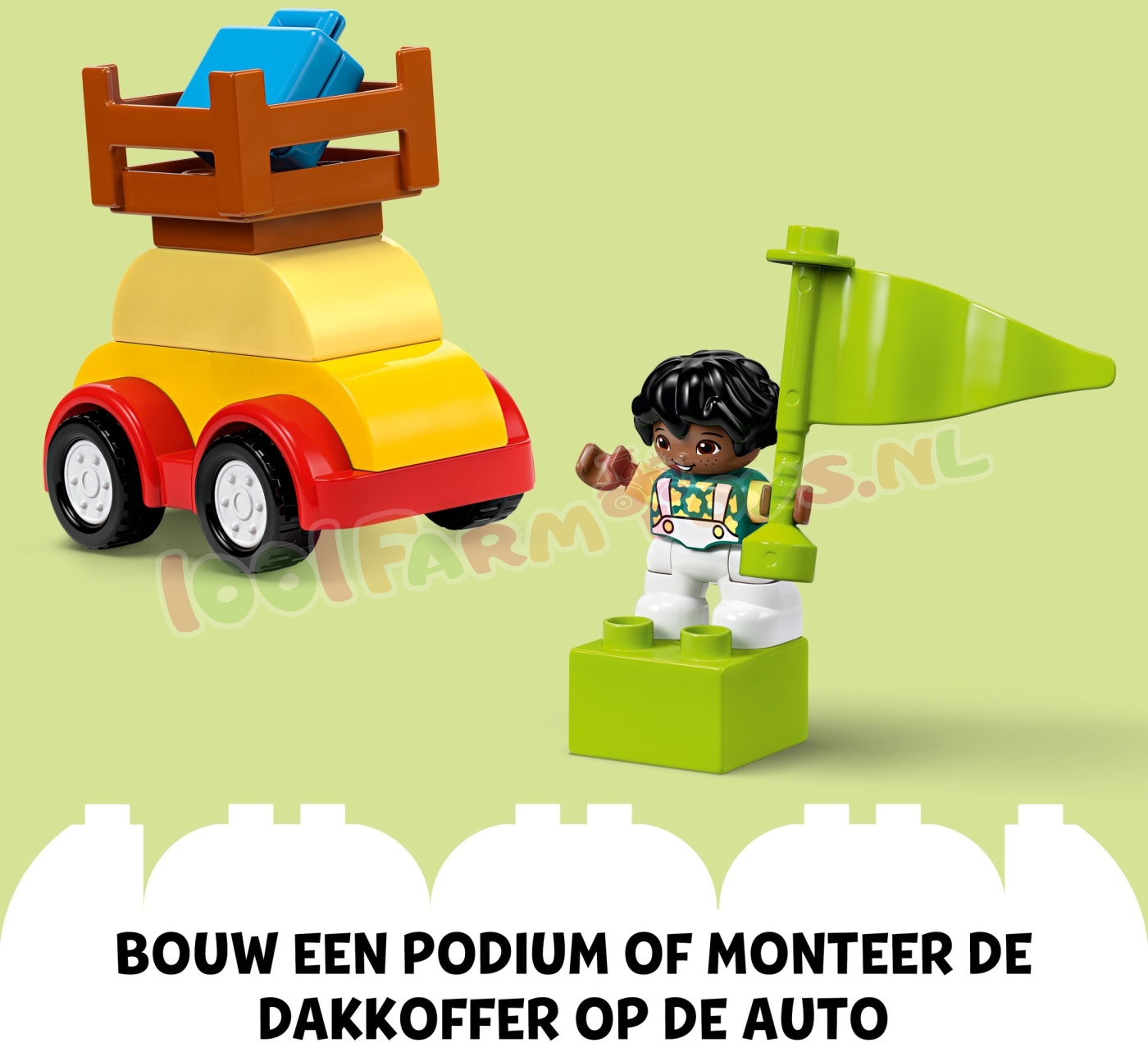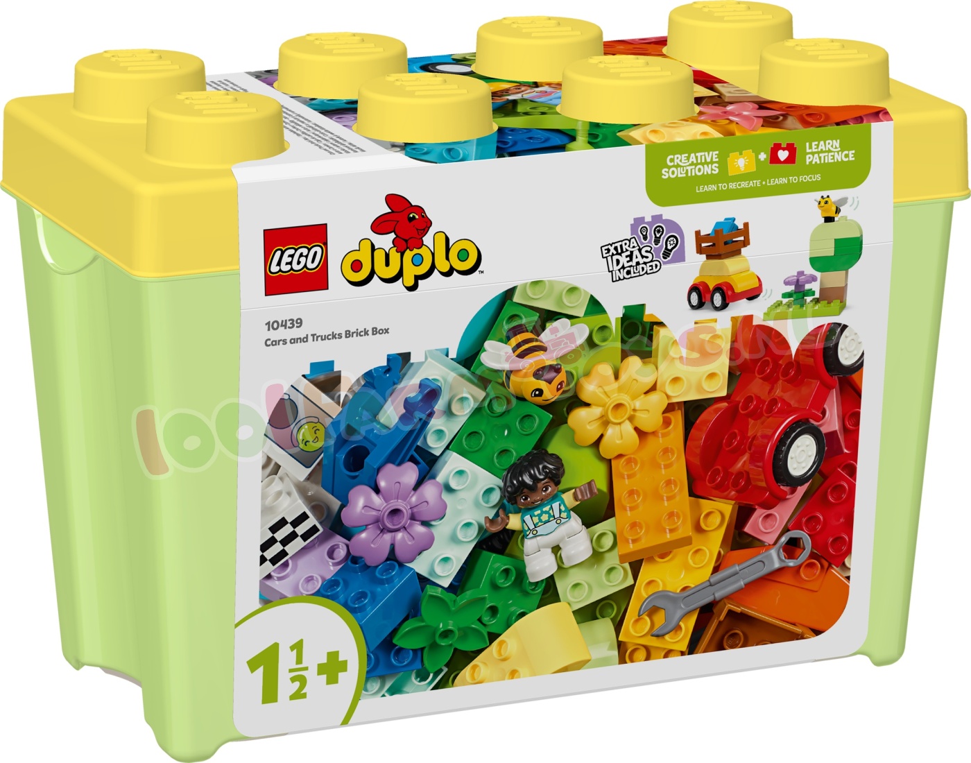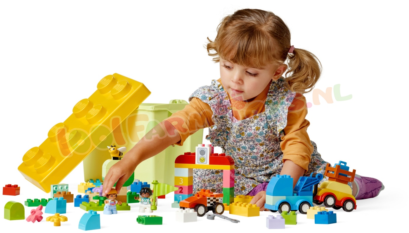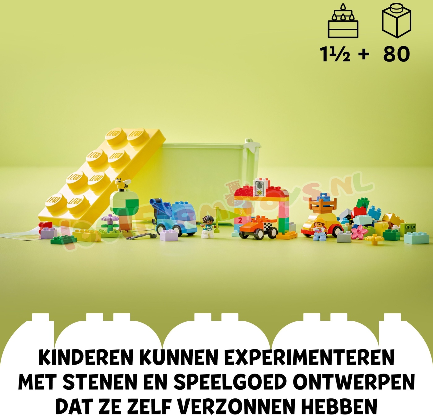 Peuters die van speelsets met voertuigen houden. kunnen hun creatieve vaardigheden ontwikkelen met de educatieve Auto's en vrachtwagens in opbergdoos (10439). Met deze creatieve bouwset met 3 chassis-elementen en 80 stenen kunnen peuters vanaf 18 maanden een raceauto en podium. een sleepwagen. een gezinsauto en een omgeving bouwen – of hun eigen wonder op wielen verzinnen!Jonge kinderen oefenen hun geduld en concentratie door de eenvoudige instructies met afbeeldingen te volgen om herkenbare voertuigen na te maken. Ze kunnen hun creativiteit de vrije loop laten door met de stenen te experimenteren en zelf iets op wielen te bouwen. Met dit speelgoed oefenen peuters diverse vaardigheden zoals problemen oplossen. hand-oogcoördinatie en fijne motoriek. Er zijn ook figuren van een monteur. een kind en een bij om fantasierijke verhalen te verzinnen. En na het spelen kunnen de onderdelen netjes in de doos worden opgeborgen. Educatief speelgoed voor peuters van 18 maanden en ouder die dol zijn op voertuigen – de Auto's en vrachtwagens in opbergdoos speelset wordt geleverd met verschillende stenen en onderdelen om de creativiteit van peuters te inspireren Complete voertuigspeelset – dit fantasierijke speelgoed laat peuters leuke avonturen op 4 wielen bedenken en naspelen. Inclusief 3 chassis-elementen. stenen met de cijfers 1. 2 en 3. 2 kinderfiguren en een bijenfiguur Klaar voor de start... leren maar – kinderen observeren en imiteren de wereld om zich heen door een raceauto met een podium. een sleepwagen met een haak. een gezinsauto en een omgeving te bouwen Vaardigheden ontwikkelen – dit leerspeelgoed voor peuters stimuleert de ontwikkeling. van het oplossen van problemen en doorzettingsvermogen tot het verbeteren van de hand-oogcoördinatie en de fijne motoriek Verjaardagscadeau – verwen een peuter die dol is op voertuigen met deze creatieve vrachtwagen- en raceautoset voor een speciale gelegenheid of verjaardag Kwaliteitsspeelgoed voor peuters – alle onderdelen van deze LEGO® DUPLO® vrachtwagen en raceauto set zijn tot het uiterste getest om te garanderen dat ze voldoen aan hoge kindveiligheidsnormen Leerzaam speelgoed voor peuters – LEGO® DUPLO® bouwspeelgoed is vakkundig ontworpen om de creativiteit van peuters te stimuleren en ze te helpen de wereld die ze om zich heen zien te begrijpen Afmetingen – de doos in de vorm van een LEGO® steen bevat 80 onderdelen en is ca. 26 cm hoog. 37 cm breed en 18 cm diep.