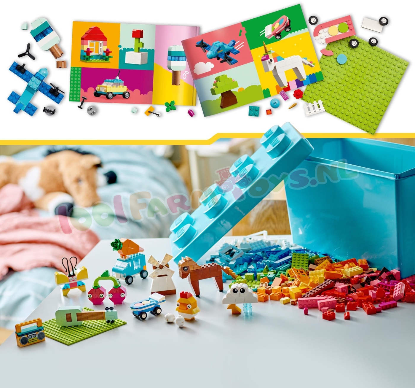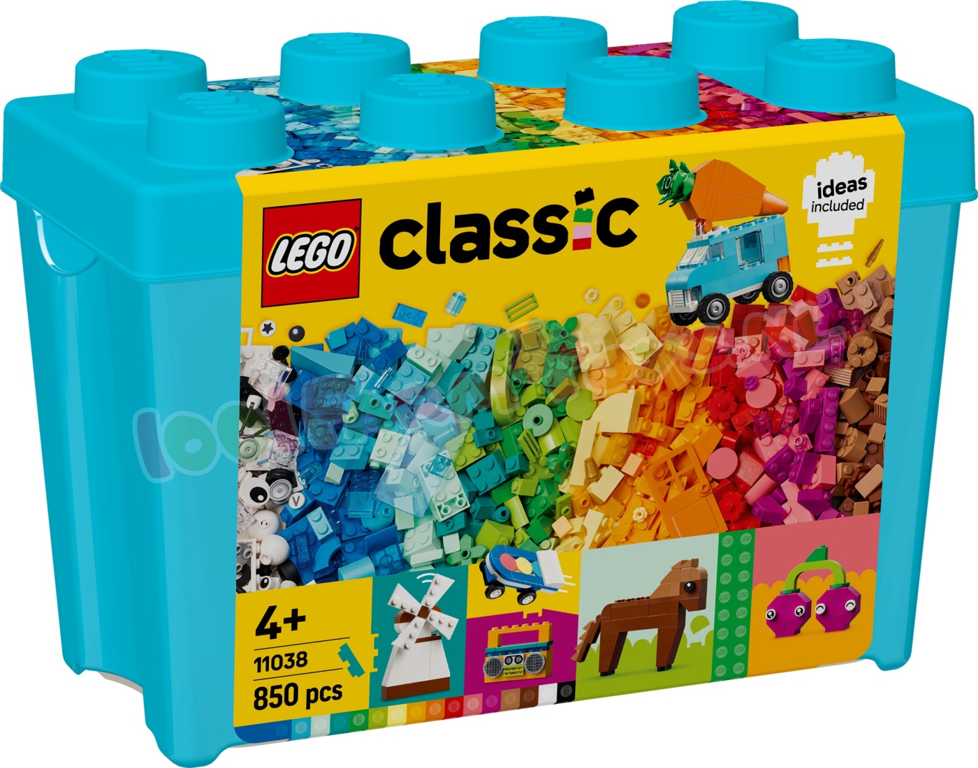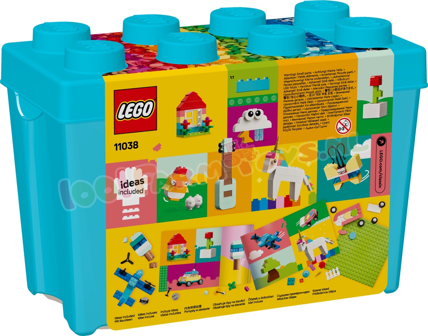 LEGO® Classic Kleurrijke creatieve opbergdoos (11038) bevat een vrolijke mix van LEGO stenen en onderdelen voor meisjes en jongens van 4 jaar en ouder. Kinderen die van creatief bouwen houden. zullen dol zijn op de vele gekleurde stenen en mogelijkheden in deze leuke opbergdoos in de vorm van een LEGO steen. Om kinderen op weg te helpen. kunnen ze 10 coole dingen bouwen: een paard. wortelwagen. kers. boombox. windmolen. skateboard. wolk. vlinder. kip en gitaar. Met behulp van de meegeleverde ideeën kunnen kinderen nog meer speelgoed bouwen. waaronder een vliegtuig. eenhoorn. modelhuis. bloem. speelgoedijsje. auto. boom en alternatief skateboard. Ze kunnen de stenen opnieuw combineren om van kleur. vorm en grootte te veranderen en deuren.ramen. wielen. planten. ogen en doorzichtige onderdelen verwisselen om hun eigen. unieke modellen te maken. LEGO Classic speelgoed zit vol ideeën en inspiratie. waarmee ouders bouwplezier en mijlpalen in de ontwikkeling met hun kinderen kunnen delen. Gekleurde bouwstenen voor kinderen – creatieve meisjes en jongens vanaf 4 jaar ontdekken allerlei kleurrijke stenen en fantasierijk speelgoed om te bouwen en aan te passen in de LEGO® Classic Kleurrijke creatieve opbergdoos Creatief speelgoed om jonge bouwers te inspireren – kinderen kunnen een paard. een wortelwagen. een kers. een boombox. een windmolen. een skateboard. een wolk. een vlinder. een kip en een gitaar bouwen Herbouwbaar speelgoed – de meegeleverde suggesties inspireren kinderen om hun modellen om te bouwen tot een vliegtuig. eenhoorn. huis. bloem. ijsje. auto. boom en alternatief skateboard Onbegrensd bouwplezier – kinderen combineren de stenen opnieuw om van kleur. vorm en grootte te wisselen en deuren. ramen. wielen. planten. ogen en doorzichtige onderdelen te veranderen en hun eigen. unieke modellen te maken Leuk cadeau – geef de LEGO® Classic Kleurrijke creatieve opbergdoos cadeau voor een verjaardag. de feestdagen of een andere gelegenheid aan kinderen die zullen genieten van het vrolijk gekleurde bouwspeelgoed Gemaakt voor jonge bouwers – de eenvoudig te volgen handleiding met afbeeldingen versnelt het bouwen en om het speelplezier nog verder te vergroten kunnen kinderen deze set combineren met andere sets uit de serie: 11034. 11035. 11036 en 11037 Bouwen aan vaardigheden – LEGO® Classic sets geven jonge bouwers de kans om vrij te spelen en zichzelf creatief te uiten 850 LEGO® onderdelen – het bouwbare speelgoedpaard is ca. 7 cm hoog en de wortelwagen is ca. 8 cm hoog. 9 cm lang en 4 cm breed.
