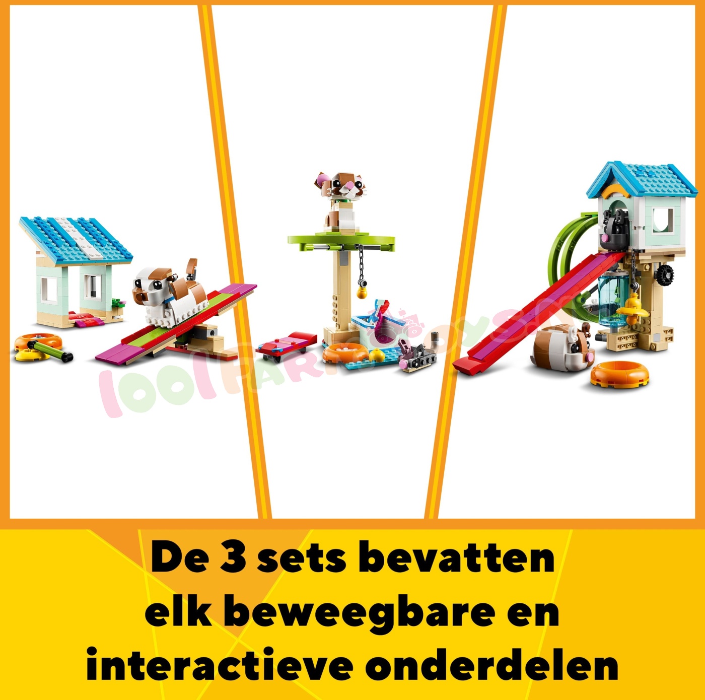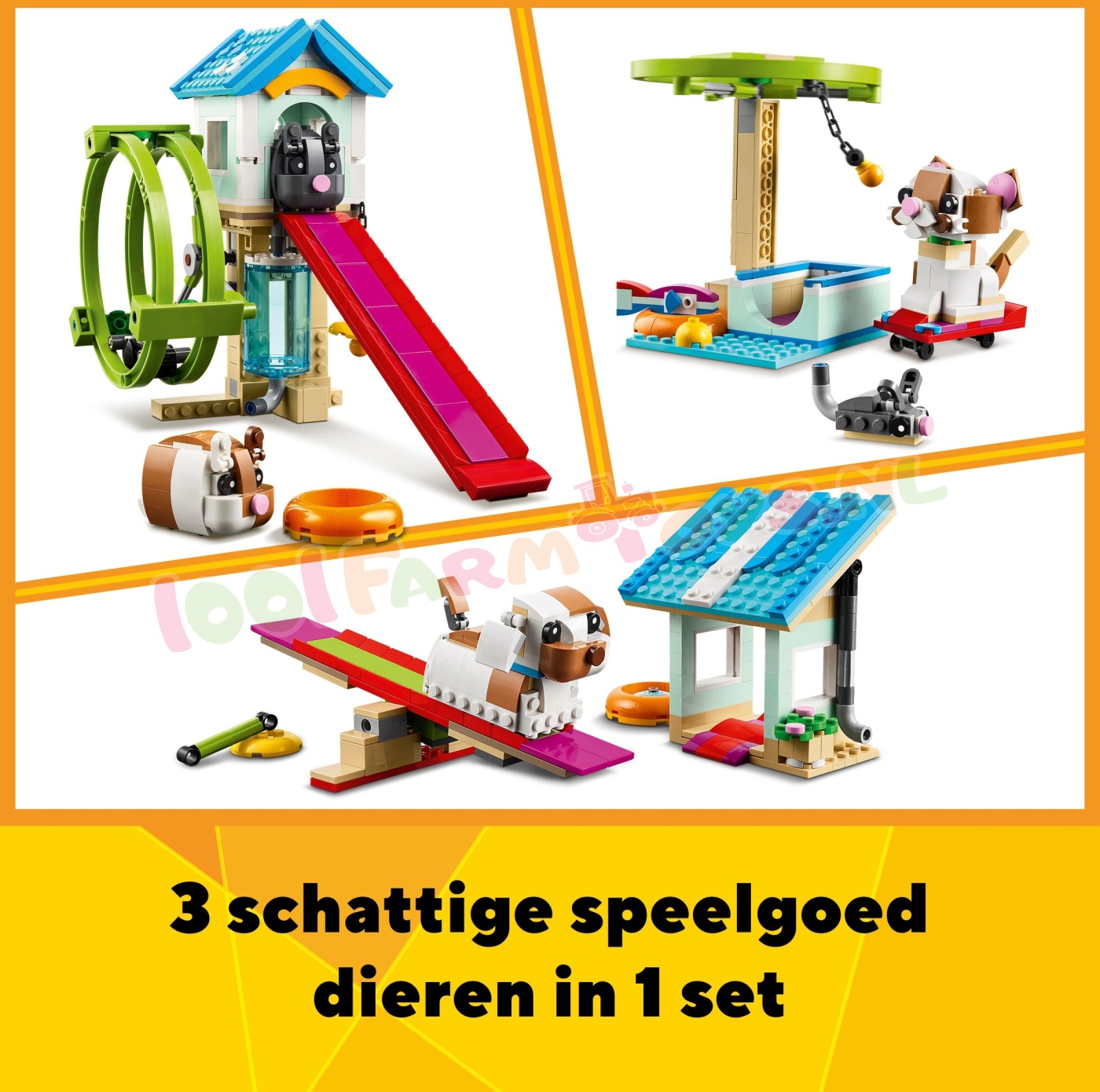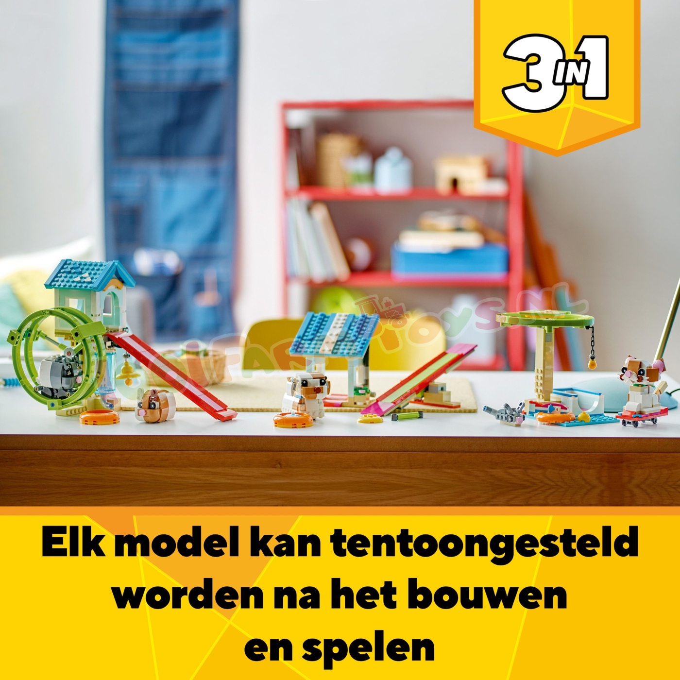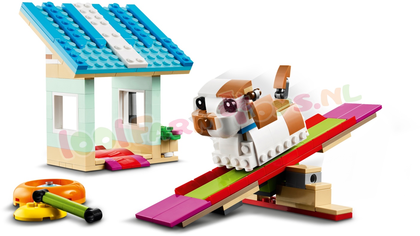 Jongens. meisjes en dierenvrienden vanaf 8 jaar kunnen leuke verhalen naspelen met deze schattige 3-in-1 Hamsterwiel (31155) dierenspeelset. Er is een interactief speelhuis waar een hamster in een draaiend wiel kan rennen en de andere van de glijbaan kan glijden. Inclusief accessoires. waaronder een watertank. autoband. hangende bel en voerbak.Met deze LEGO® Creator set kunnen kinderen 3 dierenmodellen bouwen met dezelfde stenen. Ze kunnen een speelhuis voor hamsters bouwen en ombouwen tot een speelruimte voor een kat met een draaiend wiel en een skateboard of tot een hondenhok waar een hondje van een helling af kan glijden en met cool speelgoed kan spelen.Creator 3in1 sets zijn leuke LEGO cadeaus voor kinderen met in elke doos 3 bouwmogelijkheden. Kinderen zullen de modellen graag bouwen. herbouwen en opnieuw bouwen. Ze kunnen zich urenlang vermaken met 3-in-1 sets die aansluiten op hun interesses. waaronder supersnelle voertuigen. geweldige dieren en gedetailleerde stadstaferelen. 3 dierenmodellen in 1 set – jongens en meisjes vanaf 8 jaar kunnen 3 mogelijke dierenmodellen bouwen en herbouwen met dezelfde set stenen in deze LEGO® Creator Hamsterwiel 3-in-1 speelgoedset Oneindige rollenspellen – kinderen genieten van verhalen met 3 verschillende dierenmodellen in deze LEGO® set: 2 hamsters en hun speelgoed. een kattenspeelplaats met een draaiend wiel of een hondenhok waar een hondje met zijn speelgoed speelt Verstelbare en interactieve kleine dierenmodellen – de speelgoedhamster kan in een draaiend wiel rennen. de kat heeft een verstelbare staart en oren en de LEGO® hond heeft ingebouwde wieltjes om van een helling af te zoeven Displaymodellen om mee te spelen – het interactieve hamsterspeelgoed en de 2 anderemodellen kunnen na de speelavonturen van kleine dierenvrienden op een plank of nachtkastje worden neergezet LEGO® cadeau – dit kleine Creator 3in1 hamsterspeelgoed voor kinderen biedt een leuke bouw- en speelervaring voor creatieve kinderen en kan cadeau worden gegeven voor een verjaardag of de feestdagen Meer 3-in-1 plezier – beleef nog meer 3-in-1 speelplezier met andere sets (apart verkrijgbaar) uit het LEGO® Creator assortiment. inclusief geweldige dieren. coole voertuigen en gedetailleerde stadstaferelen LEGO® Creator speelgoed – met elke 3-in-1 set kunnen kinderen 3 verschillende modellen bouwen. geïnspireerd op hun grootste passies. waaronder dieren. voertuigen en gedetailleerde stadsscènes Afmetingen – deze 416-delige LEGO® bouwset bevat een bouwbaar hamsterspeelhuis van ca. 19 cm hoog. 13 cm breed en 26 cm diep.