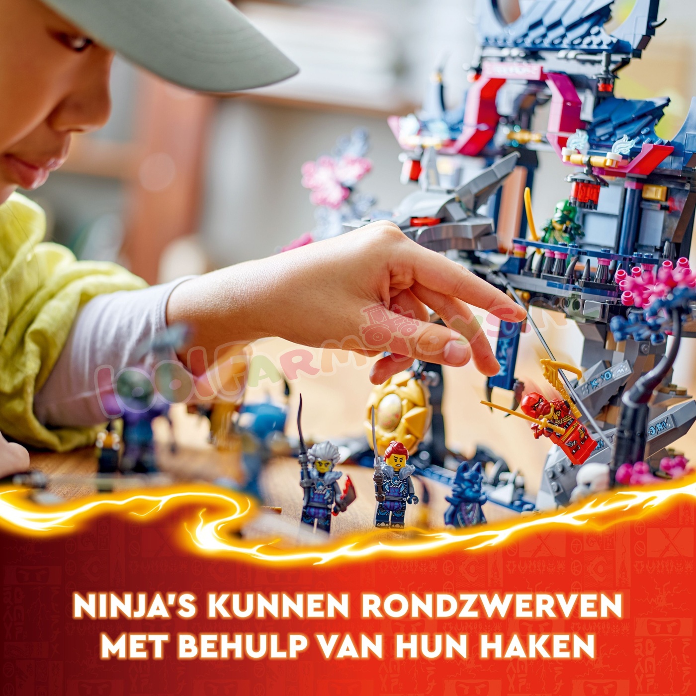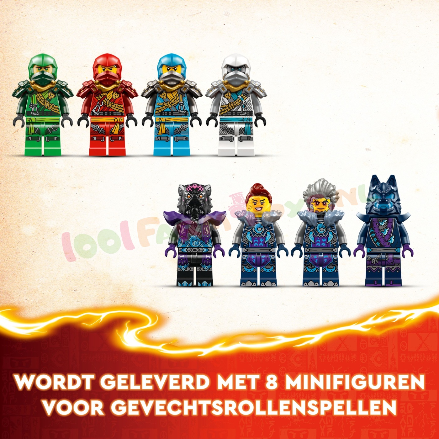 Jongens en meisjes vanaf 9 jaar kunnen spannende confrontaties uit seizoen 2 van de tv-serie NINJAGO® Dragons Rising naspelen met de Wolvenmasker schaduwdojo (71813) set. Dit prachtige ninjaspeelgoed zit vol interactieve kenmerken en functies vooruren speeltijd.De dojobouwset met 2 verdiepingen bevat een binnenplaats waar personages vliegende duels kunnen aangaan op het uiteinde van beweegbare transparante stokken. een val die wordt geactiveerd door een boomtak. een geheime deur met daarachter een zwaard. een boom met een ketting voor gevangenen. een wapenrek met 4 accessoires. kabels waaraan de ninja's met hun haak kunnen zoeven. een wolvenkop die een grote steen laat vallen. de bloedmaan en de Gong van Verbrijzeling.Het bouwmodel isinclusief 8 minifiguren van NINJAGO personages: Klimmer Kai. Klimmer Lloyd. Klimmer Nya en Klimmer Zane. die allemaal een klimhaak en katana-accessoire hebben. de schurken Lord Ras. Jordana en Cinder met zwaarden en een gemene Wolvenmasker klauwstrijde r. Dojoset boordevol actie – jongens en meisjes vanaf 9 jaar kunnen confrontaties en actiescènes uit seizoen 2 van de tv-serie NINJAGO® Dragons Rising naspelen met de Wolvenmasker schaduwdojo Interactieve ninjaspeelset – inclusief een binnenplaatswaar personages kunnen strijden op beweegbare transparante stokken. een val die wordt geactiveerd door een boomtak en kabels waar de ninja's aan kunnen glijden met hun haken Bouwset van een dojo boordevol functies – er is ook een geheime deur met daarachter een zwaard. een boom met een ketting. een boom met een helling. een wapenrek en een wolvenkop die een grote steen laat vallen 8 NINJAGO® minifiguren – dit ninjaspeelgoed bevat Klimmer Kai. Klimmer Lloyd. Klimmer Nya en Klimmer Zane die de strijd aangaan met de schurken Lord Ras. Jordana en Cinder en een gemene Wolvenmasker klauwstrijder Ninjacadeau – dit actiespeelgoed biedt een leuke bouw- en speelervaring en is een mooi verjaardagscadeau voor jongens en meisjes vanaf 9 jaar met een passie voor ninja-actie en zelfstandig spelen Een helpende hand – ontdek intuïtieve bouwinstructies in de LEGO® Builder app waarmee bouwers kunnen inzoomen en hun model kunnen draaien in 3D. hun voortgang kunnen bijhouden en sets kunnen opslaan terwijl ze nieuwe vaardigheden ontwikkelen Grotere ninja-avonturen – kijk uit naar meer NINJAGO® speelgoed (sets apart verkrijgbaar) met draken. mecha en altaars Afmetingen – deze NINJAGO® dojo met 1190 onderdelen is ca. 36 cm hoog. 45 cm breed en 21 cmdiep.