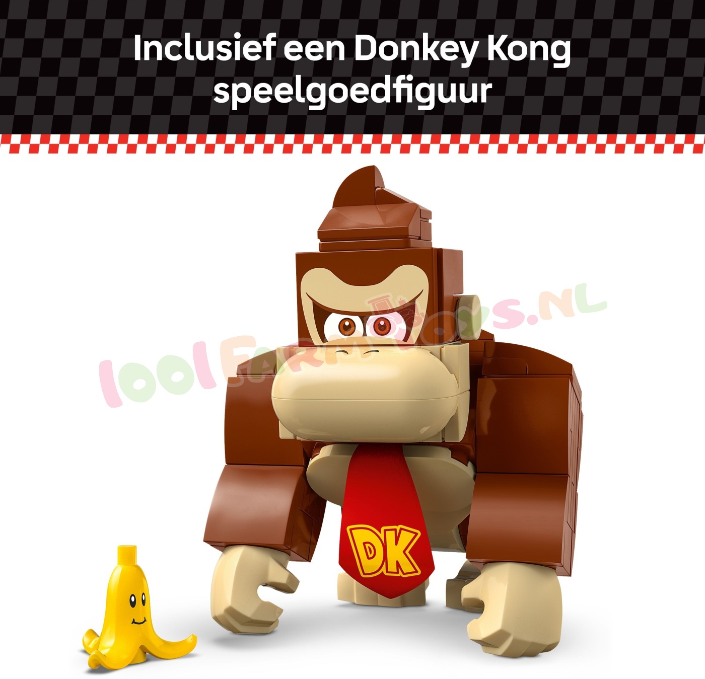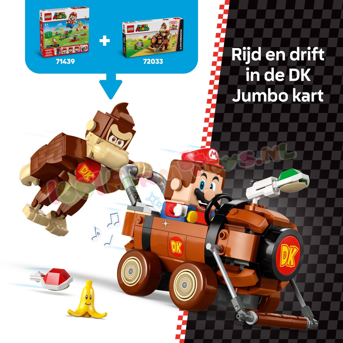 U kunt uw bestelling natuurlijk ook afhalen bij ons in de winkel in Beesd. klik dan op afhalen.Ga mee met Donkey Kong voor Mario Kart™ race-avonturen met deze Nintendo® speelset voor kinderen om te verzamelen (72033). De set is een fantastisch LEGO® Super Mario™ verjaardagscadeau voor jongens. meisjes en gamers vanaf 8 jaar en bevat een bouwbaar DK Jumbo speelgoedvoertuig. een Donkey Kong speelgoedfiguur en een doelwit. plus een banaan met een gezichtje. Help Donkey Kong de DK Jumbo te besturen en het doel te raken door schilden uit de kart te lanceren om de banaan eraf te gooien.Rijd in de DK Jumbo met een LEGO® Mario™. LEGO® Luigi™ of LEGO® Peach™ figuur (uit set 71439. 71440 of 71441 – apart verkrijgbaar) voor interactief speelplezier. waaronder Donkey Kong™ gamegeluiden en visuele effecten. plus Mario Kart geluiden voor het starten van de race. toeteren. driften en meer.Je vindt de bouwinstructies voor deze Nintendo set in de doos en in de LEGO Super Mario app. Breid het plezier uit met andere coole voertuigen en bekende personages uit de serie (sets apart verkrijgbaar). Leuke Nintendo® verzamelset – race en richt op het doel met Donkey Kong op zijn DK Jumbo met deze LEGO® Super Mario™: Mario Kart™ set Donkey Kong speelgoedfiguur voor rollenspellen – deze avontuurlijke speelset bevat een Donkey Kong figuur en een banaan met een gezichtje Mario Kart™ speelgoedvoertuig – zet Donkey Kong op zijn DK Jumbo kart. rijd en drift en lanceer schilden naar het doelwit om de banaan eraf te gooien Interactief digitaal speelplezier – bestuur de DK Jumbo met LEGO® Mario™. LEGO® Luigi™ of LEGO® Peach™ (figuren niet inbegrepen) om geluiden en visuele effecten uit de Donkey Kong™ game te activeren. plus andere Mario Kart™ geluiden Nintendo® verjaardagscadeau voor kinderen – geef deze LEGO® Super Mario™ speelset cadeau aan jongens. meisjes en gamers vanaf 8 jaar; een van de sets 71439. 71440 of 71441 (apart verkrijgbaar) is vereist voor interactief spelen Extra speelmogelijkheden – bekijk het volledige assortiment LEGO® Super Mario™: Mario Kart™ sets (apart verkrijgbaar) en ontdek andere bouwbare Mario Kart speelgoedvoertuigen en personages om tegen te racen Inspireer de creativiteit van kinderen – LEGO® Super Mario™ speelsets staan voor rollenspel. digitaal munten verzamelen en creatieve uitdagingen doordat ze uit te breiden en om te bouwen zijn. Ze zijn ideaal om alleen of juist samen mee te spelen Afmetingen – de bouwbare speelgoedauto in deze set met 387 onderdelen is ca. 8 cm hoog. 15 cm lang en 7 cm breed.