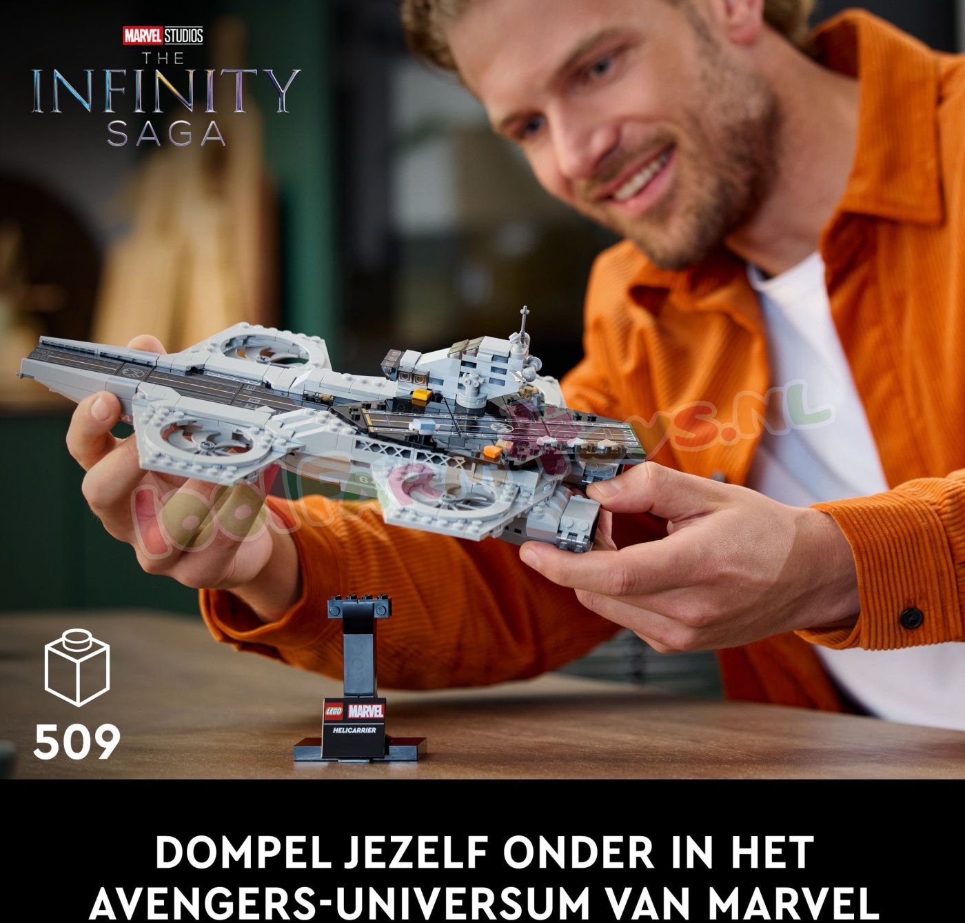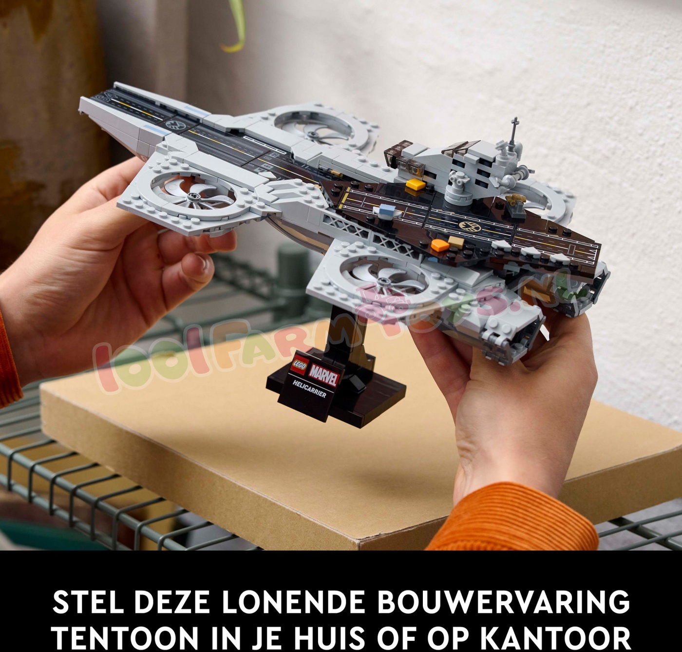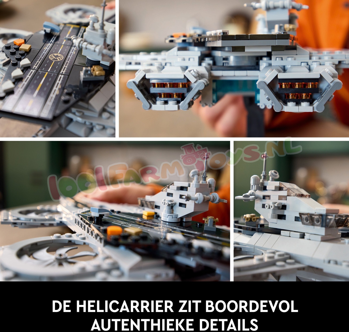 LEGO® Marvel De Avengers Helicarrier (76295) is een bouwbare versie van het bekende Avengers vliegtuig uit de populaire films The Avengers en Avengers: Age of Ultron van Marvel Studios. Dit vliegtuig voor volwassen fans met 509 onderdelen en een stevige basis is een opvallend displaymodel voor thuis of op kantoor.Deze bouwbare superheldenset voor volwassen fans is een nauwkeurige replica van het Marvel vliegtuig vol geweldige details. Op de landingsbaan zijn Quinjets zichtbaar. wat wijst op het functionele gebruik van dit Avengers vliegtuig. De ontspannende en boeiende bouwervaring wordt nog leuker met een digitale versie van de bouwinstructies van de set. die je kunt vinden in de LEGO Builder app. LEGO® Marvel cadeau voor volwassenen verzamelaars – dit bouwbare LEGO Marvel vliegtuigmodel is ontworpen voor volwassen fans van superheldenfilms en ervaren modelbouwers LEGO® Marvel Avengers vliegtuig – met 509 onderdelen en een lengte van ca.33 cm biedt dit bouwbare vliegtuig modelbouwers een ontspannende en boeiende bouwervaring Laat je passie zien – het LEGO® Marvel vliegtuig is inclusief een stevige basis. waardoor je het bouwbare model eenvoudig kunt omtoveren tot een fraaie blikvanger Bouwbaar Marvel model – als je het niet kunt laten om met het voltooide model te spelen. kan de standaard worden losgemaakt zodat je de Helicarrier van dichtbij kunt bekijken Cadeau voor volwassen fans van superhelden – deze verrassing voor liefhebbers van Marvel films is een cadeautip voor papa. mama of andere volwassenen. inclusief jezelf Hoogwaardige bouwinstructies – naast een stapsgewijze handleiding voor het bouwen van het model bevatten de rijk geïllustreerde instructies ontwerpdetails en feitjes over de Avengers Helicarrier Meer bouwsets voor volwassenen – dit bouwbare model maakt deel uit van de collectie LEGO® sets voor volwassenen. ontworpen om elke liefhebber van bouwmodellen een boeiende en ontspannende bouwervaring tebieden Leuk om te bouwen. leuk om neer te zetten – de voltooide set bestaat uit 509 onderdelen en is ca. 18 cm hoog. 33 cm lang en 22 cm breed.